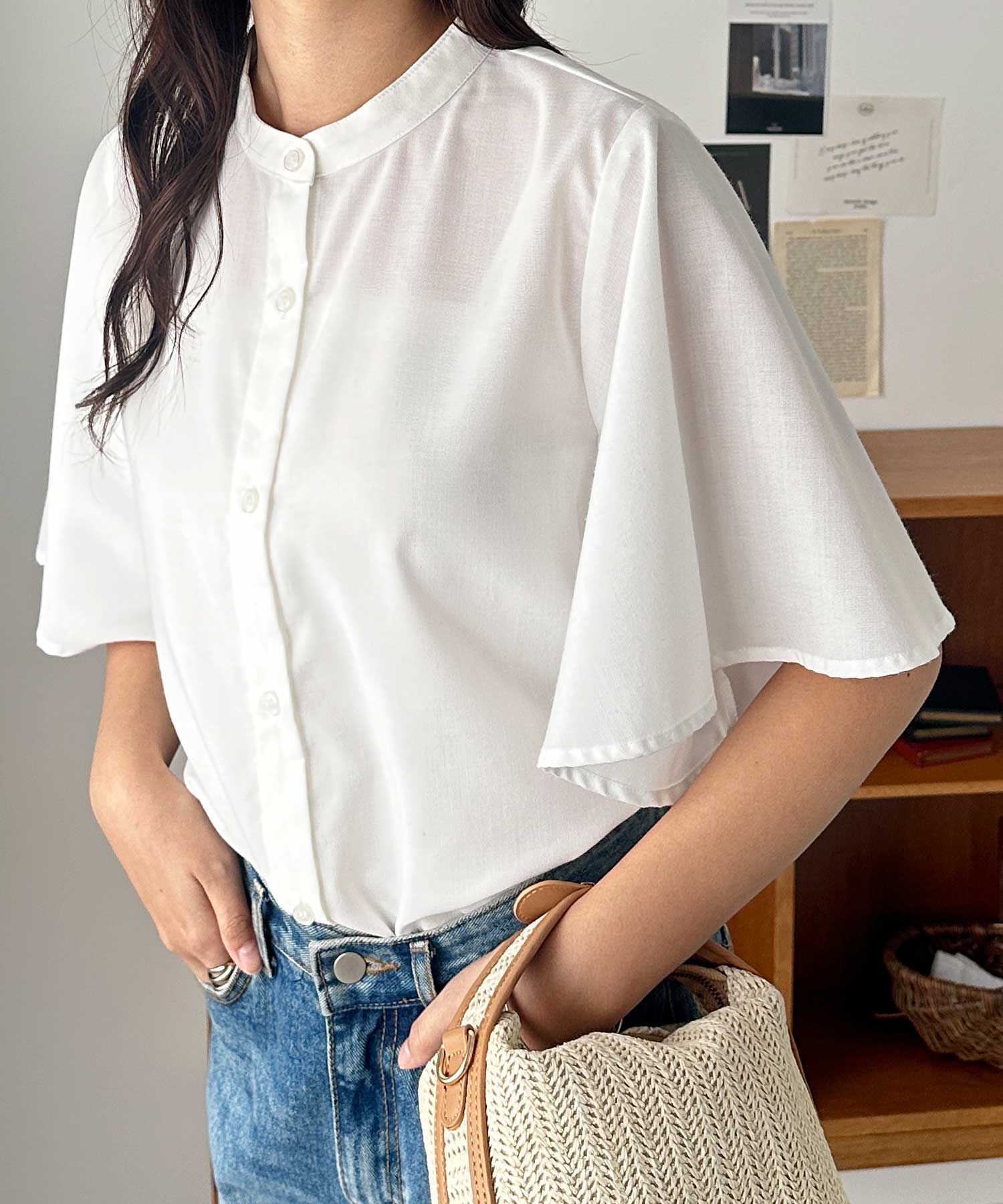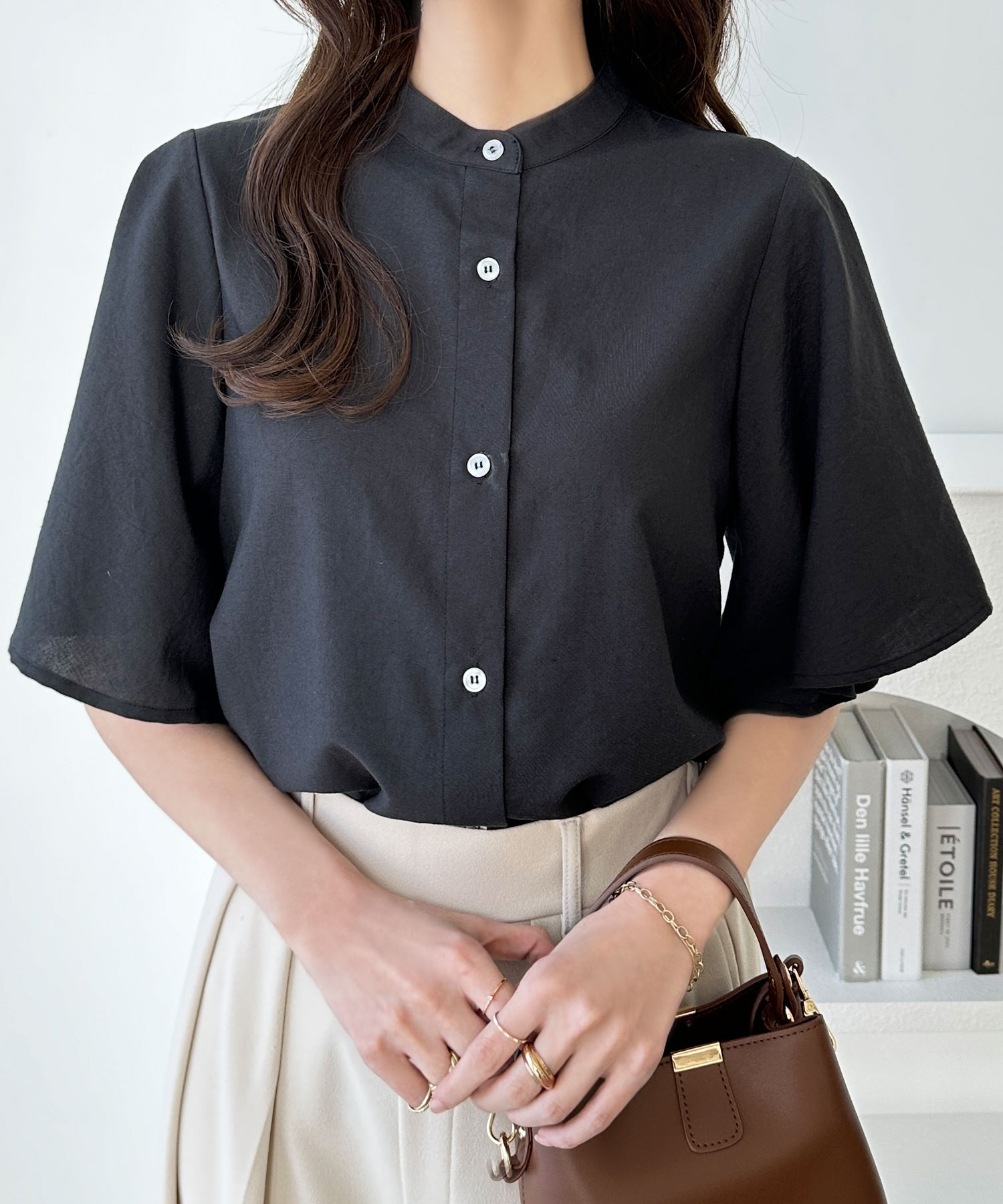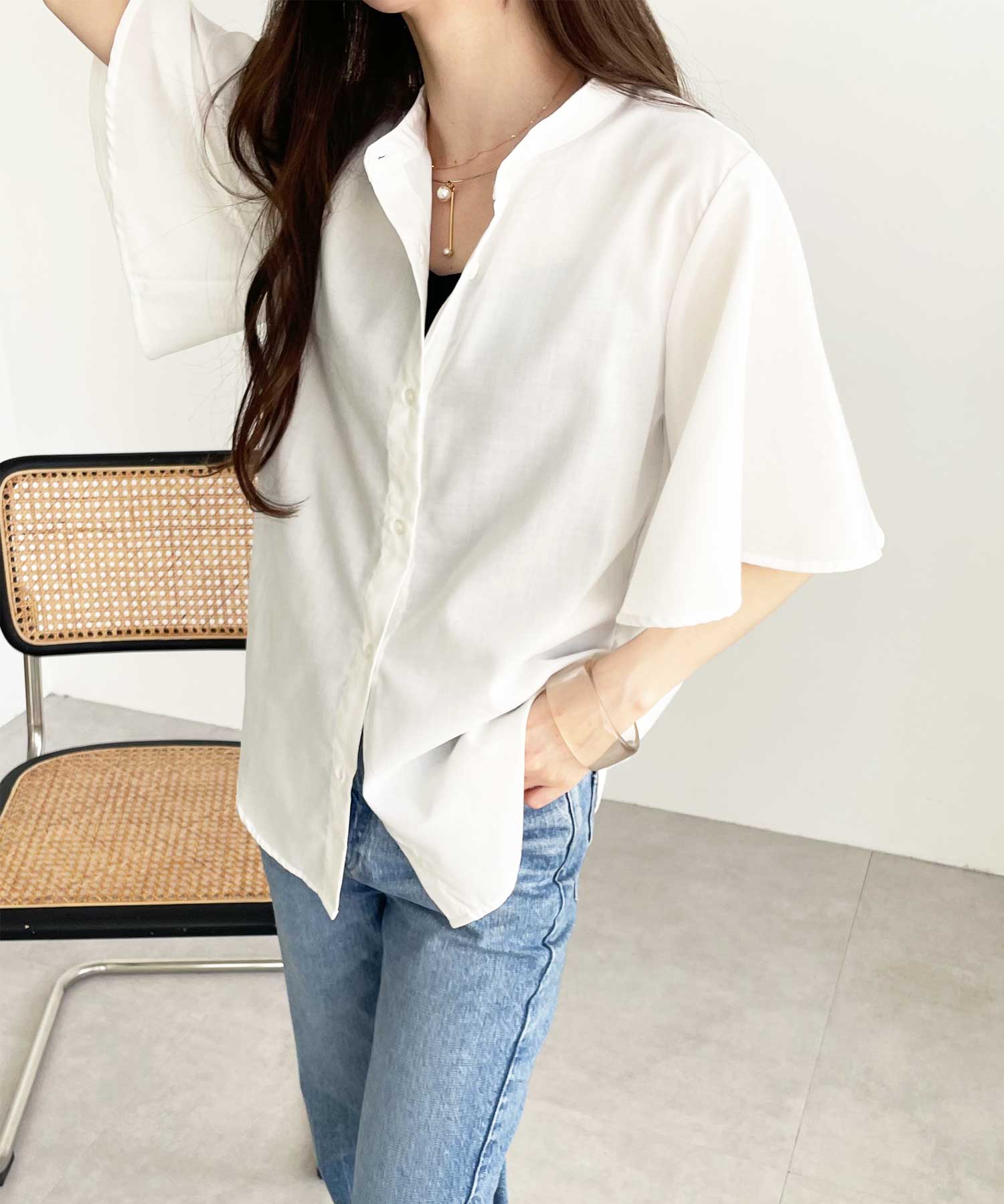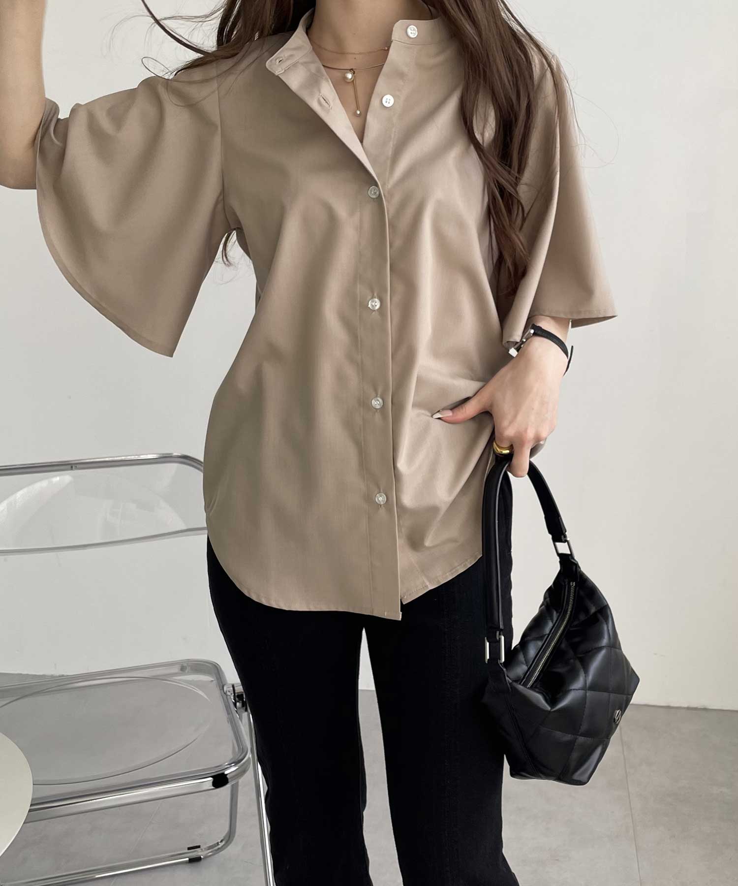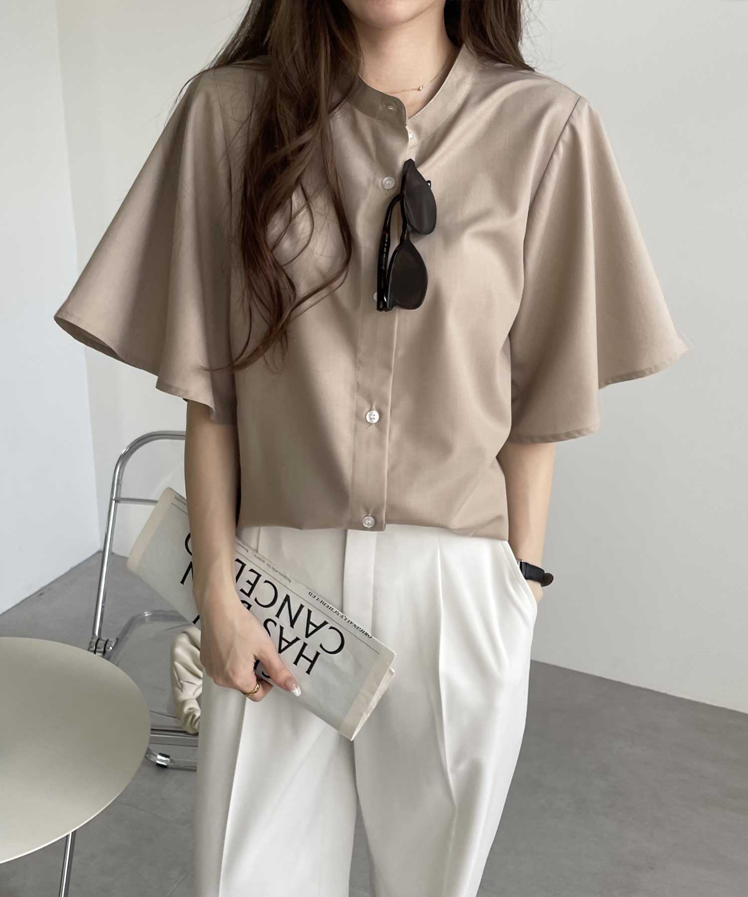 きちんと感のあるバンドカラーと、ふんわりと上品に広がるフレアースリーブが