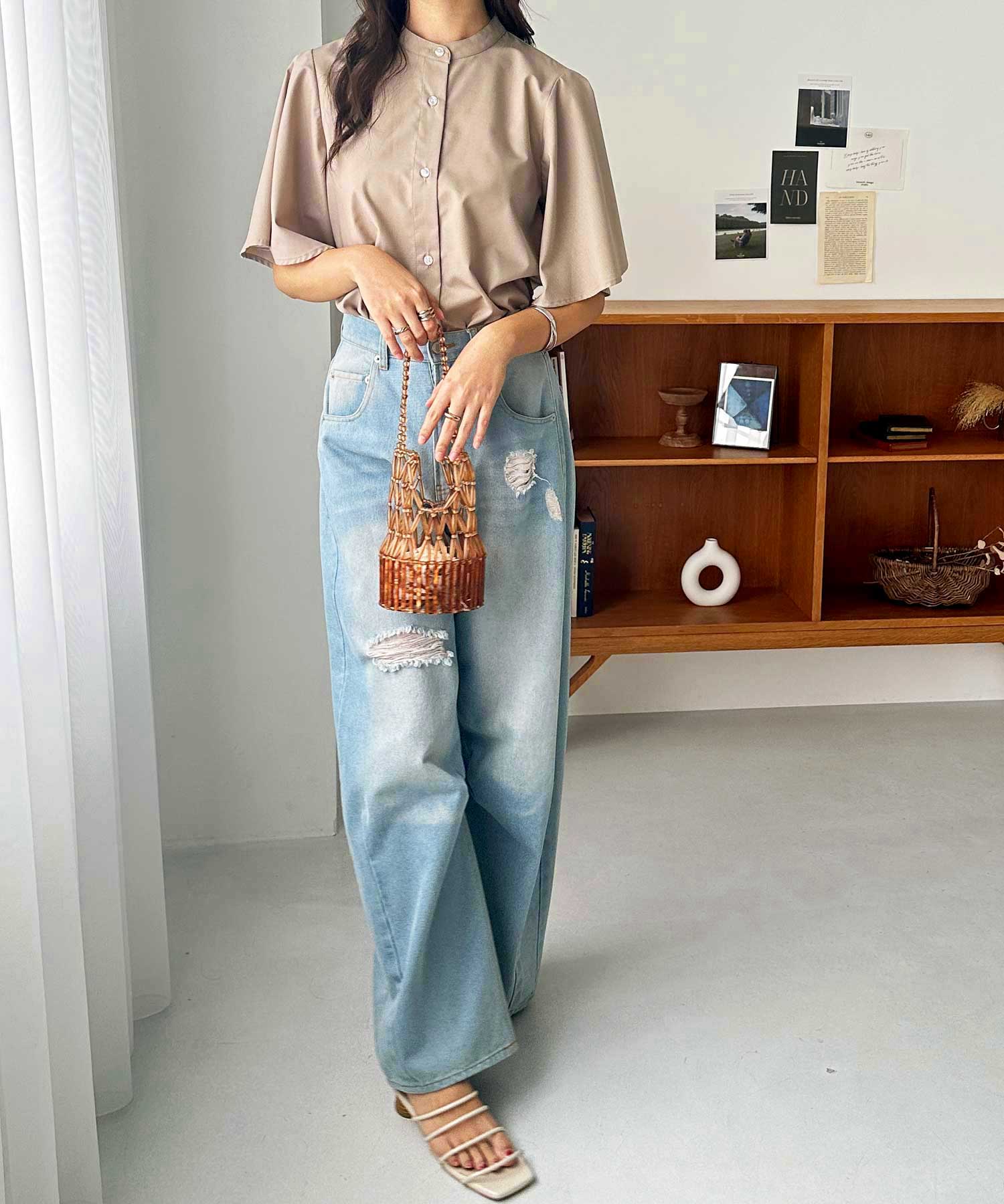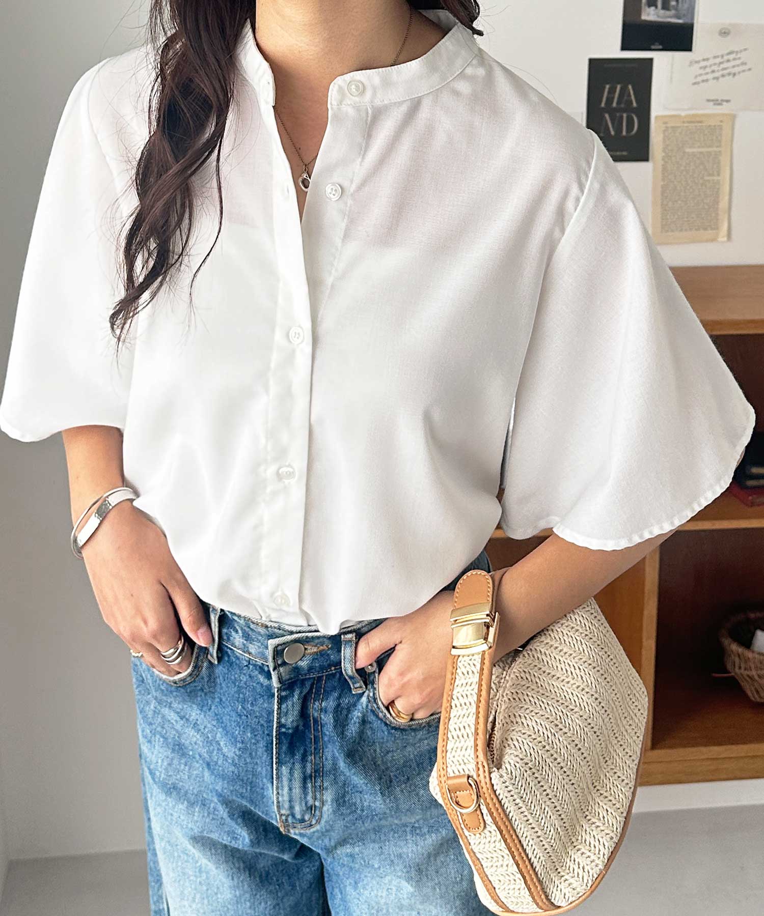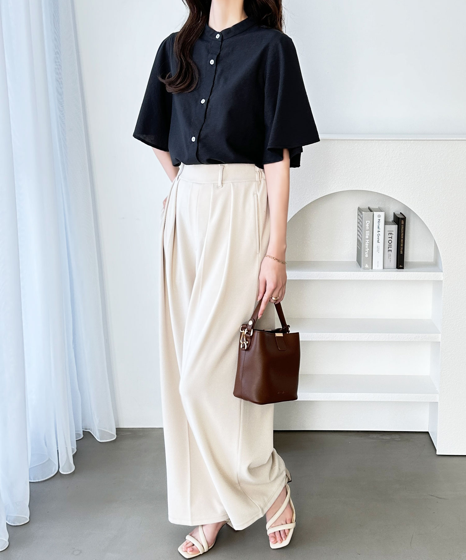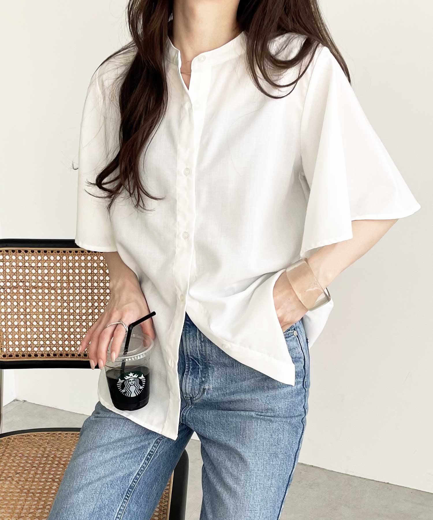 きちんと感のあるバンドカラーと、ふんわりと上品に広がるフレアースリーブが
