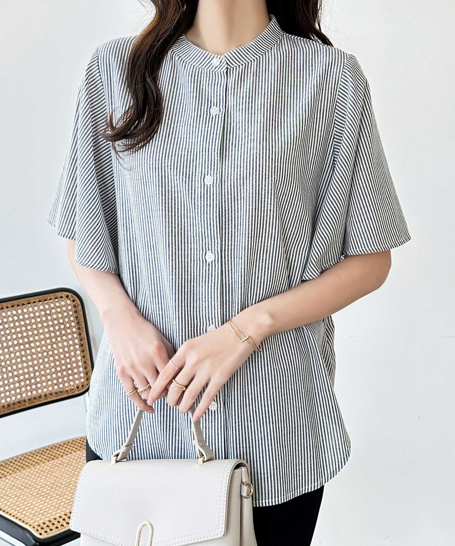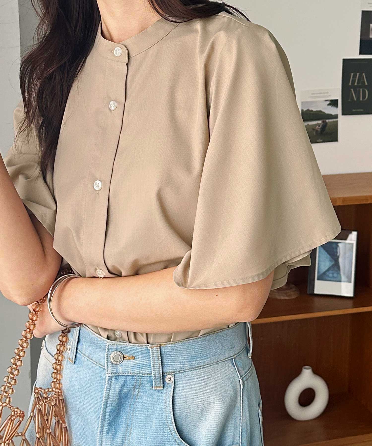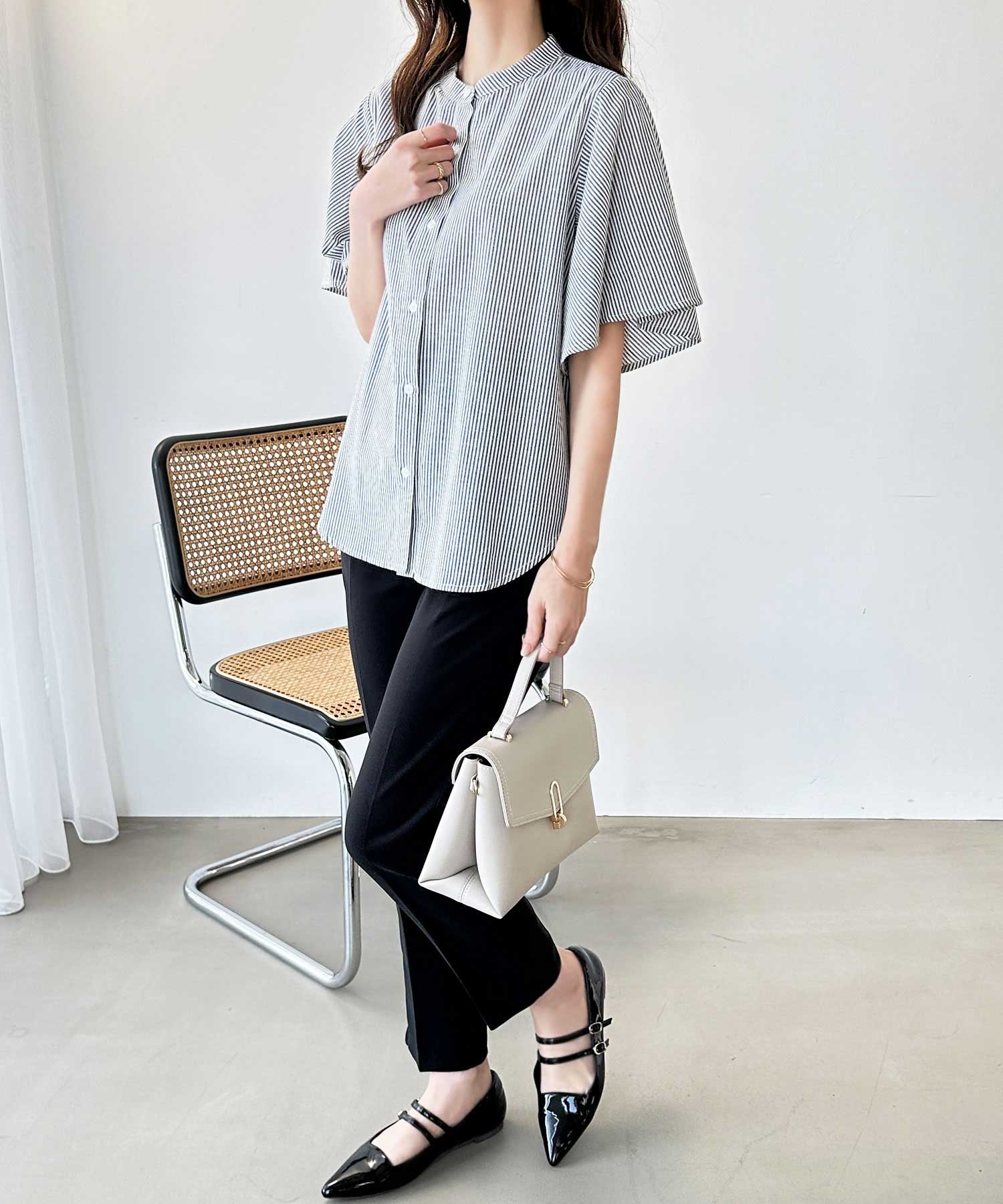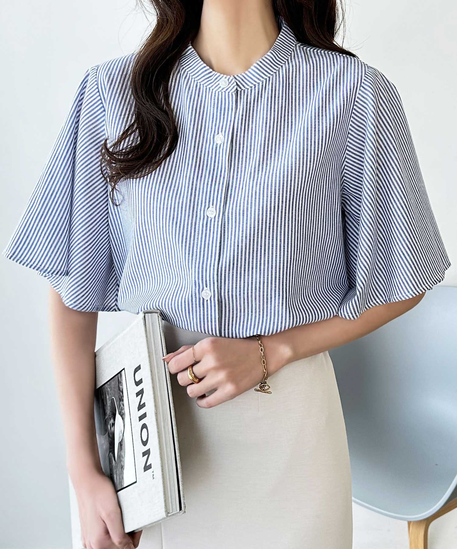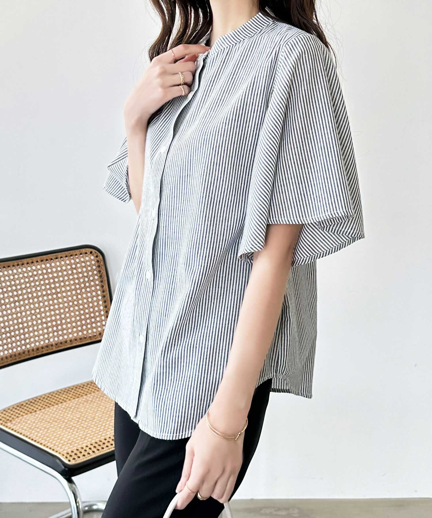 無地/ストライプ フレアー袖バンドカラーシャツブラウス
