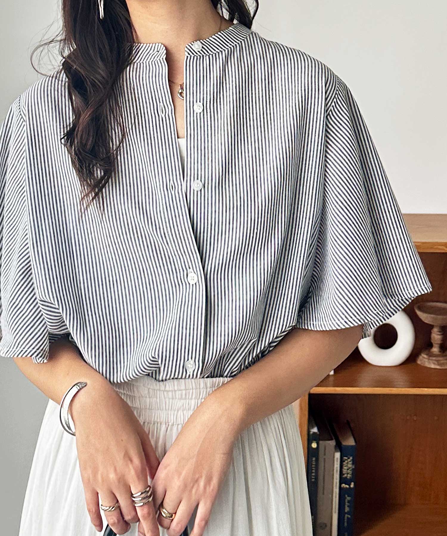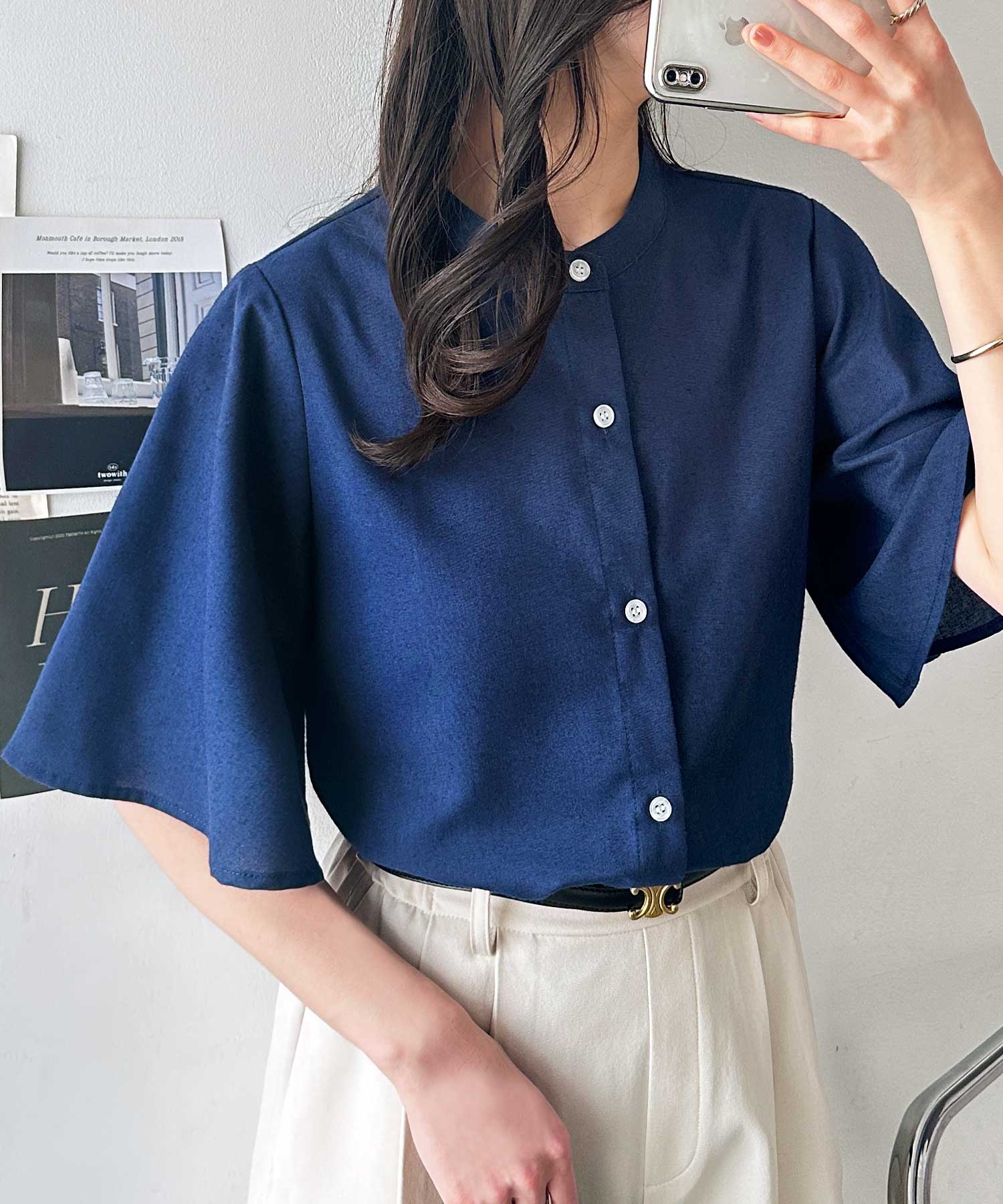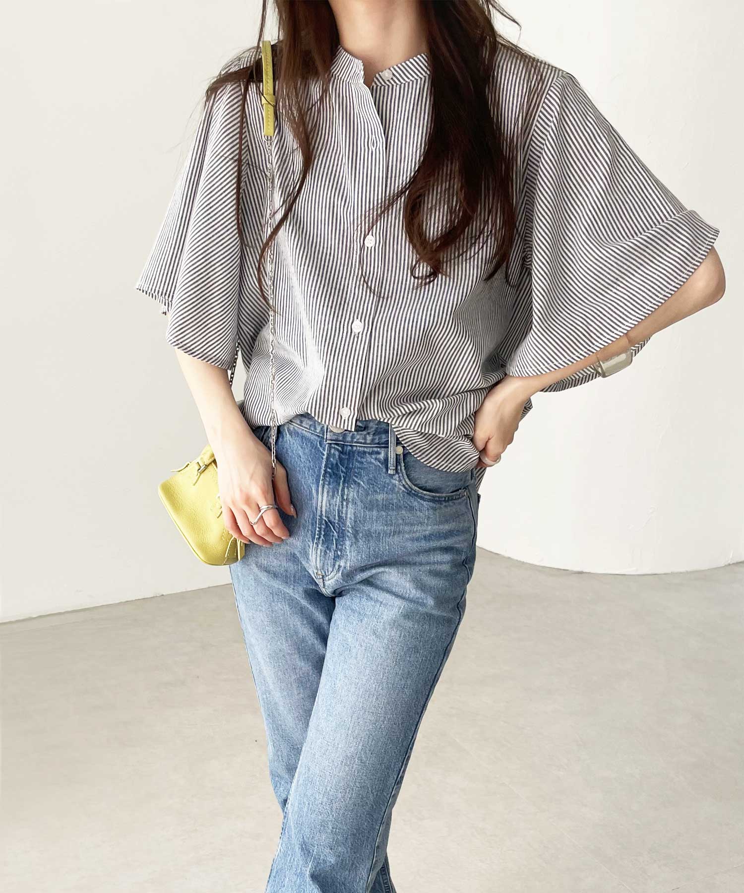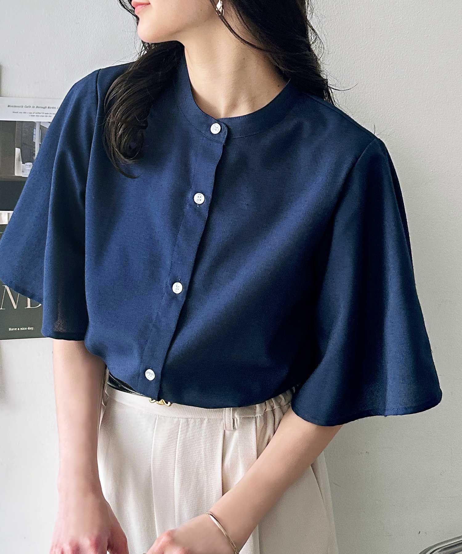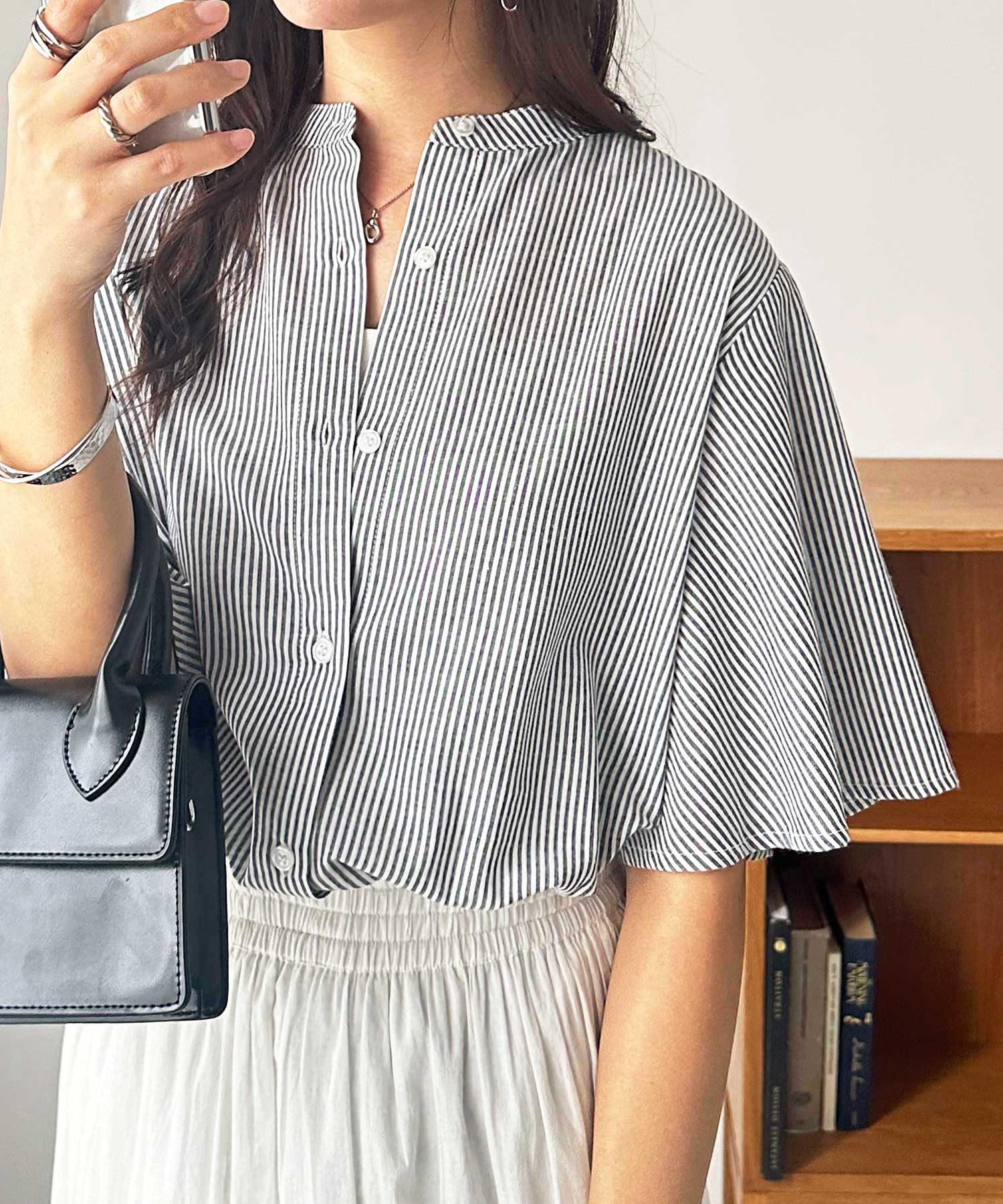 無地/ストライプ フレアー袖バンドカラーシャツブラウス