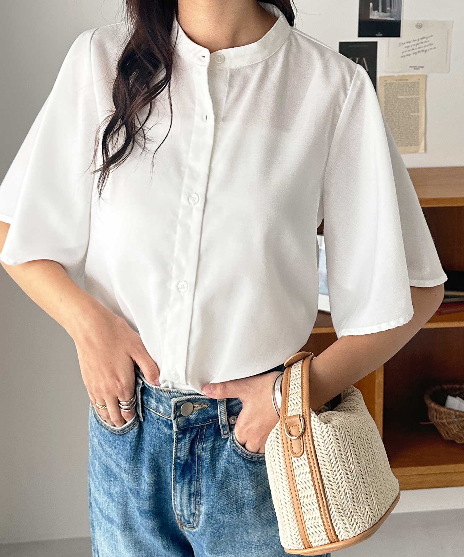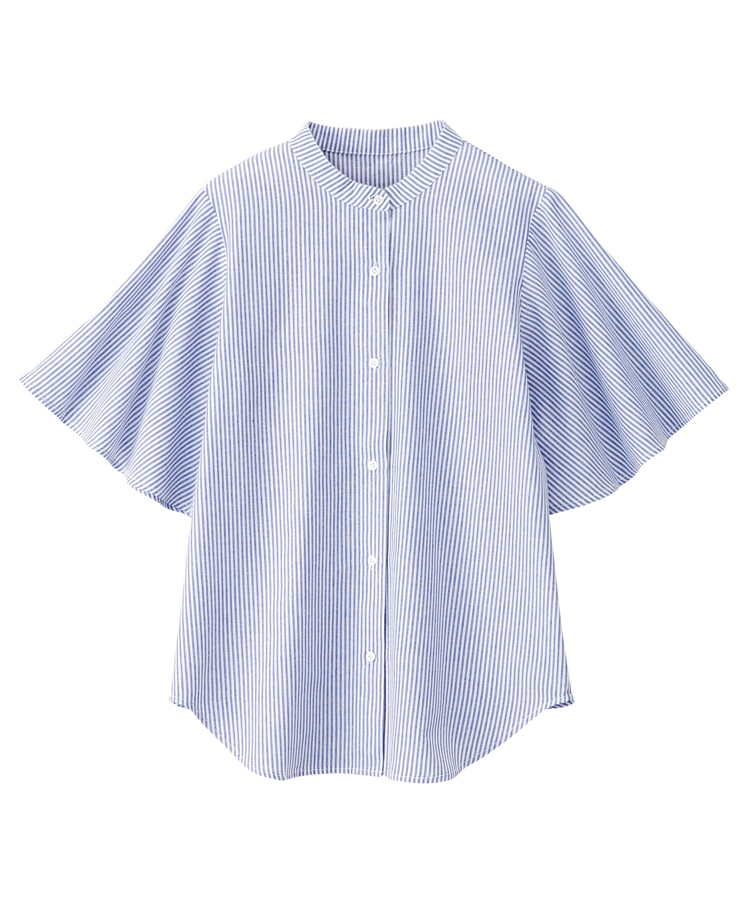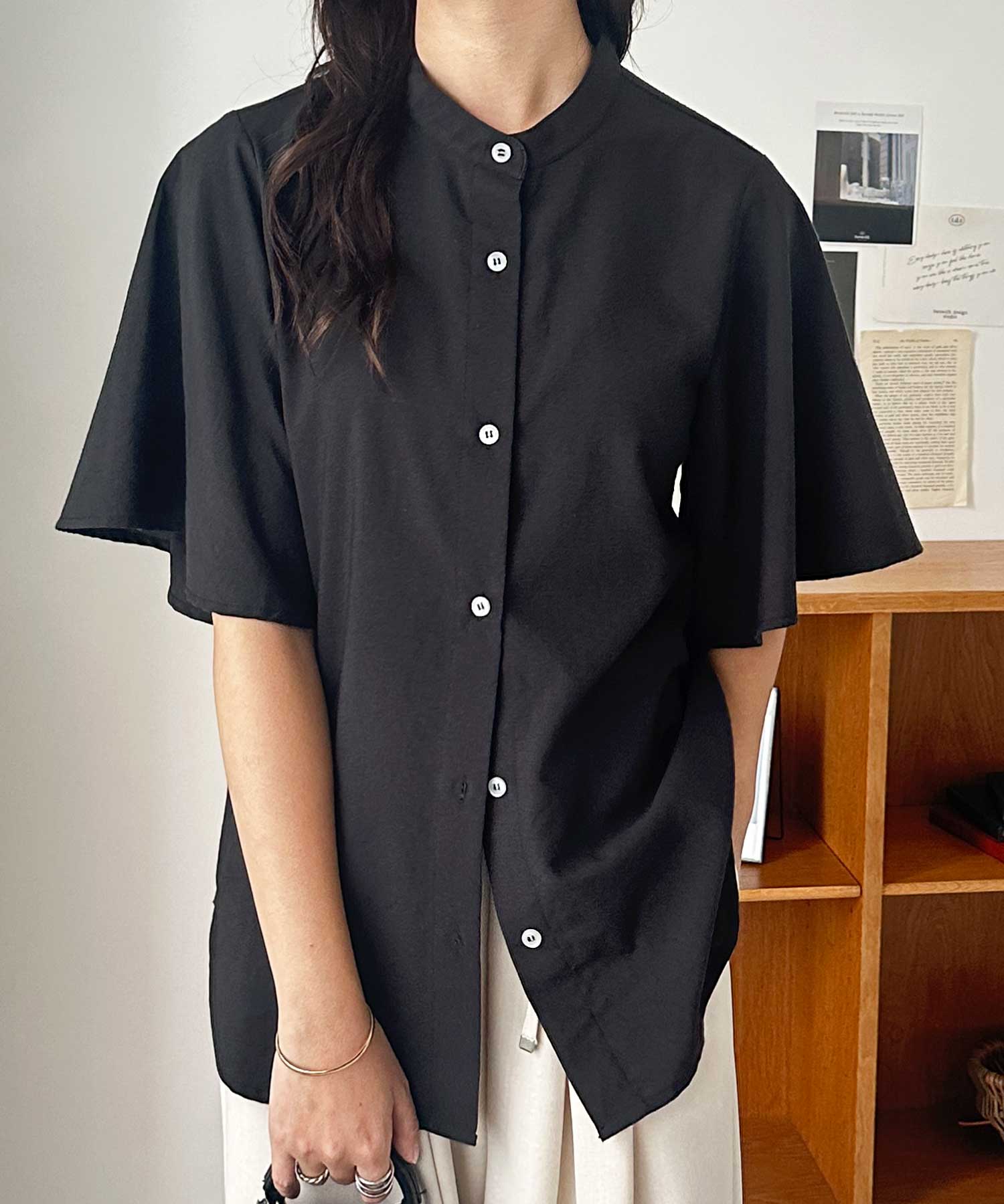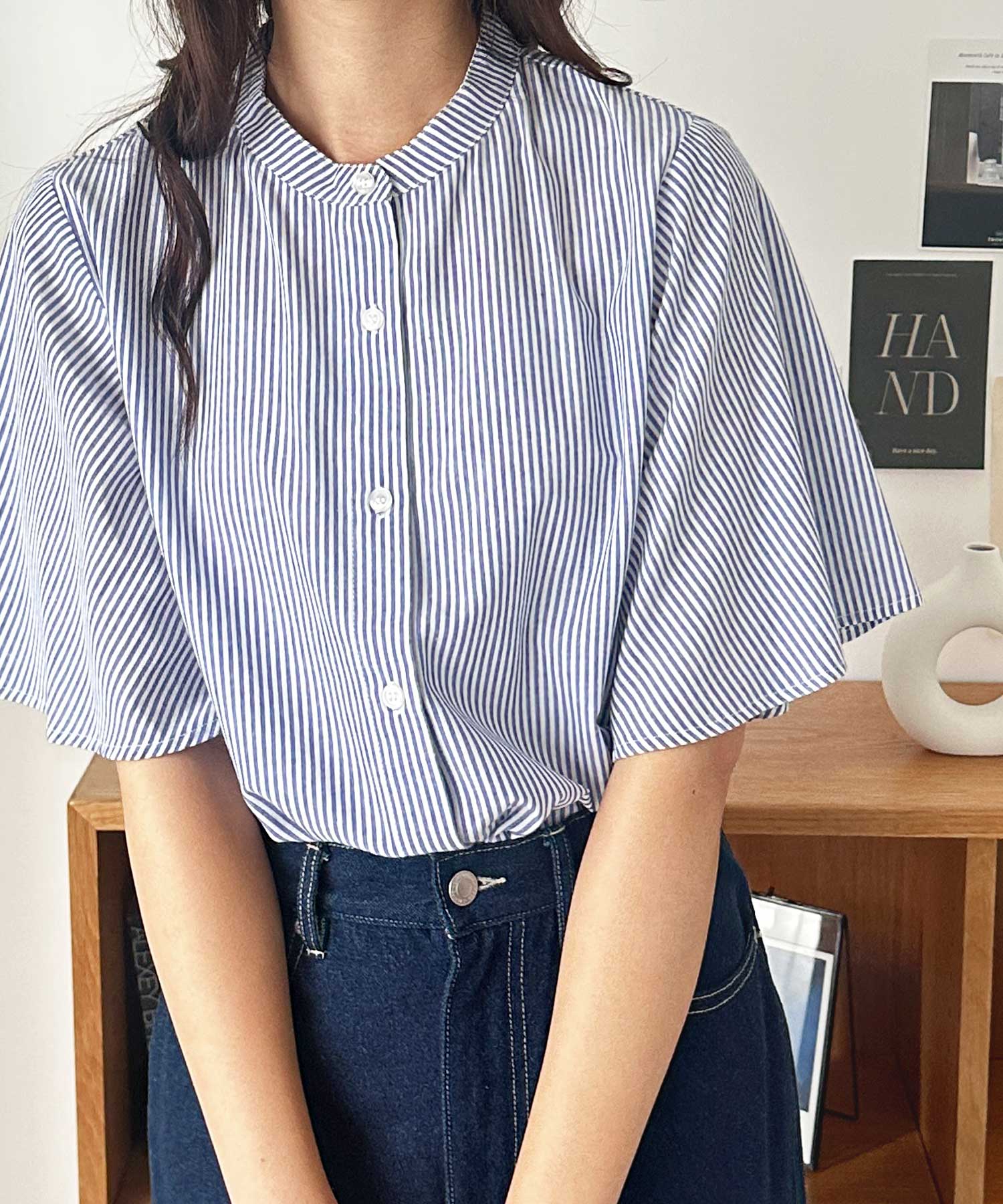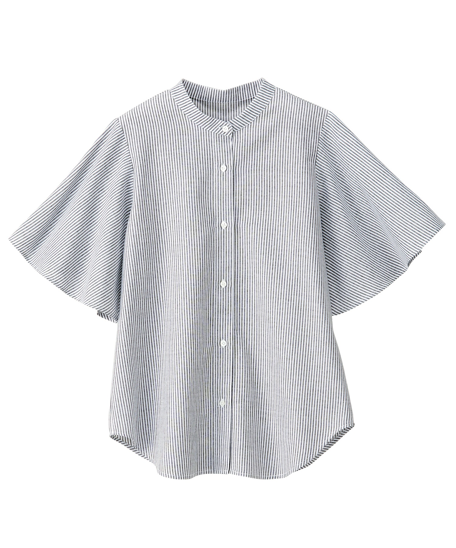 無地/ストライプ フレアー袖バンドカラーシャツブラウス