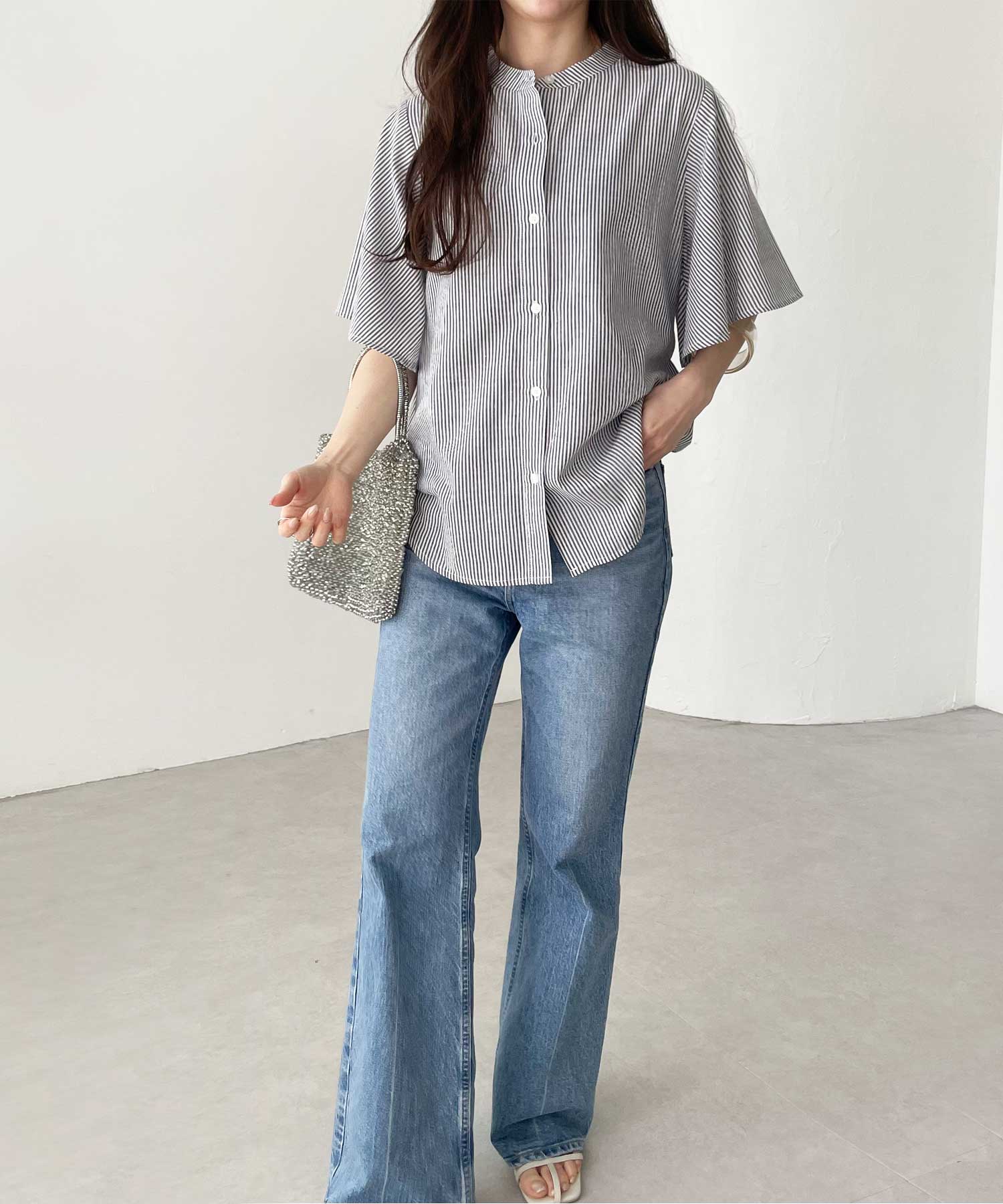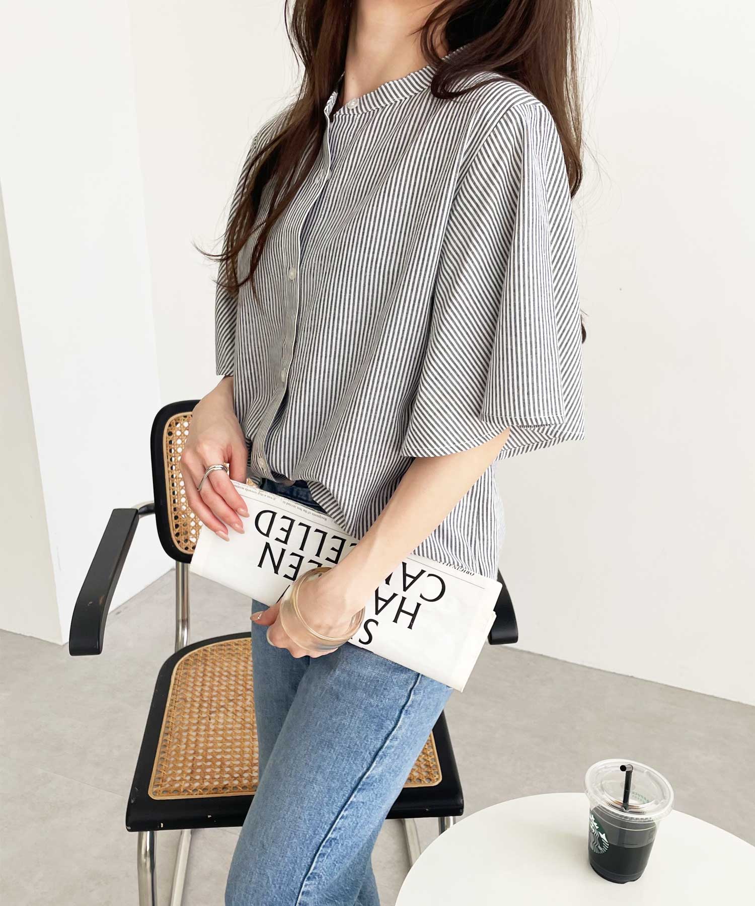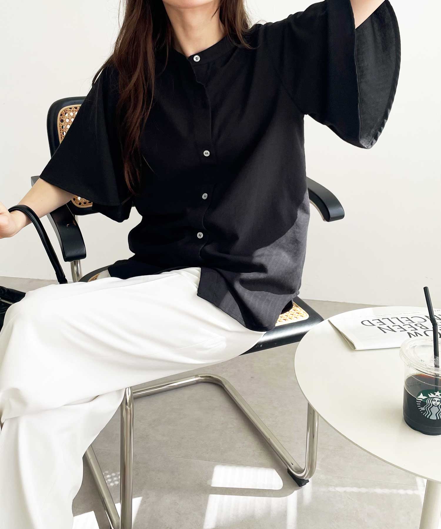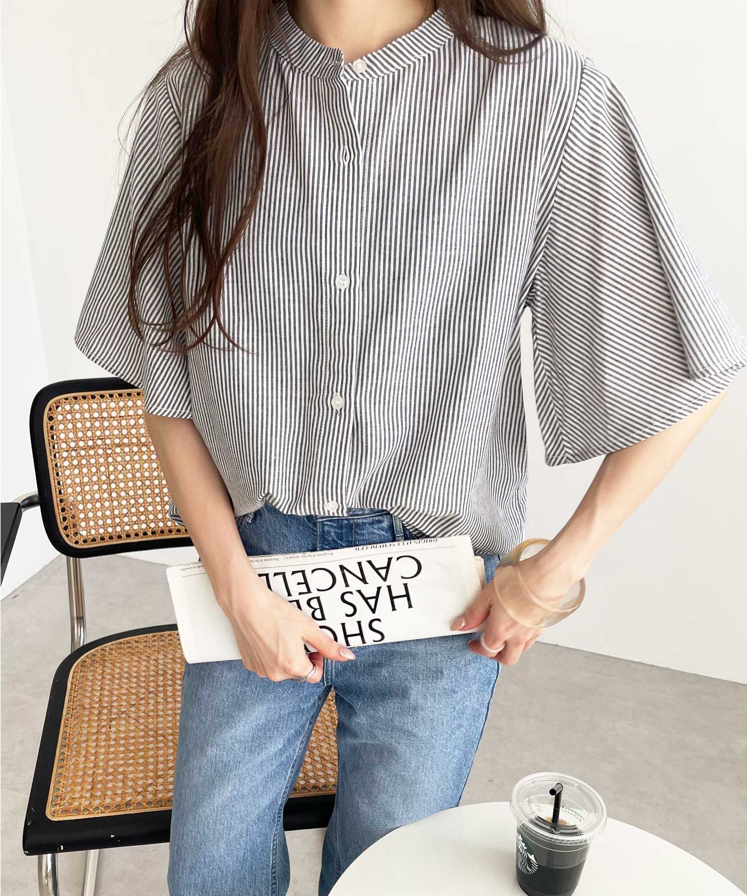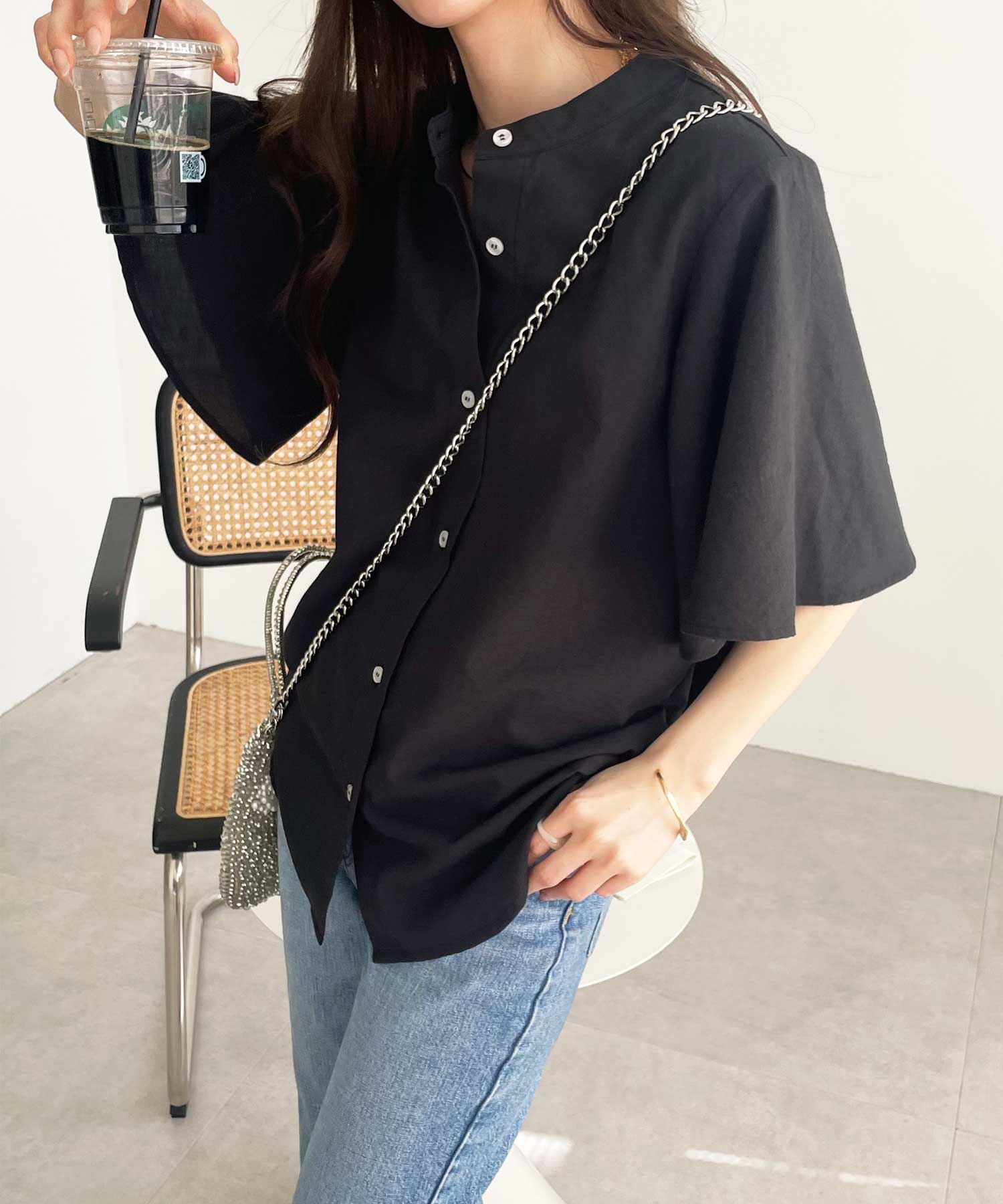 無地/ストライプ フレアー袖バンドカラーシャツブラウス