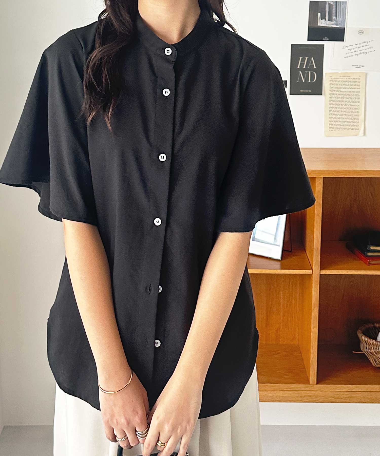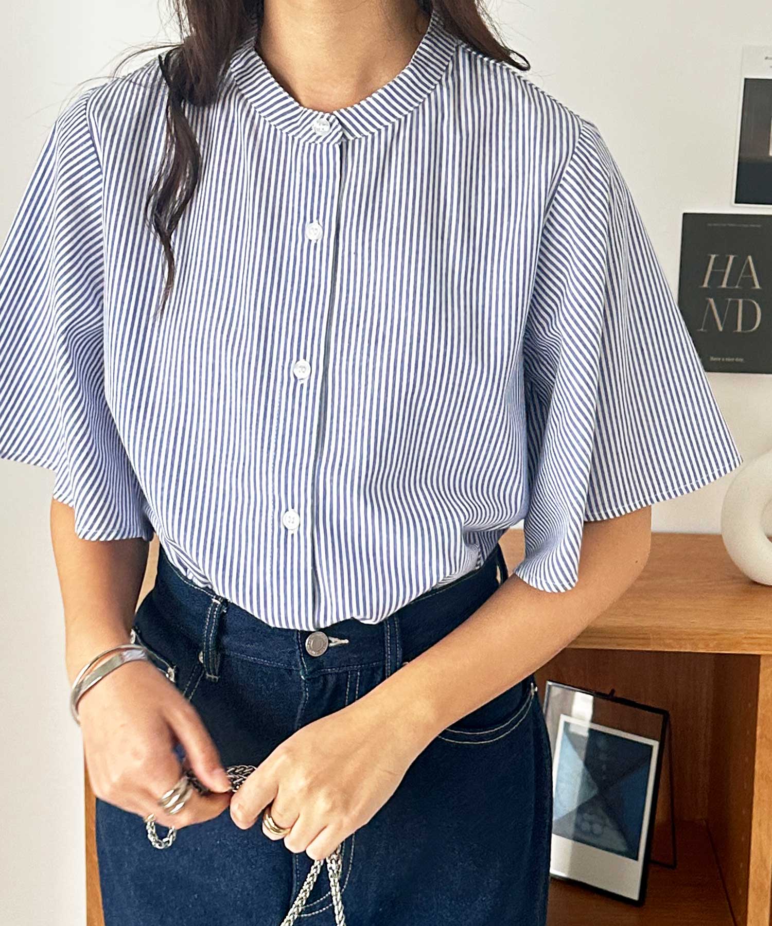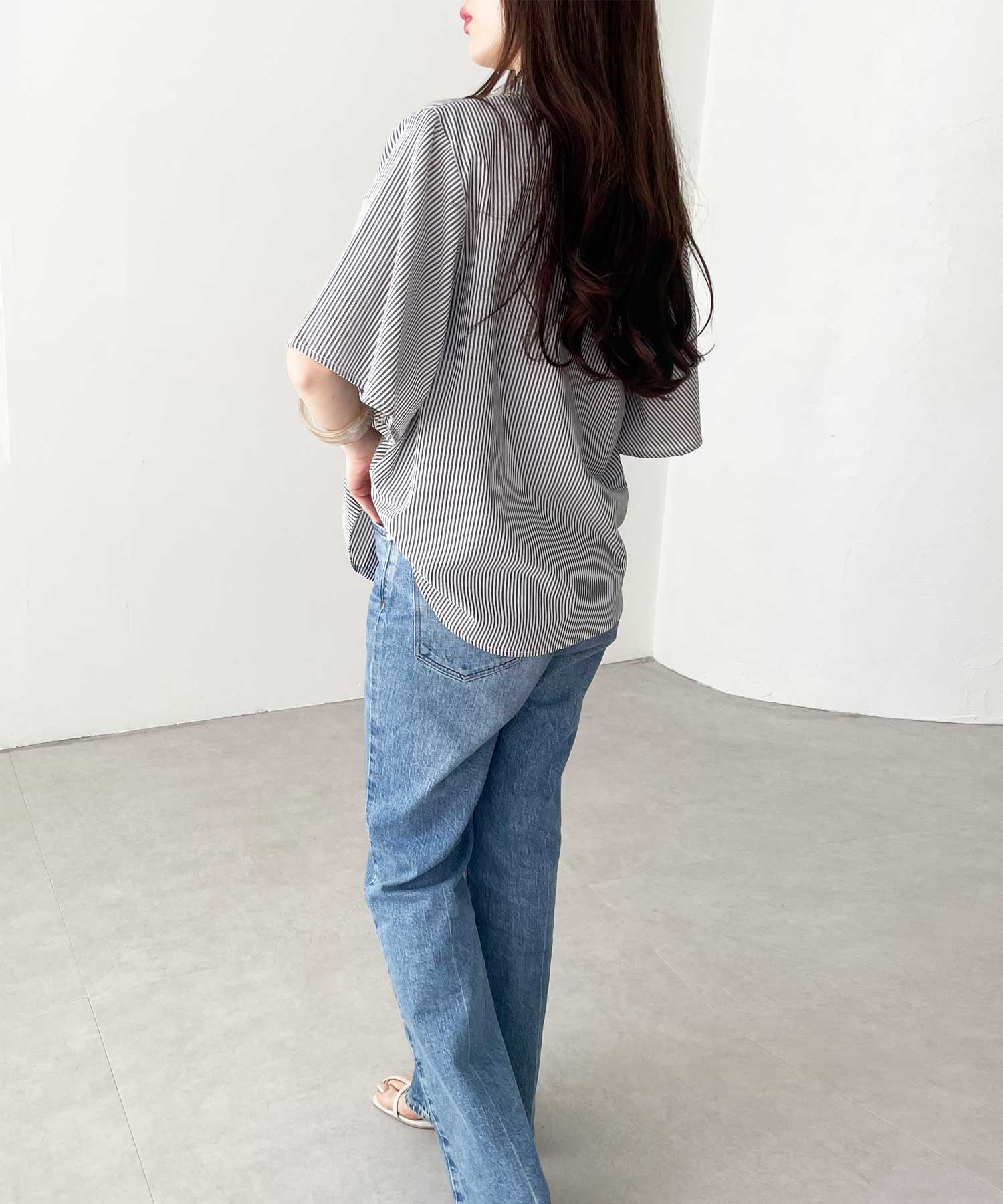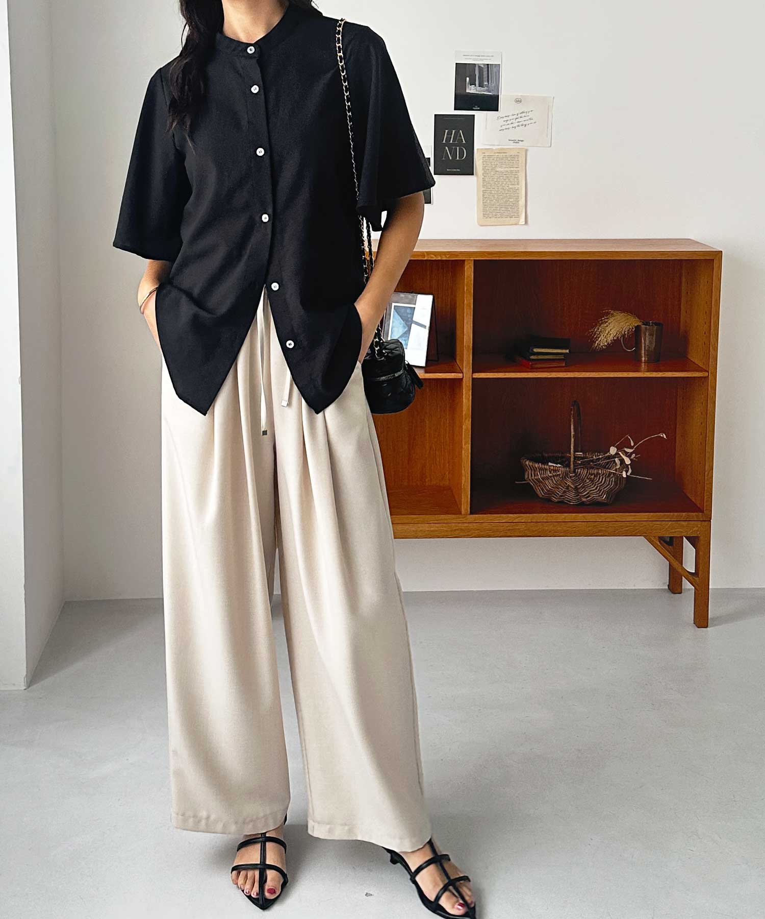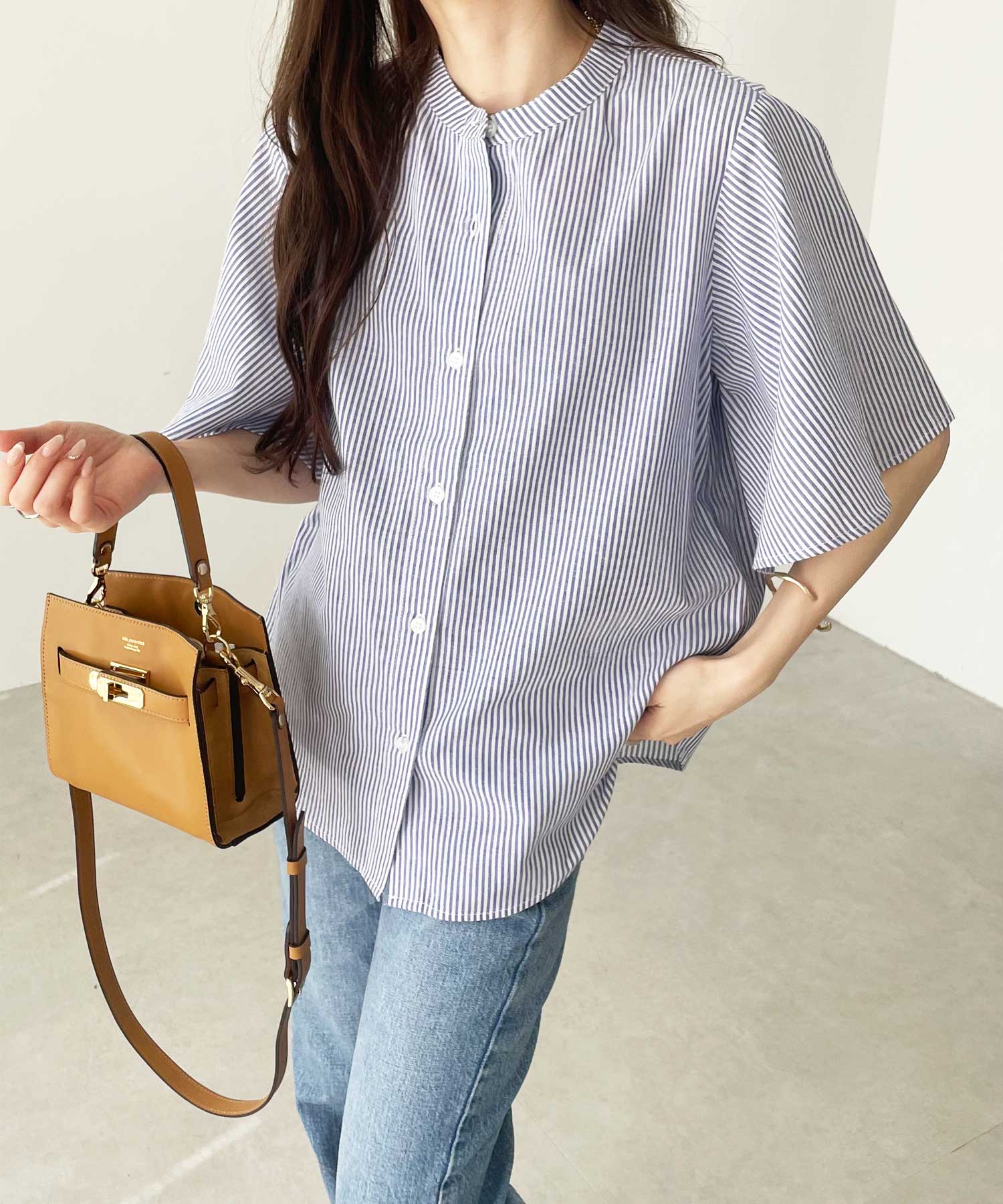 無地/ストライプ フレアー袖バンドカラーシャツブラウス
