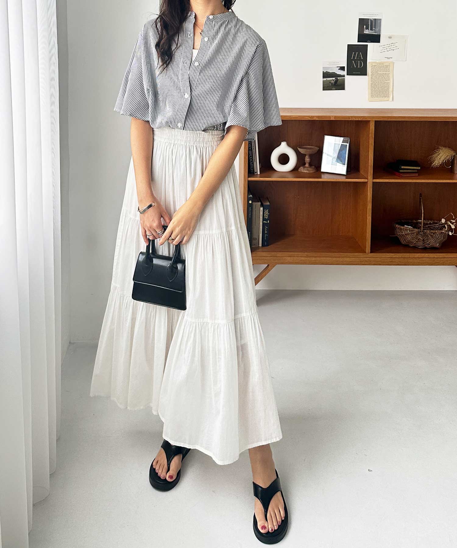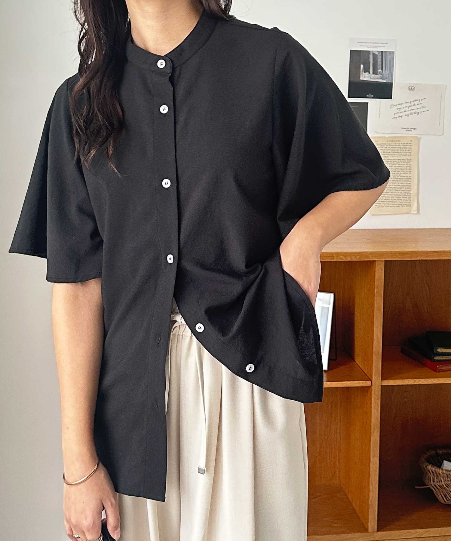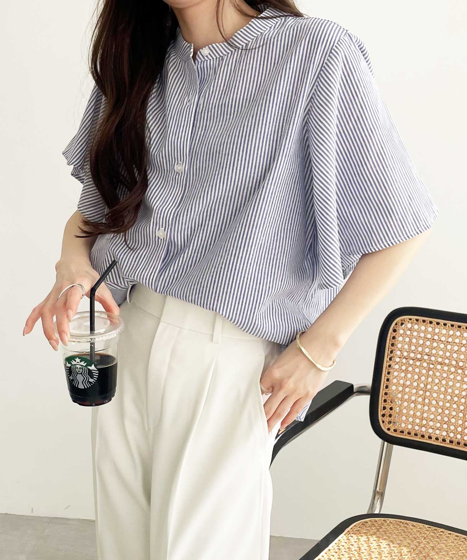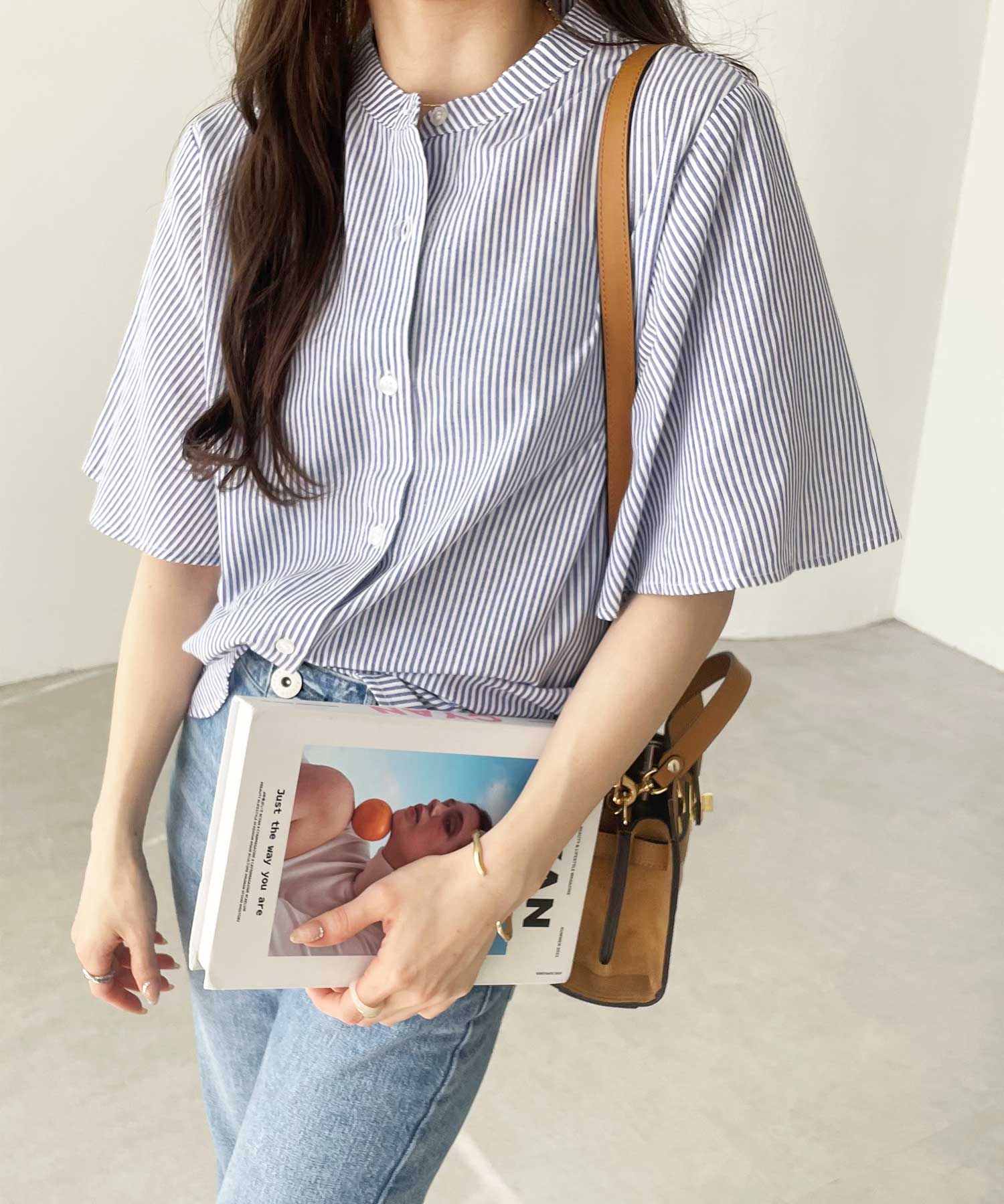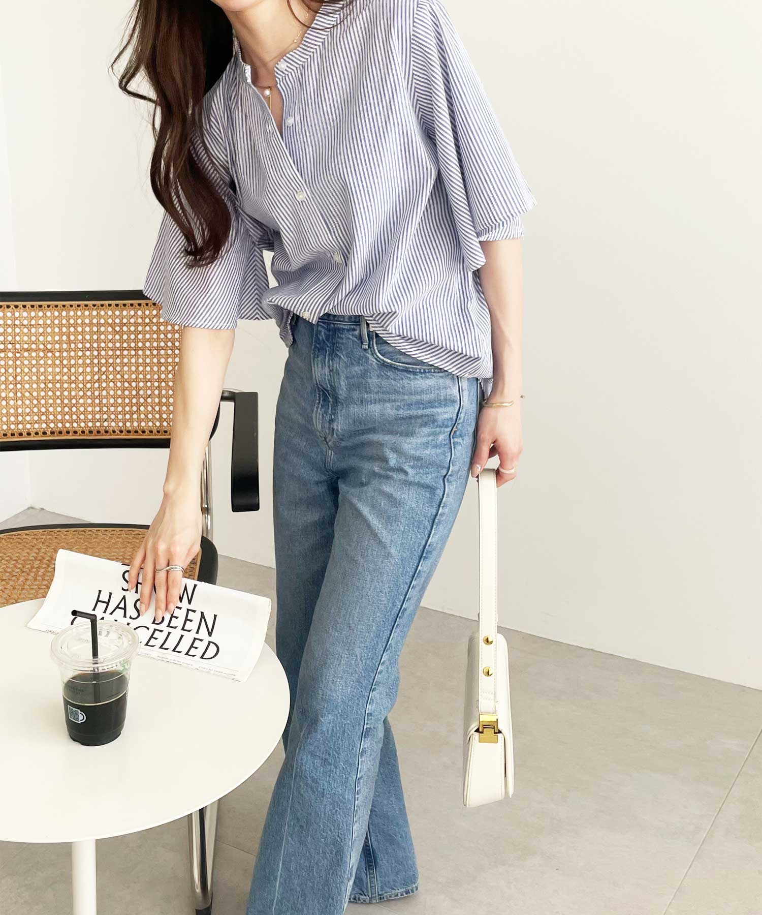 無地/ストライプ フレアー袖バンドカラーシャツブラウス