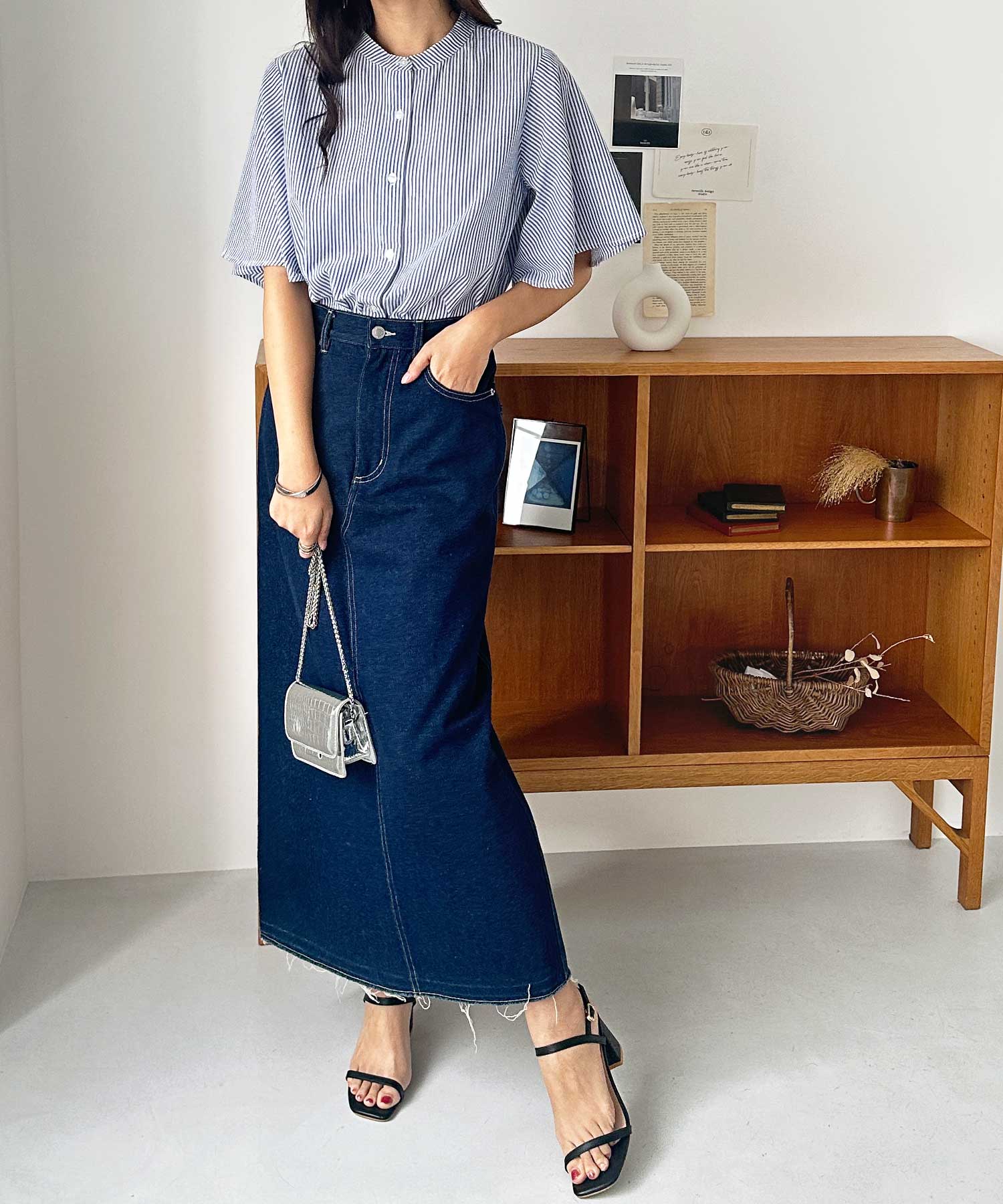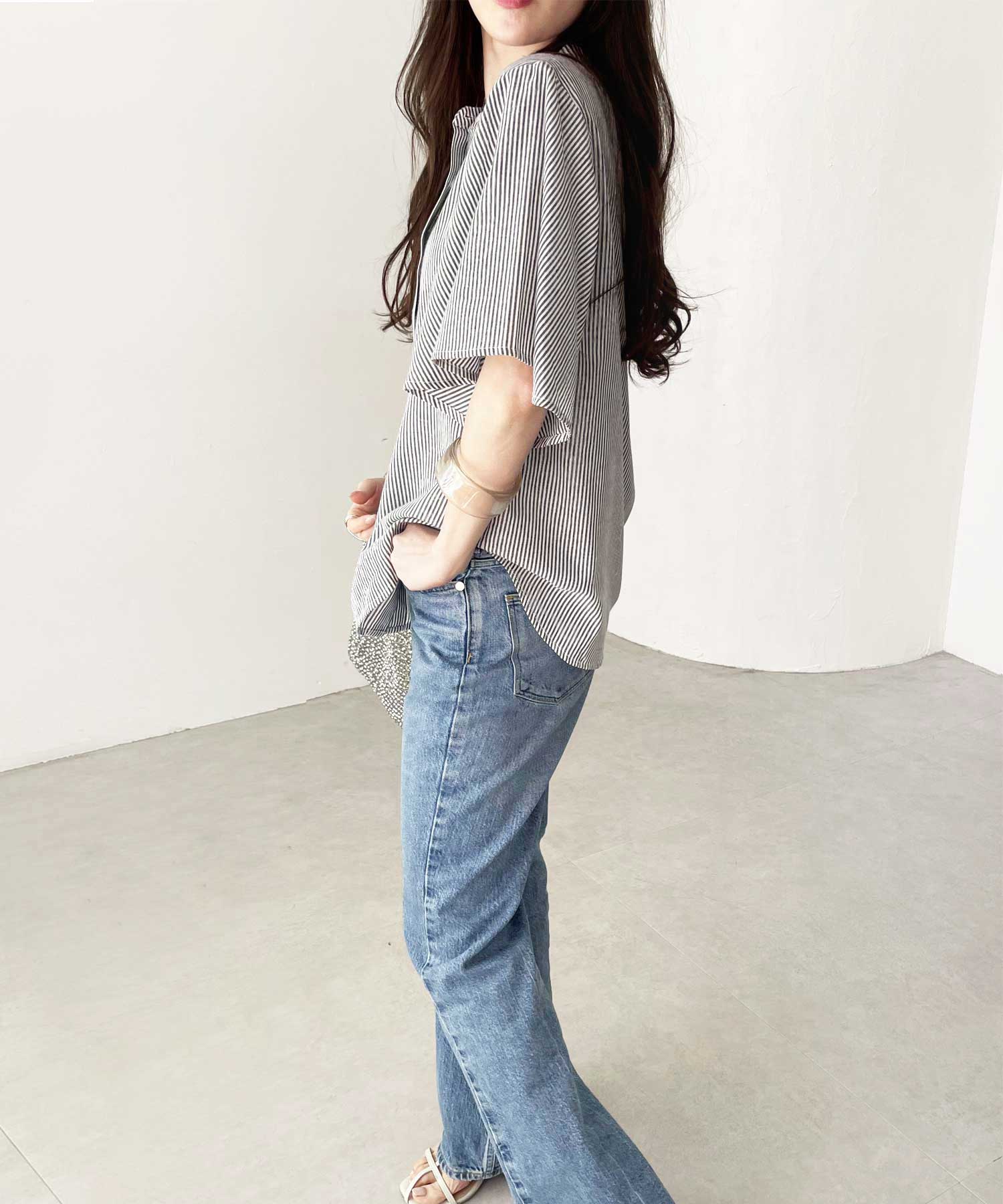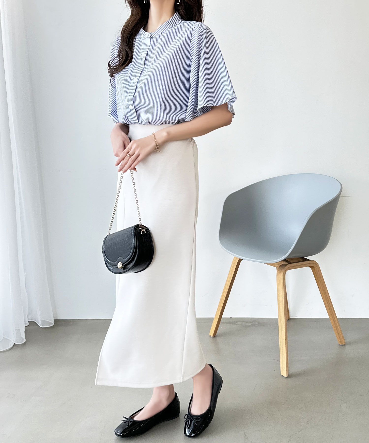 爽やかな細ストライプ生地で甘くなりすぎず大人っぽい着こなしに。