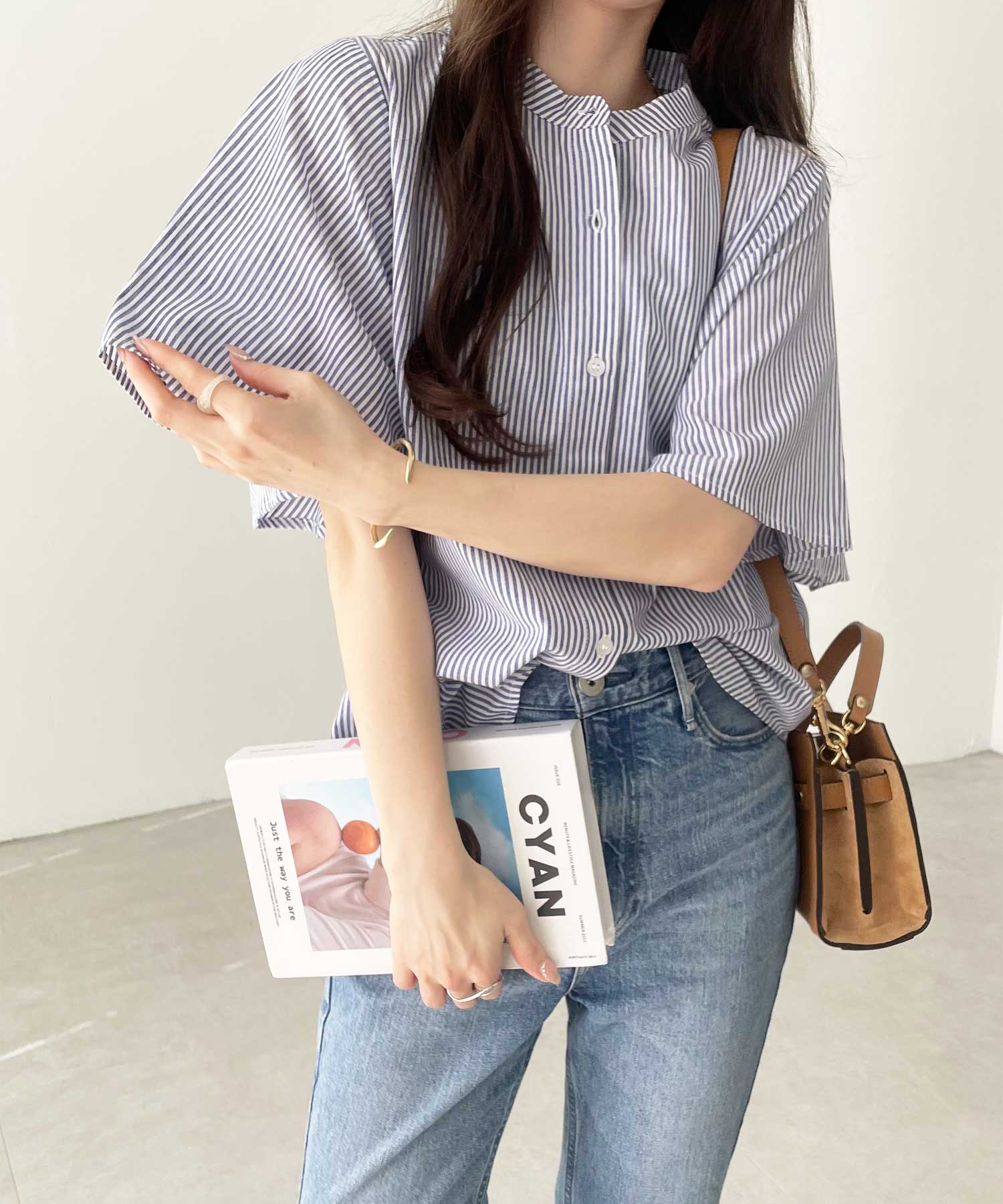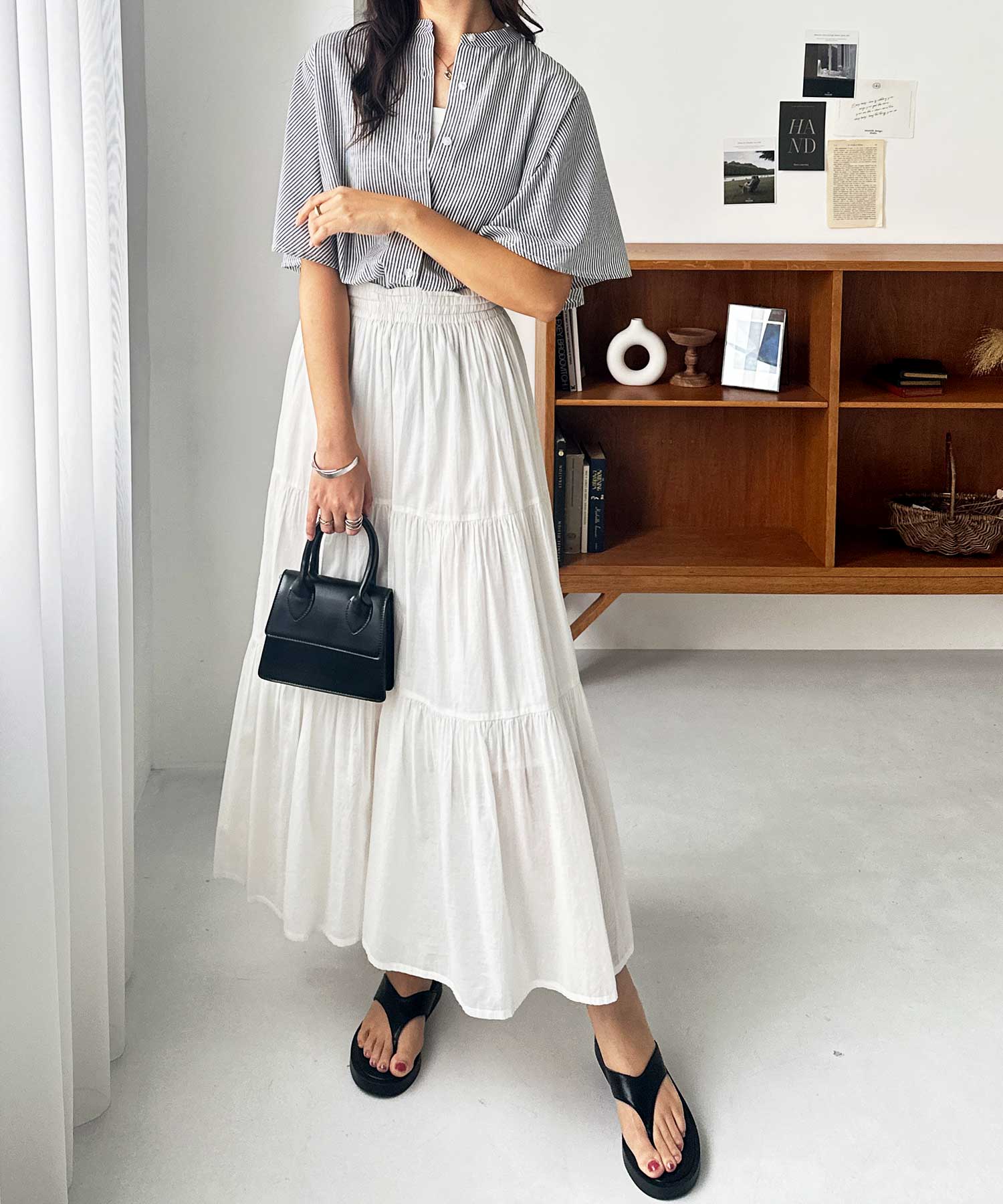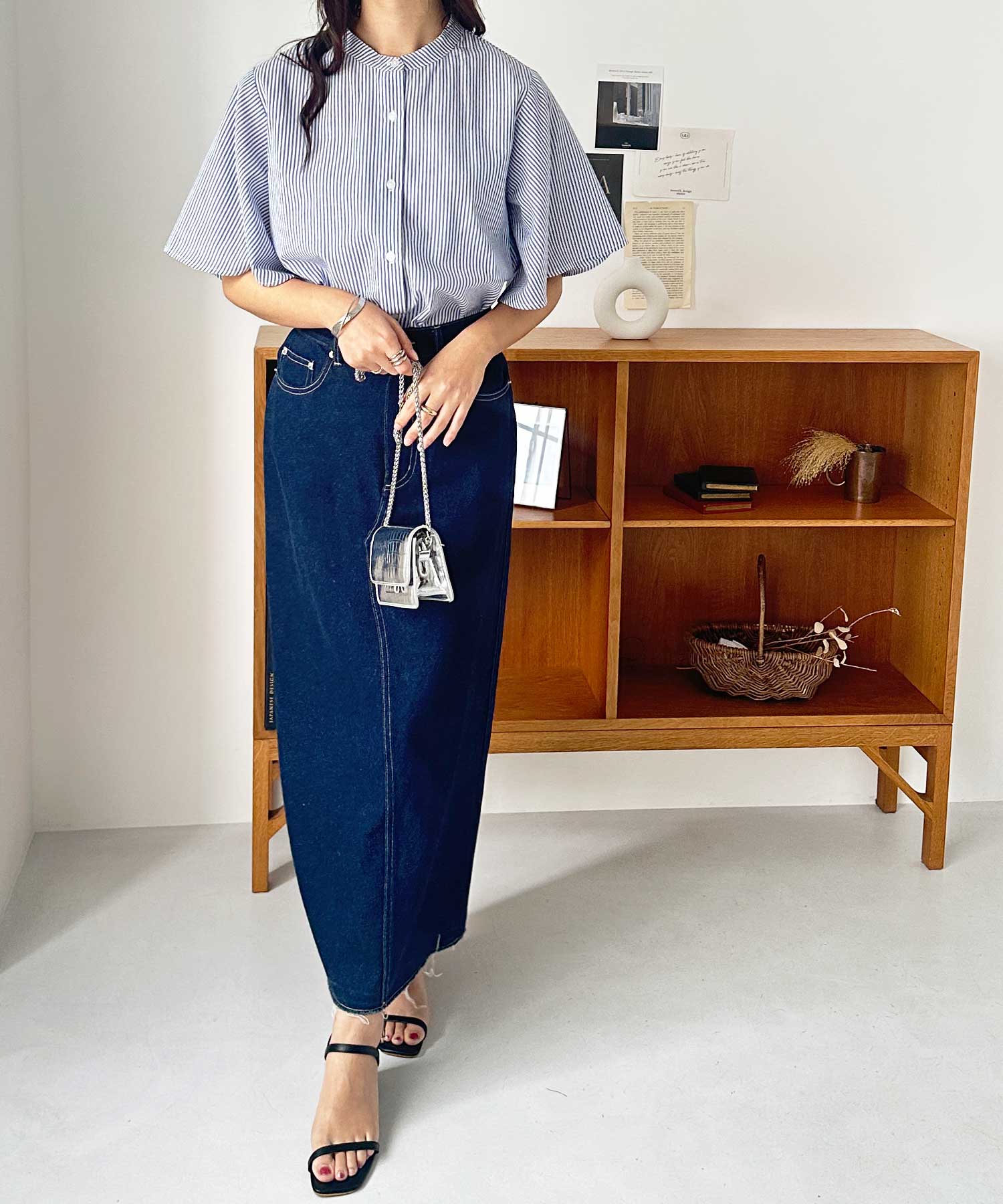 爽やかな細ストライプ生地で甘くなりすぎず大人っぽい着こなしに。