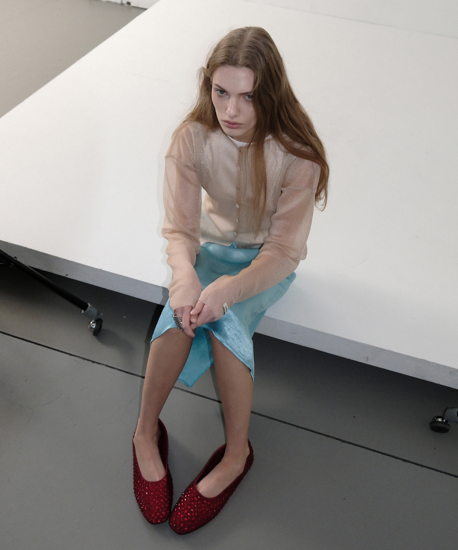 -ナチュラルなスキントーンのヌードベージュカラーで、同じ糸で製作したSHEER GLOSSY HALTER KNIT TOPとセットスタイリングが可能で、単品でもレイヤードでも活用度が高いです。