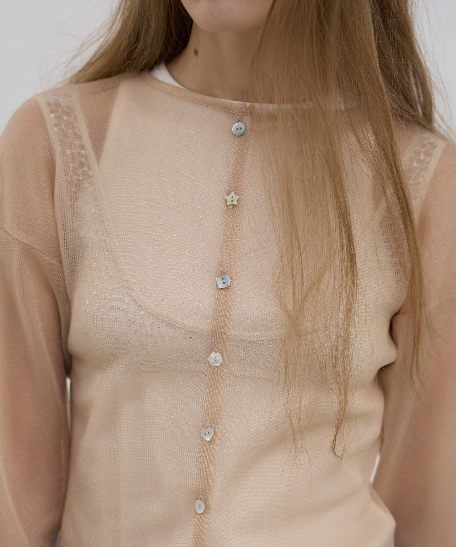 -シアーなニット糸で、ほのかな光沢と透け感を表現したニットカーディガンです。
