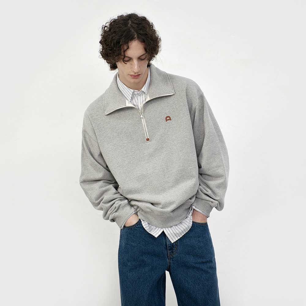 UNISEX LEATHER LOGO HALF ZIP-UP SWEATSHIRT MELANGE GREY_M_UDTS5C107G2