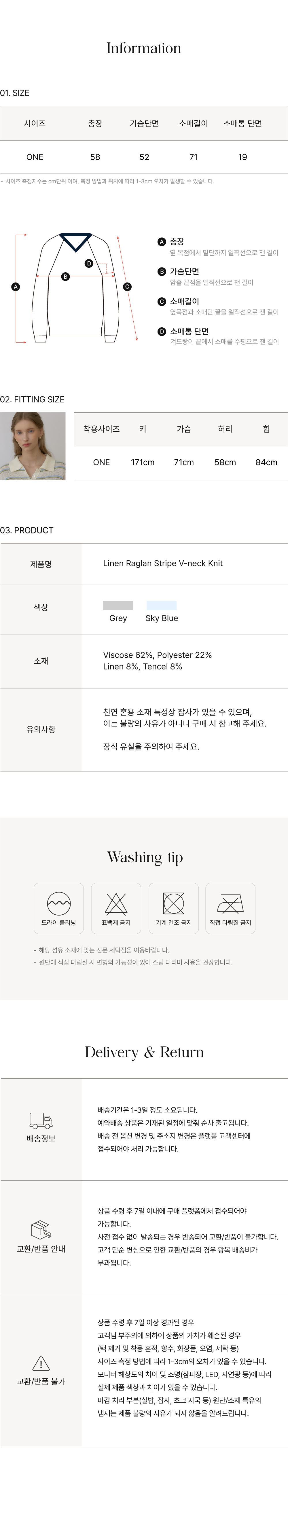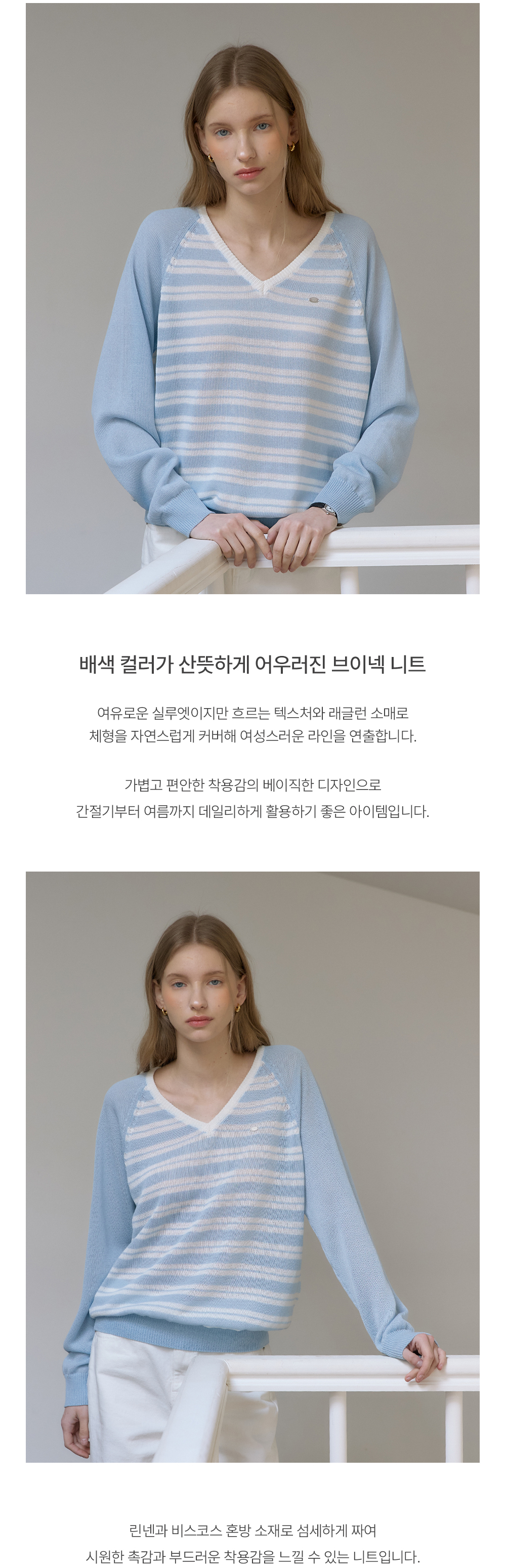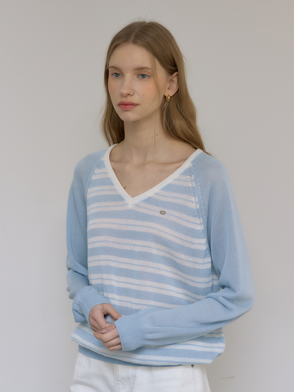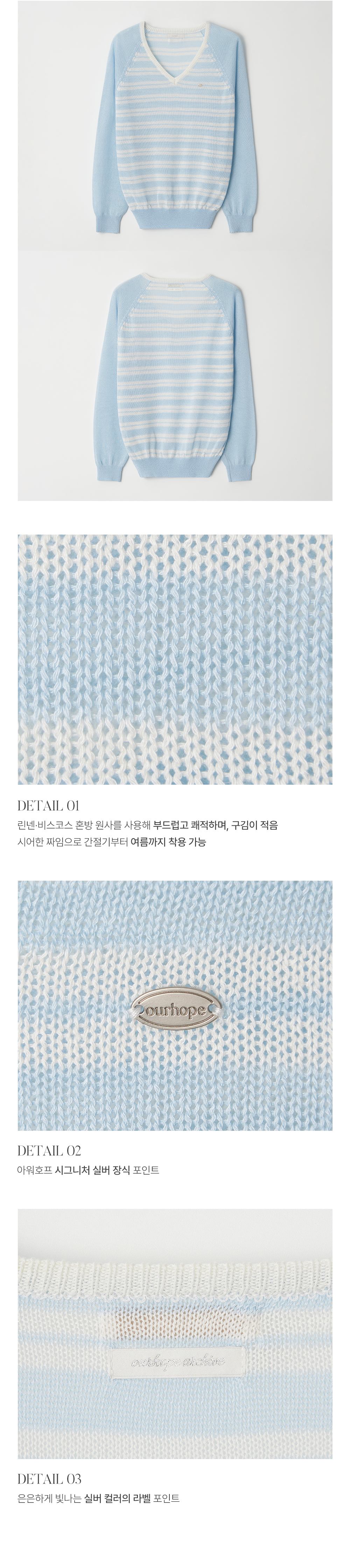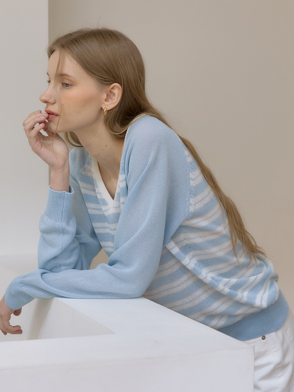 Linen Raglan Stripe V-neck Knit - Sky Blue
