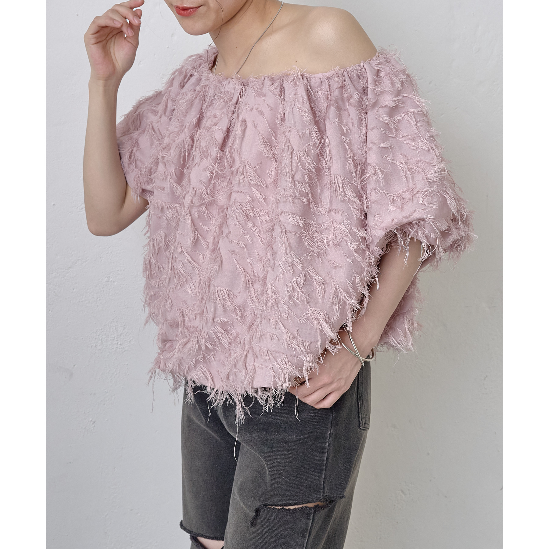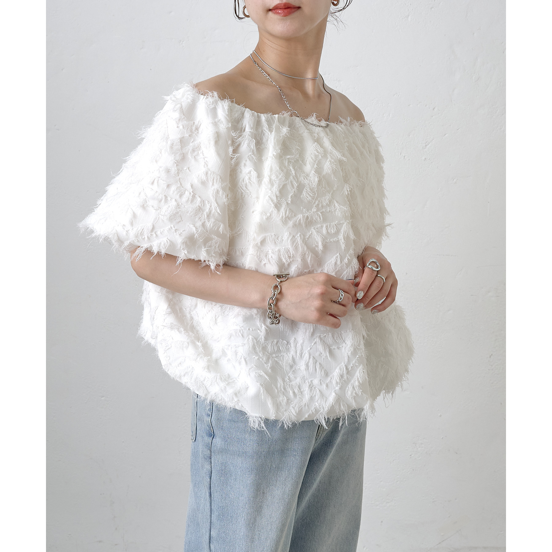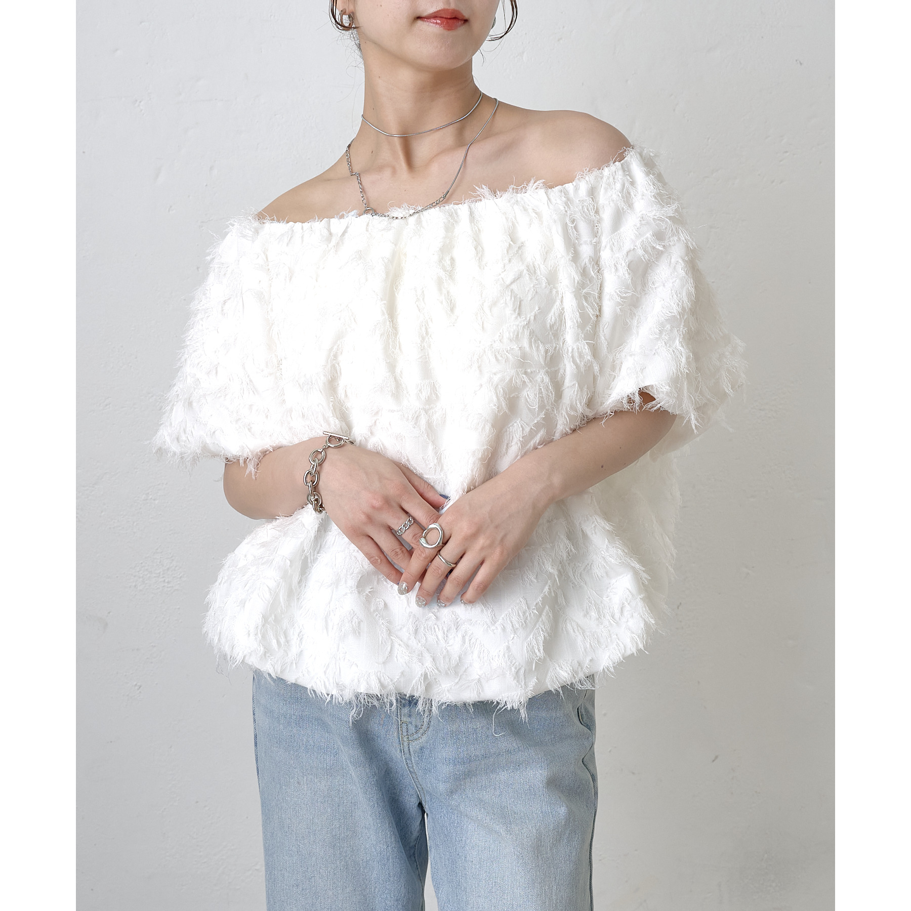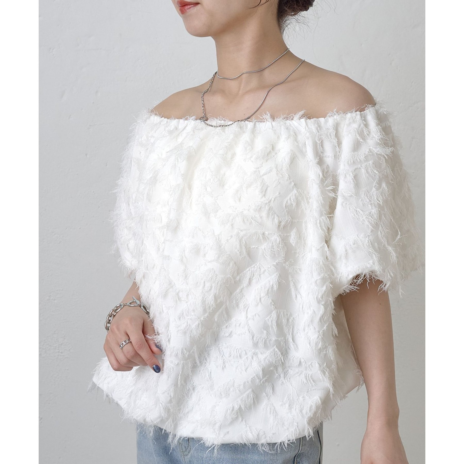 【ヘルシーな肌見せと繊細なフリンジが華やかなオフショルトップス】