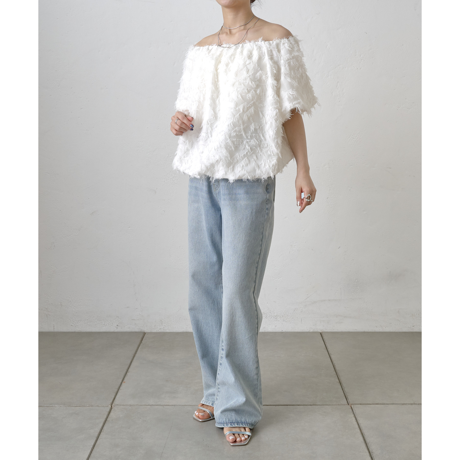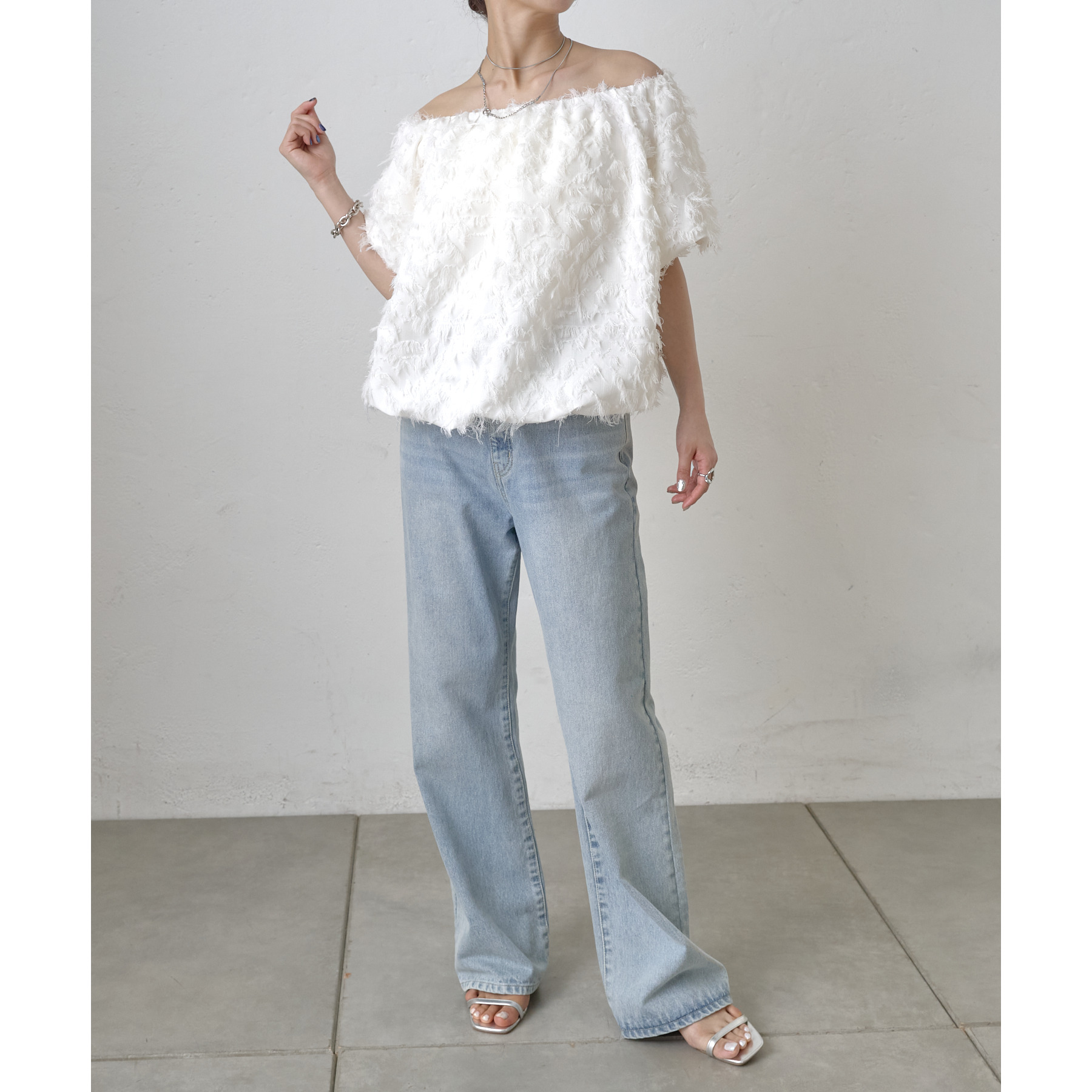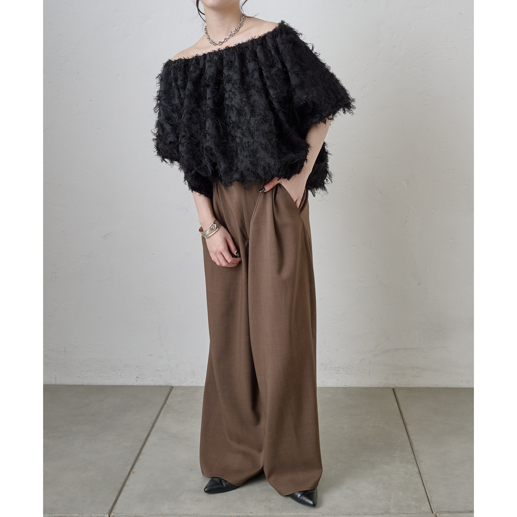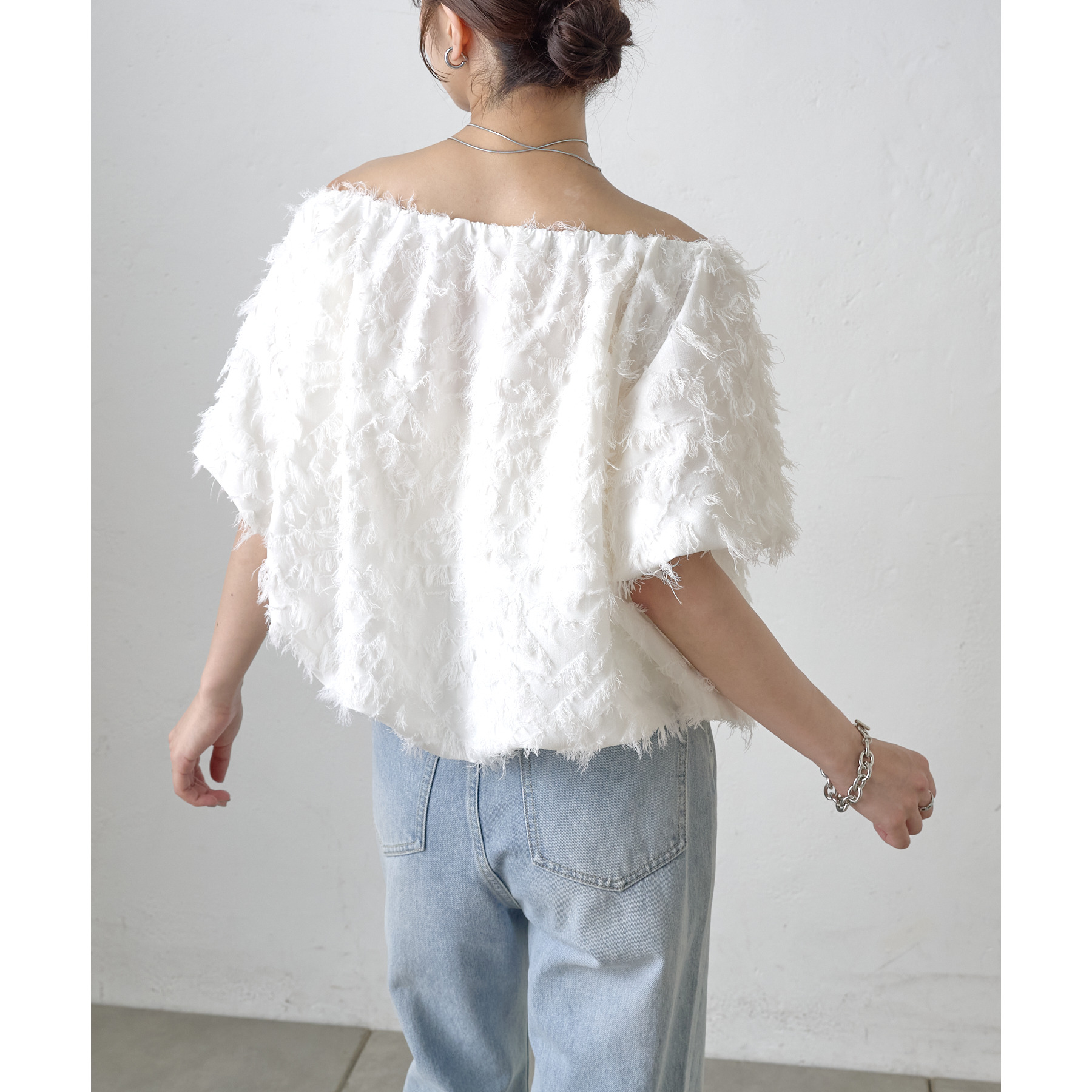 ヘルシーな印象のオフショルダーシルエットと華やかで上品な印象繊細なフリンジが、着こなしに奥行きと表情をプラス。