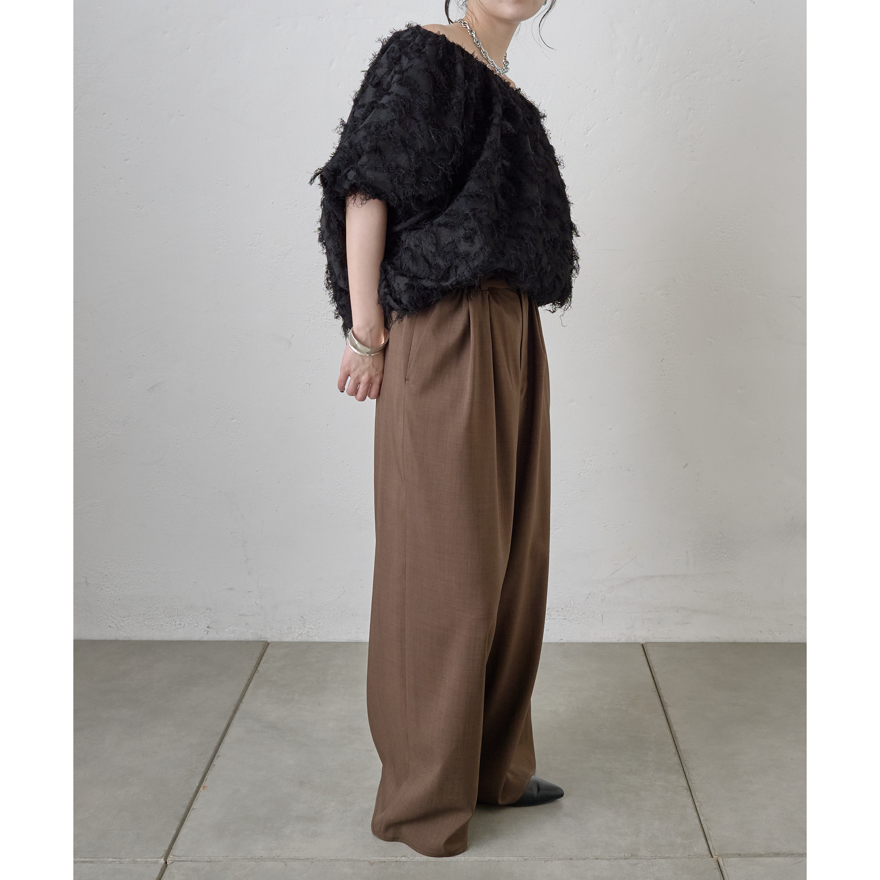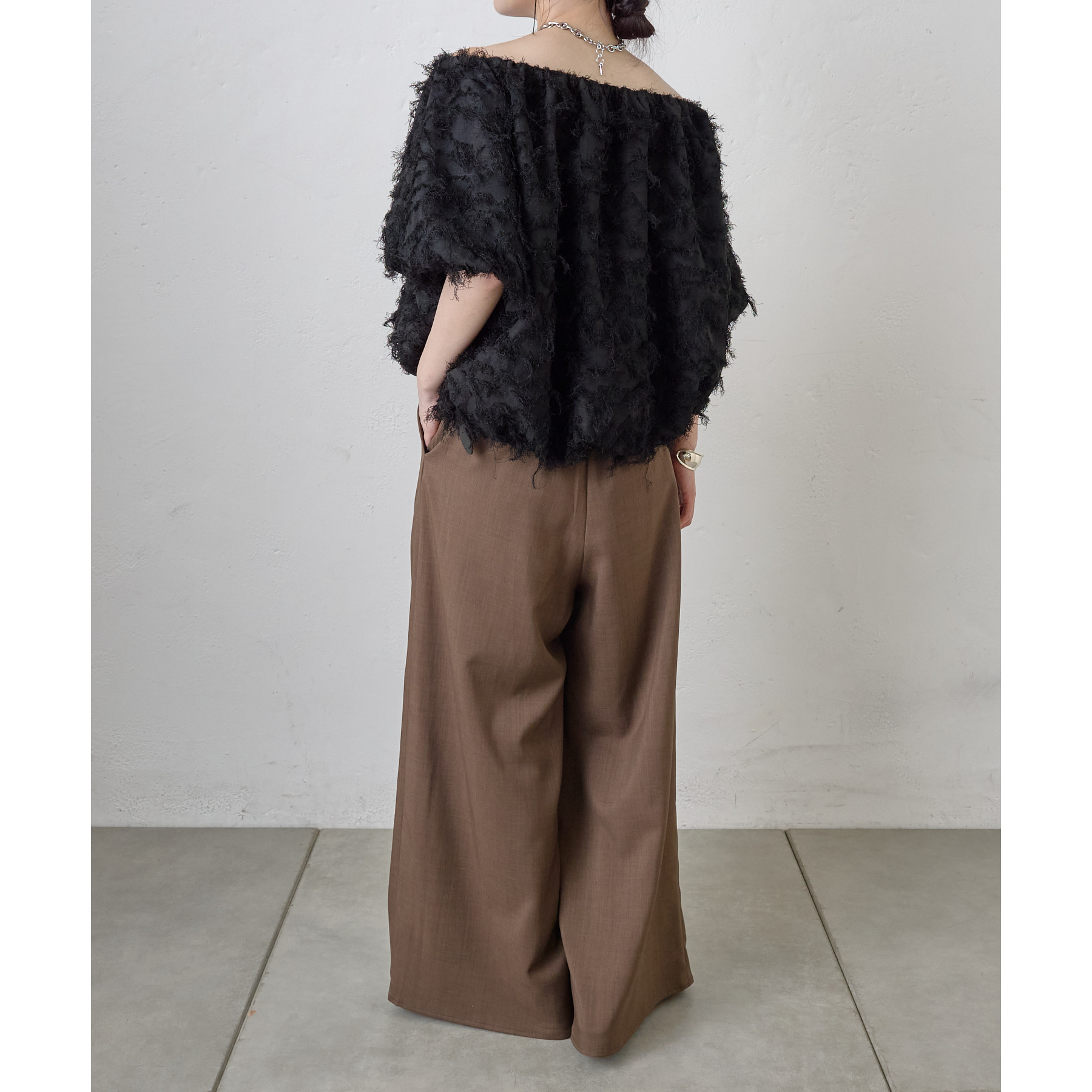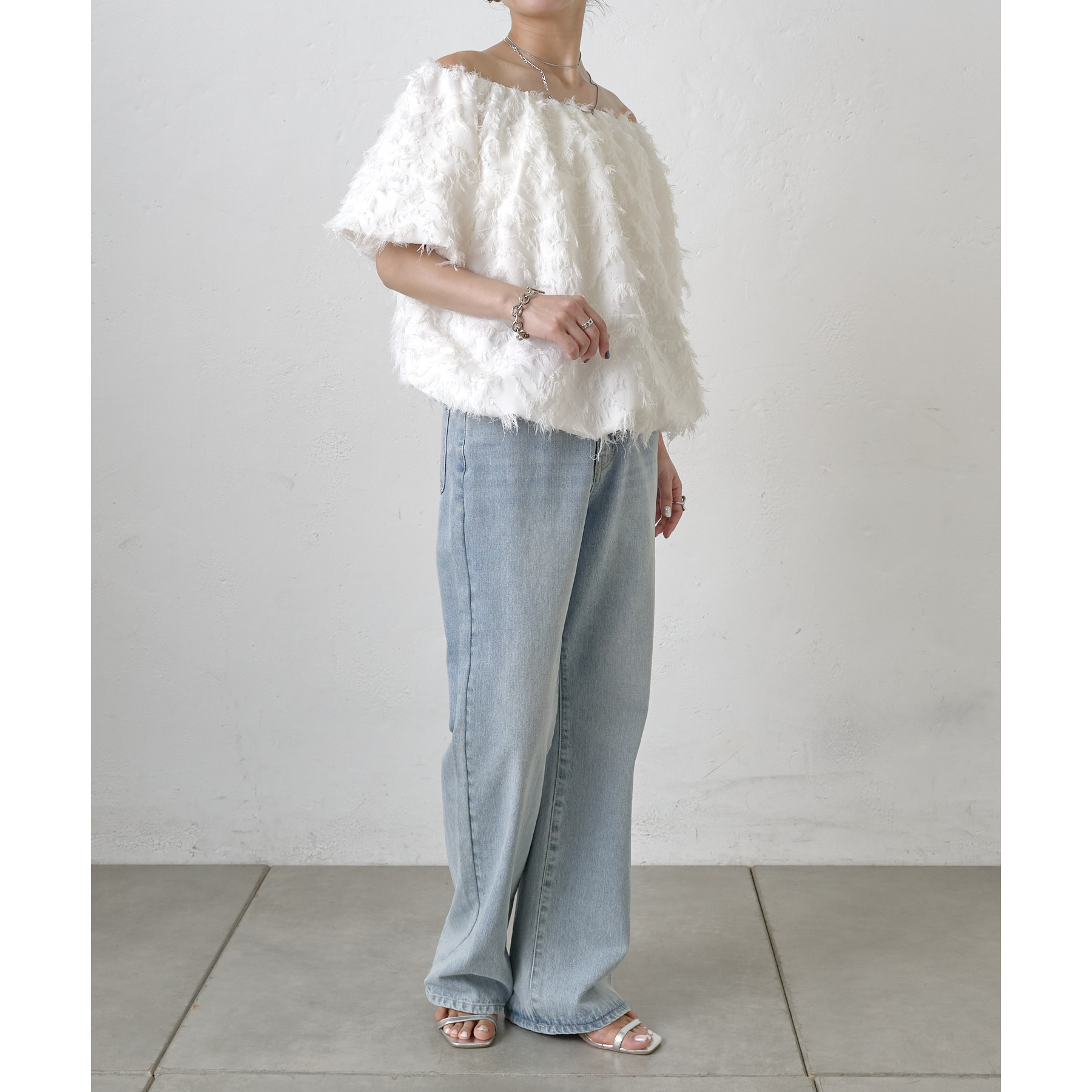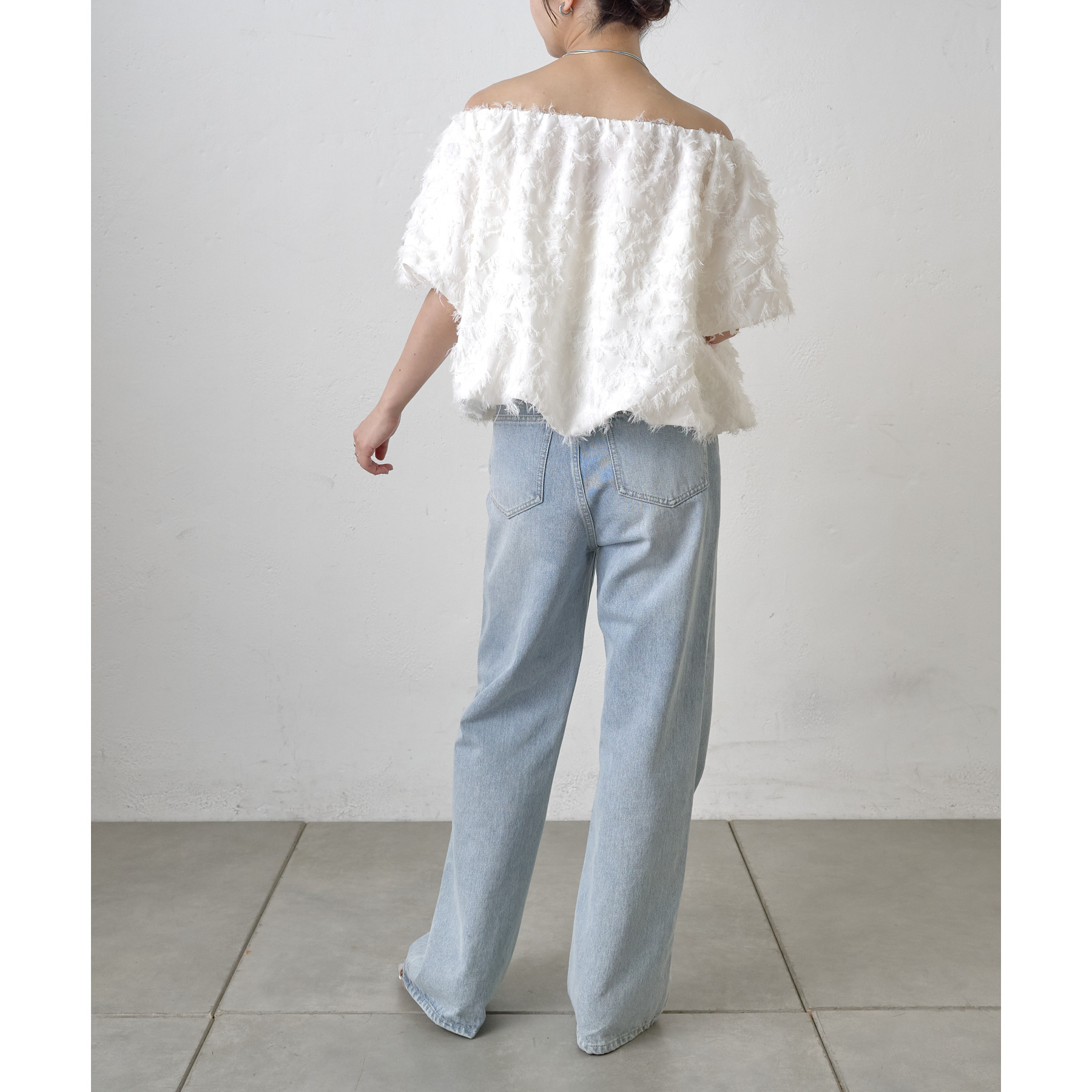 ヘルシーな印象のオフショルダーシルエットと華やかで上品な印象繊細なフリンジが、着こなしに奥行きと表情をプラス。