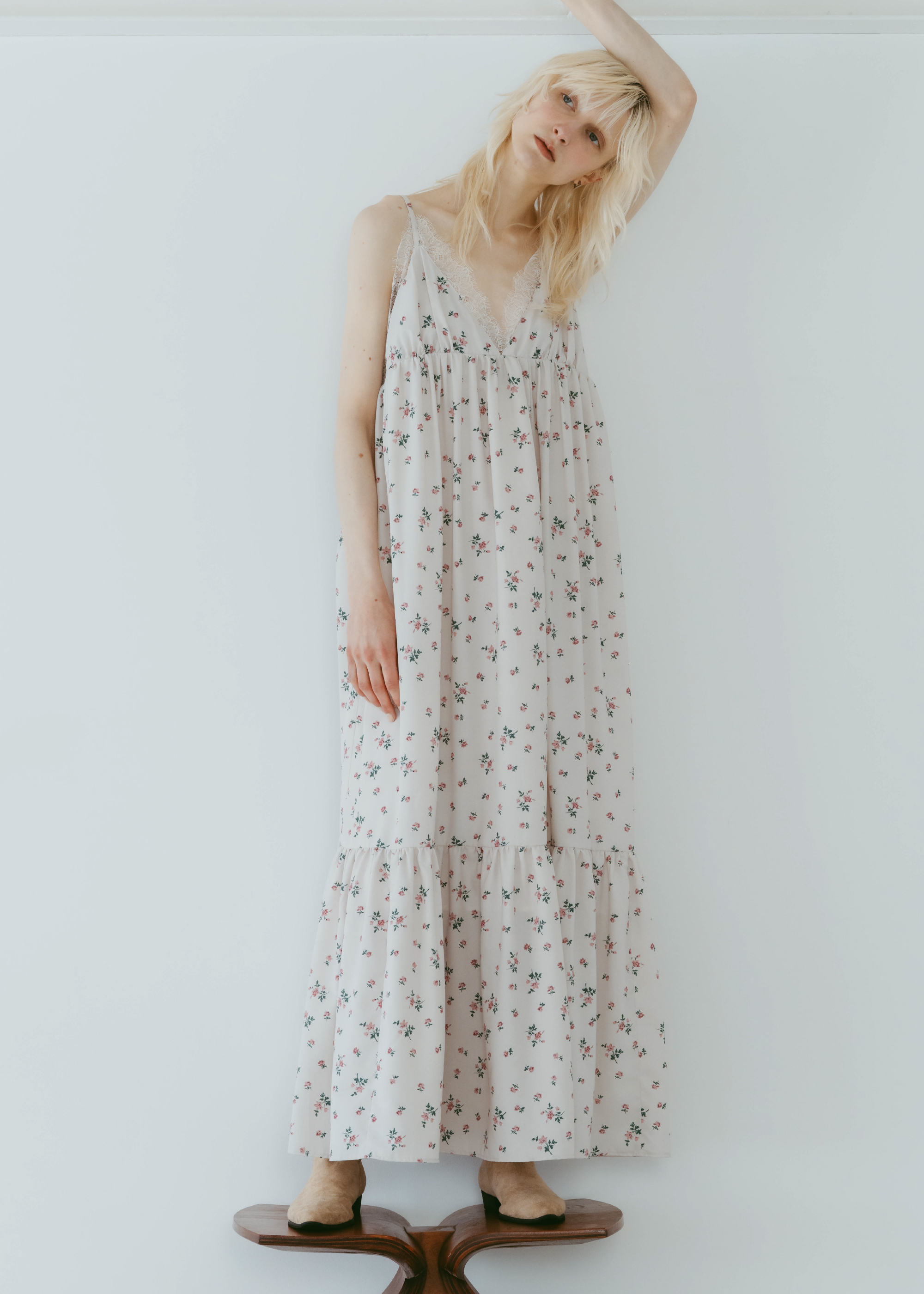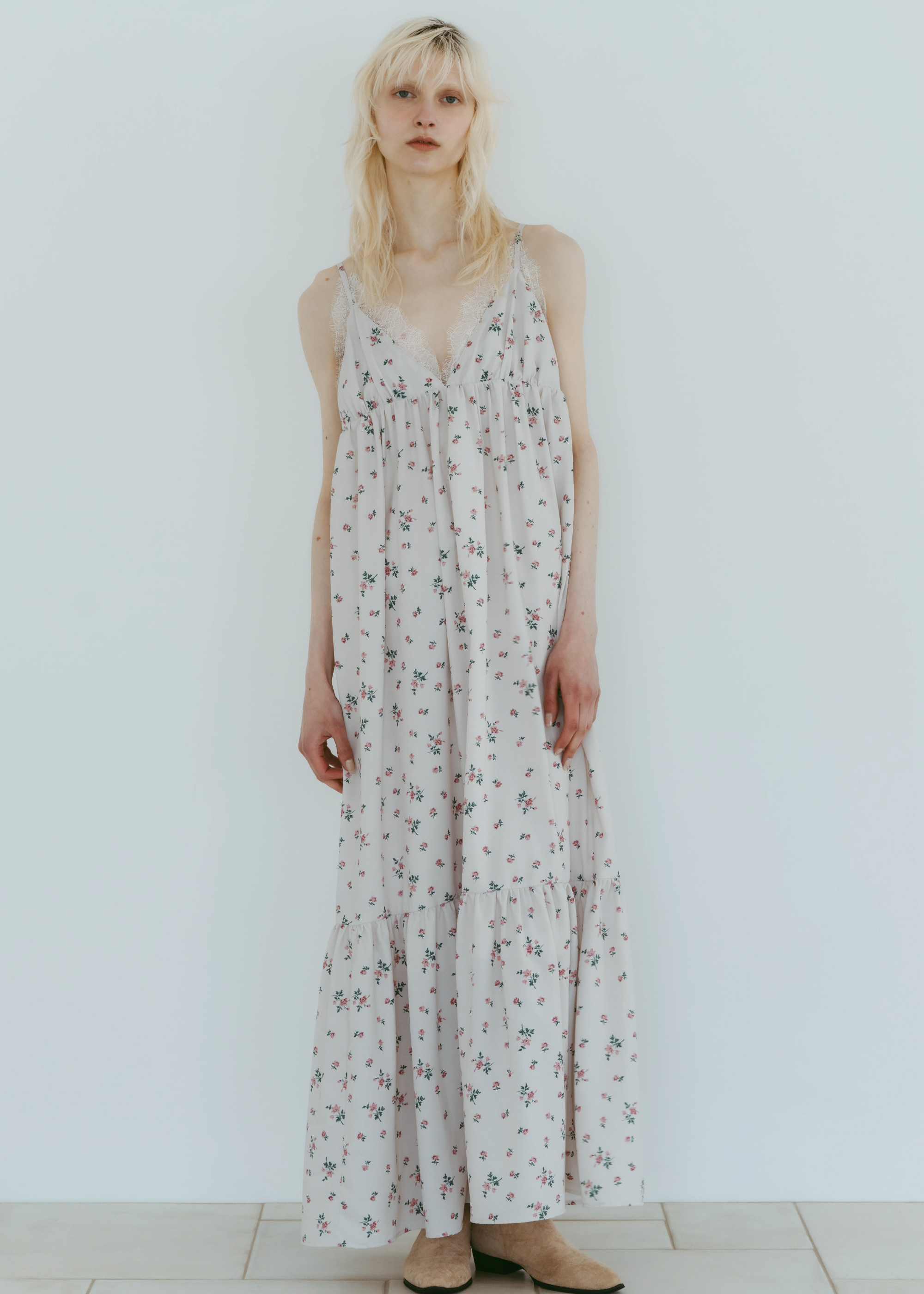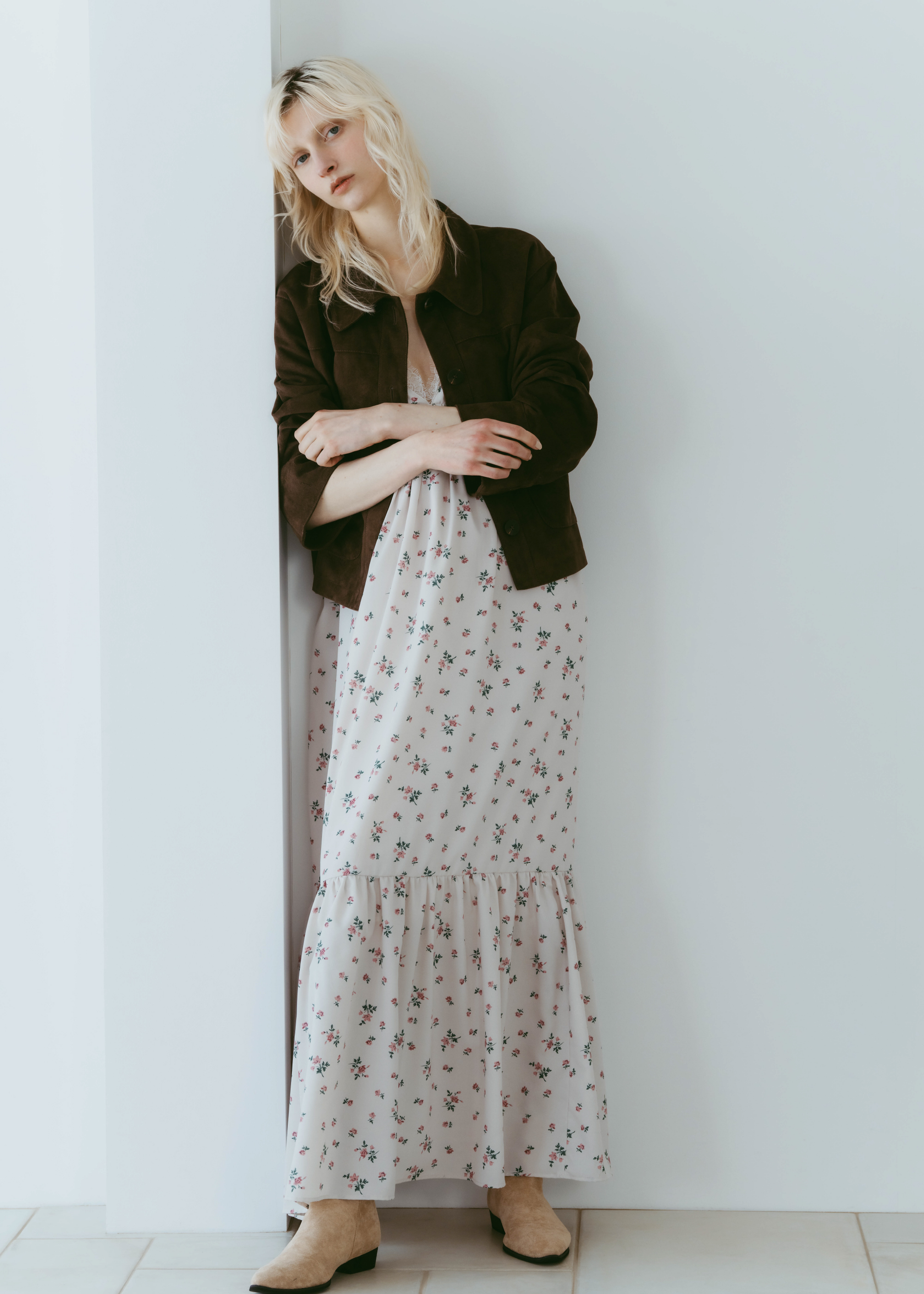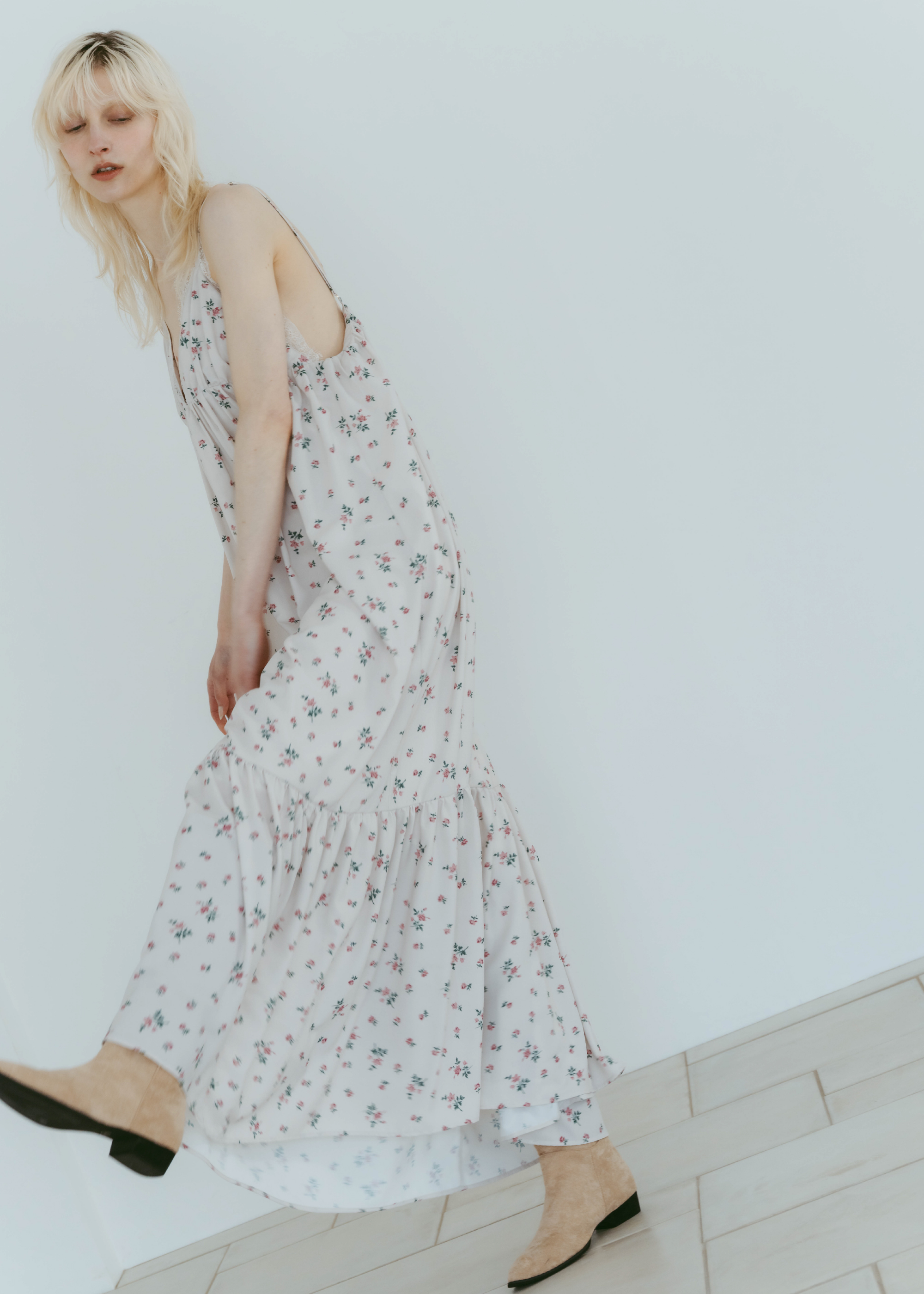 ヴィンテージ感のある小花柄が印象的な、分量たっぷりのフローラルドレス。