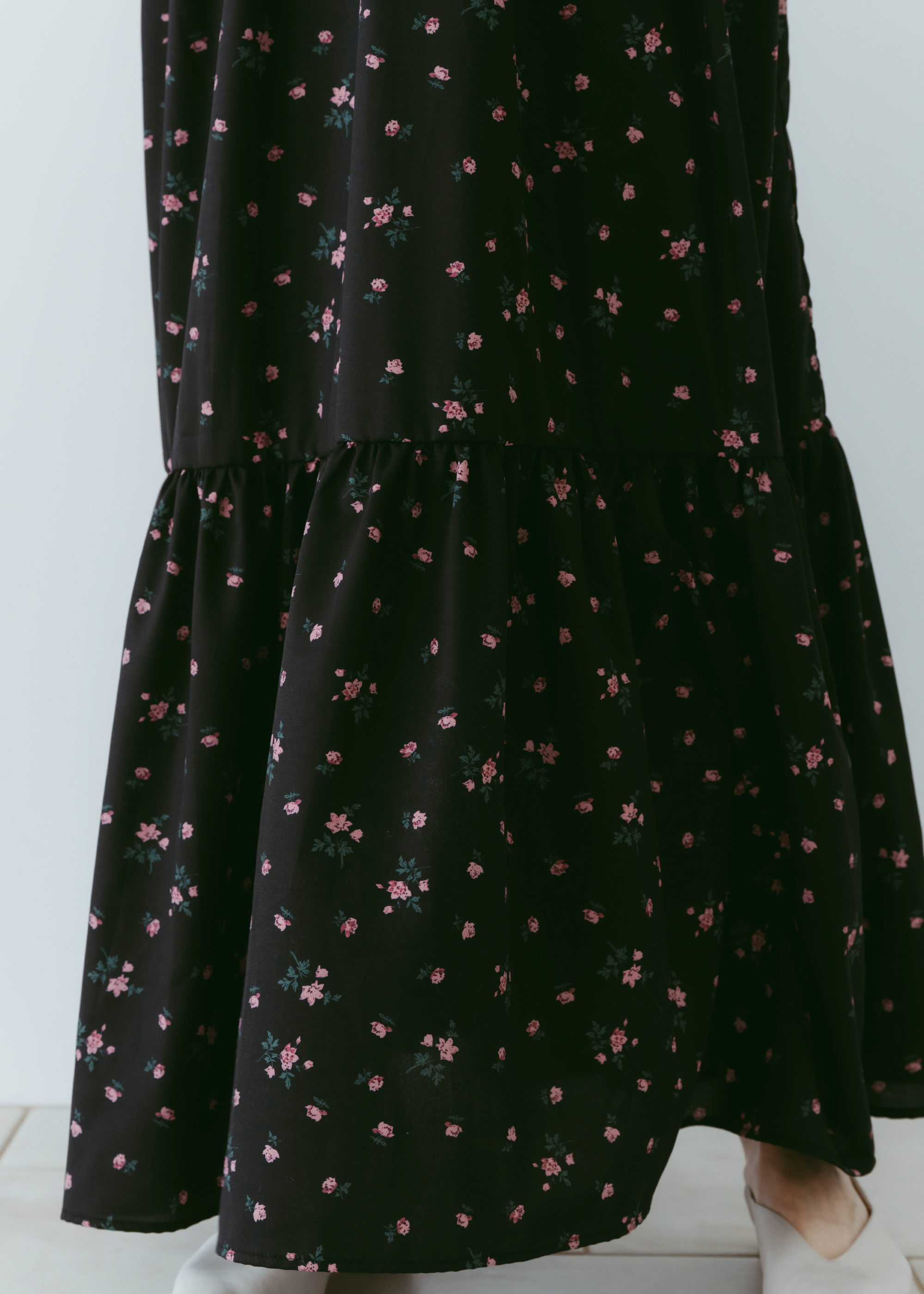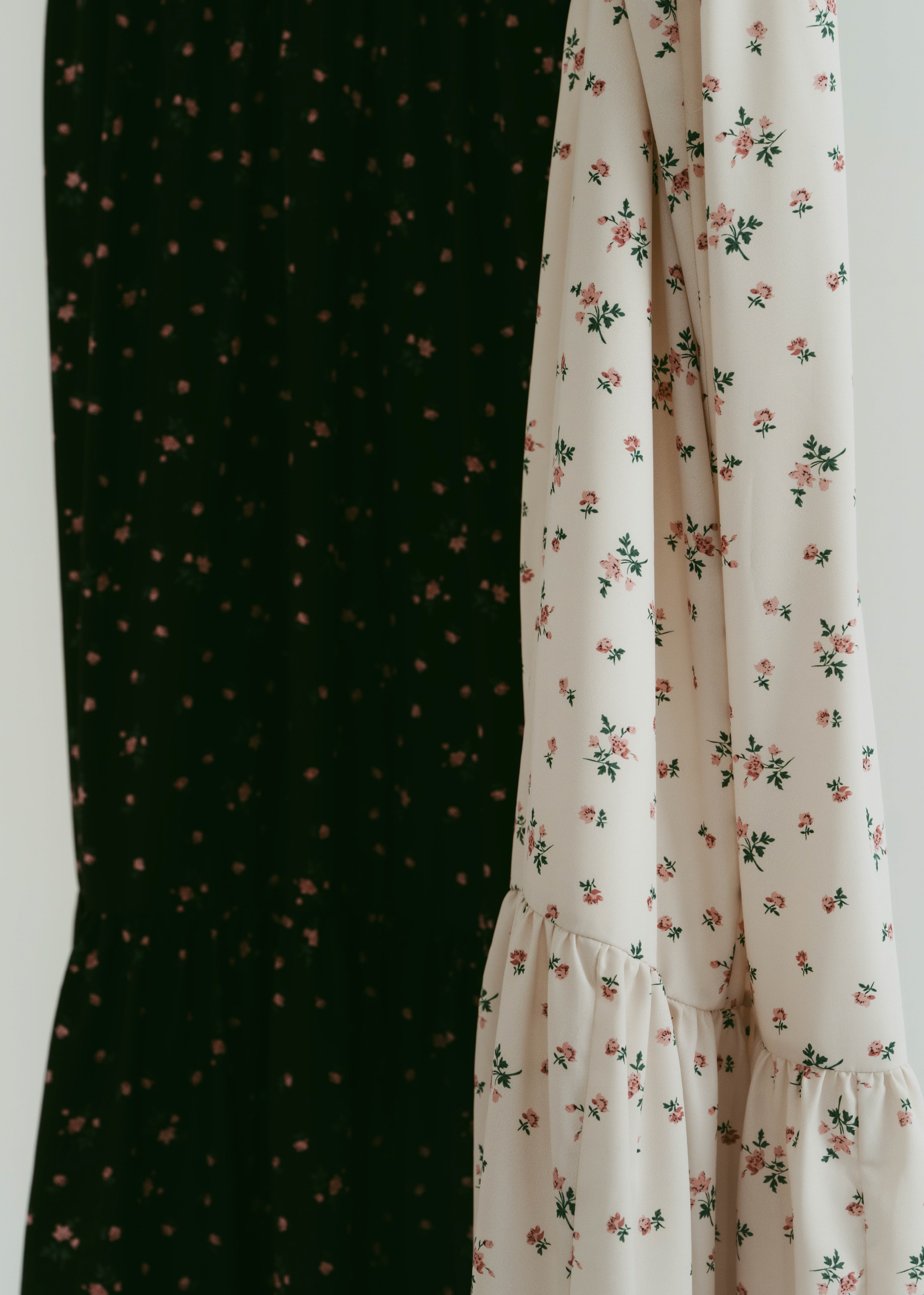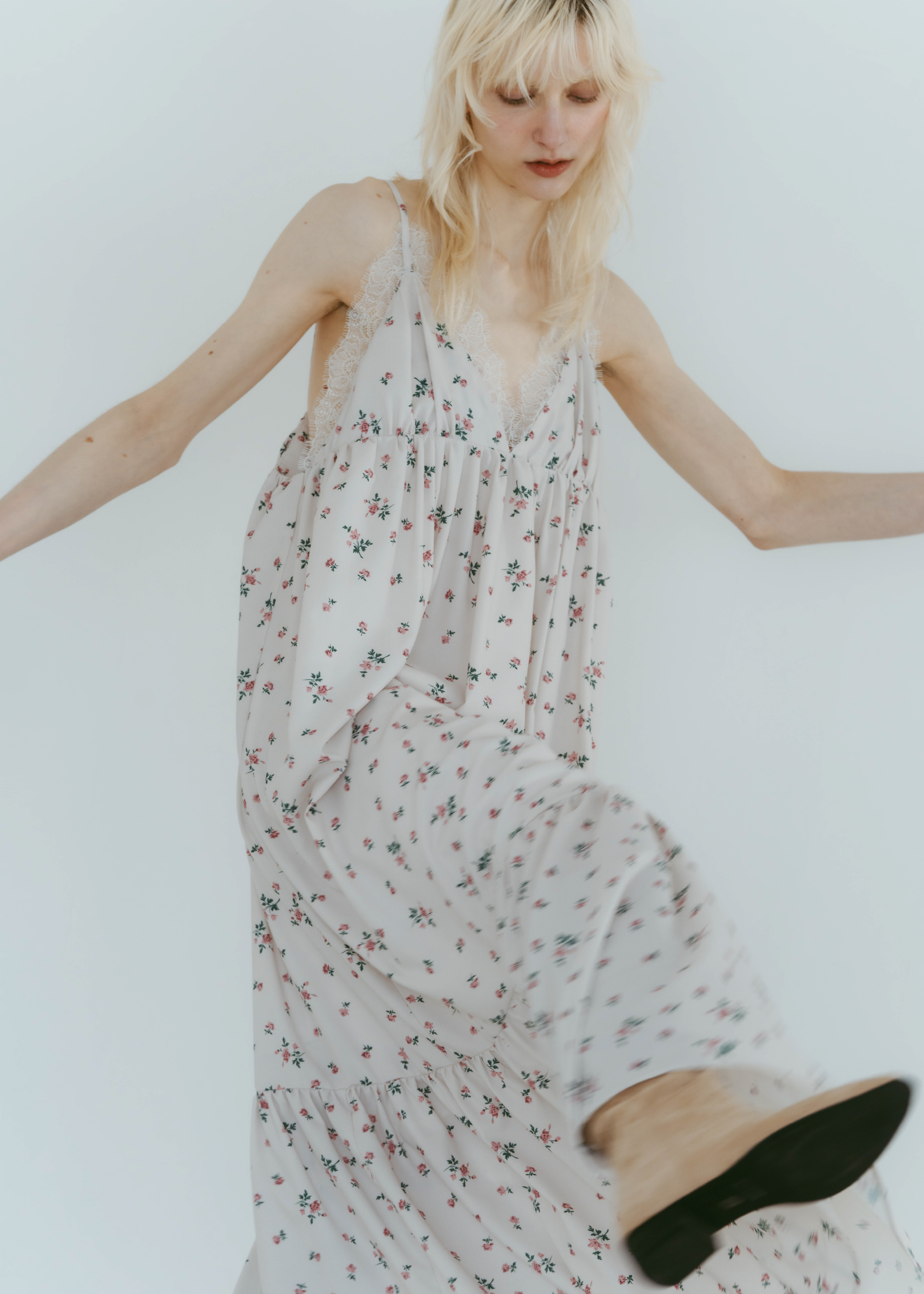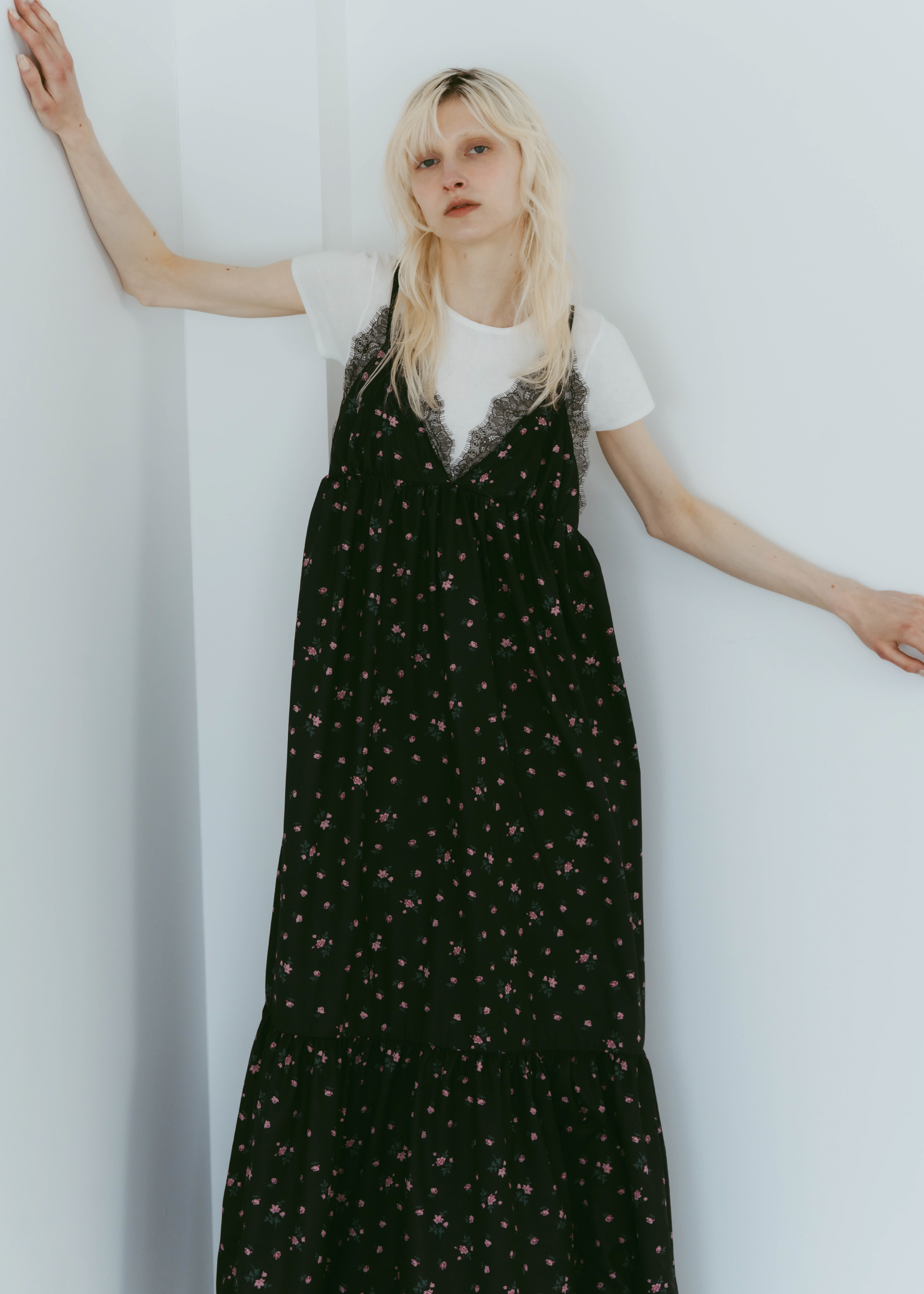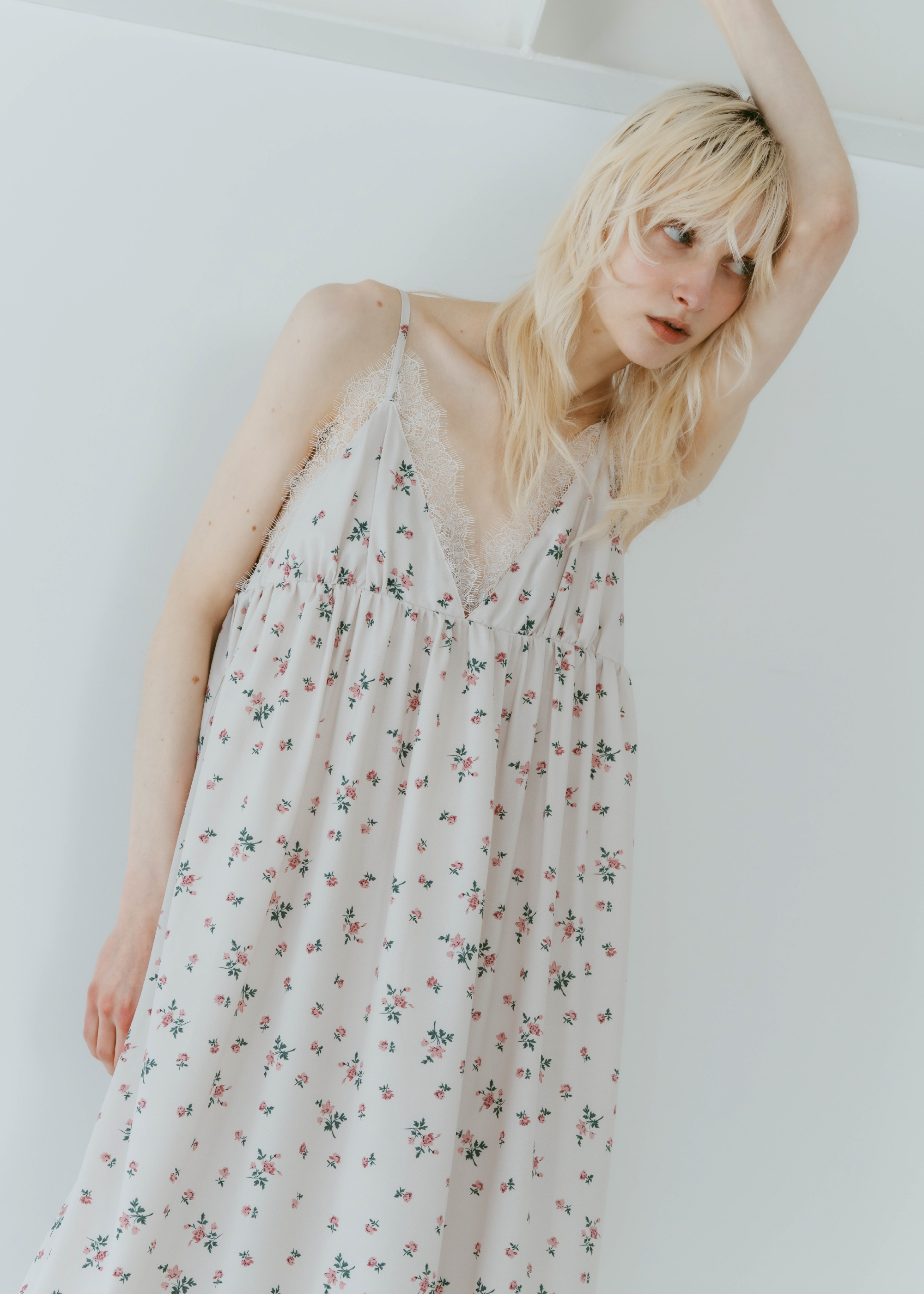 ヴィンテージ感のある小花柄が印象的な、分量たっぷりのフローラルドレス。