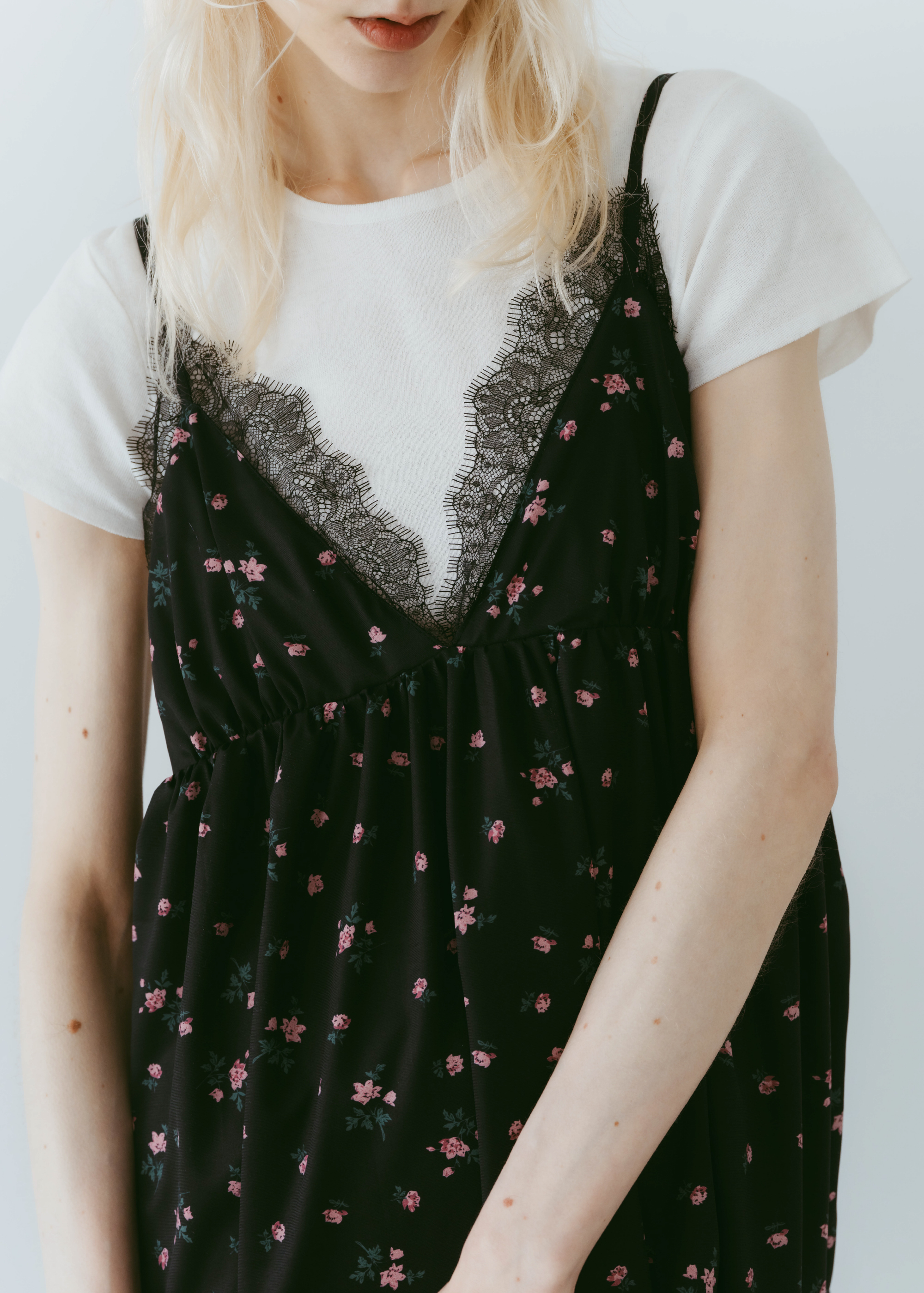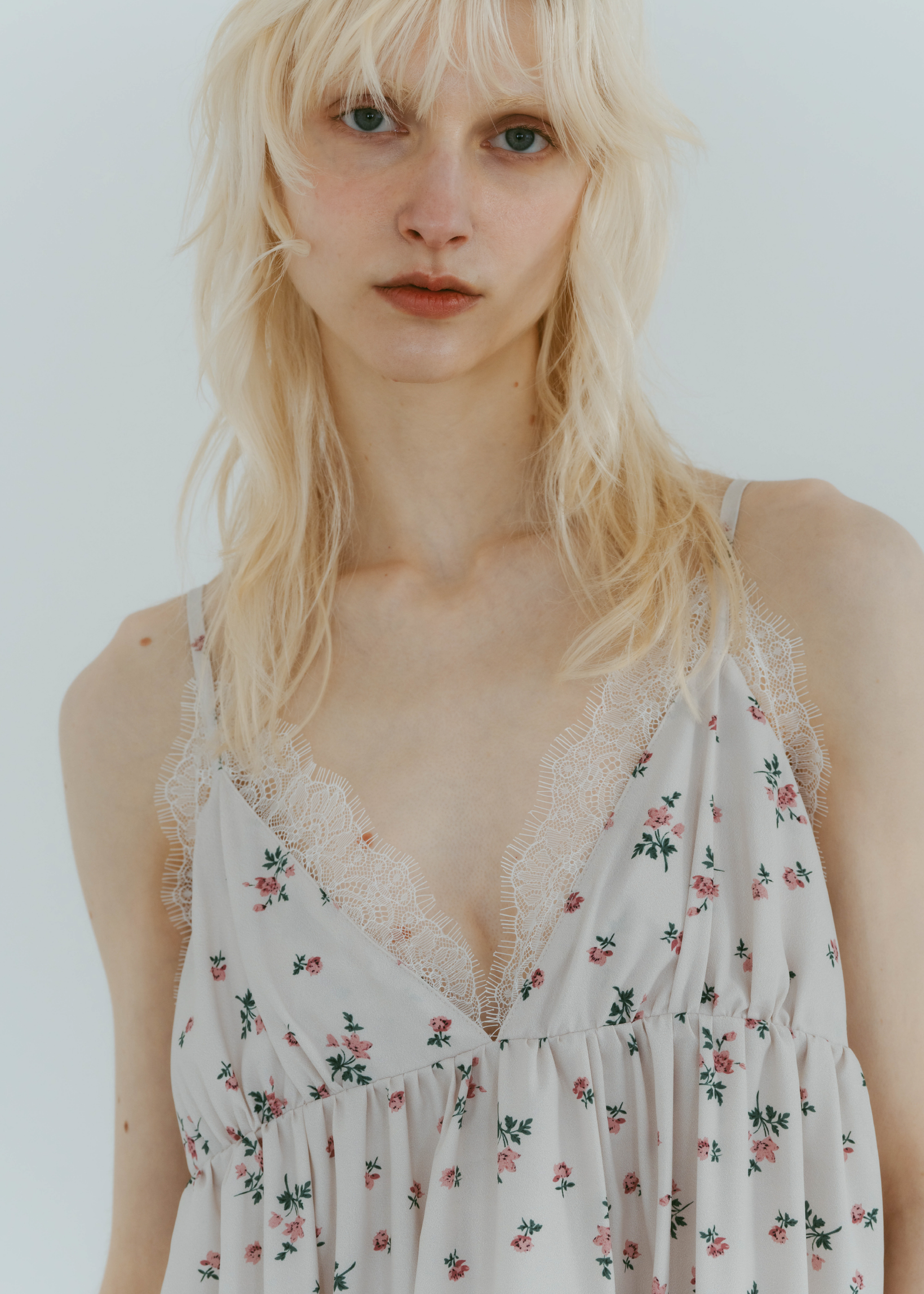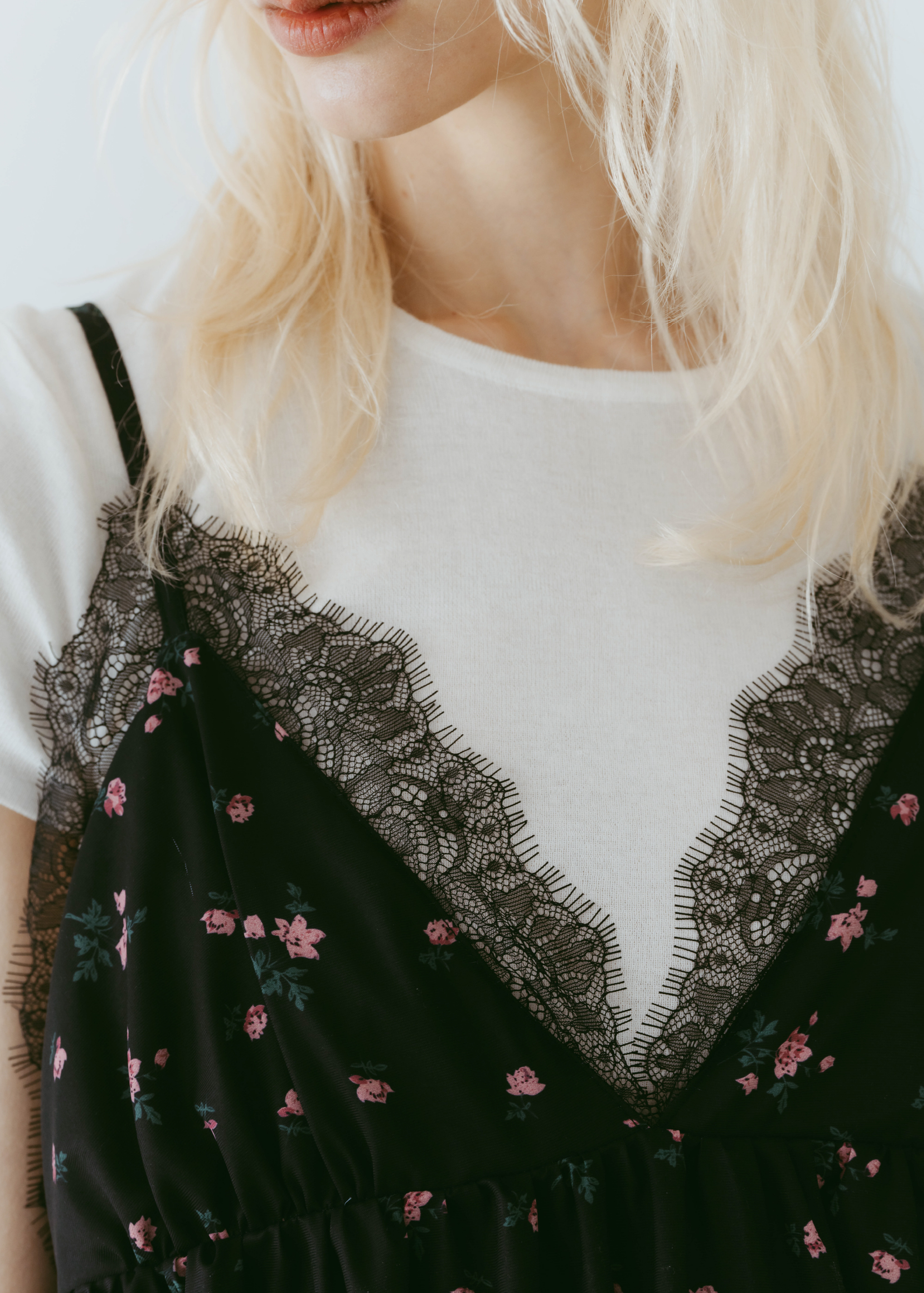 胸元には繊細なレースをあしらい、フェミニンなアクセントをプラスしました。