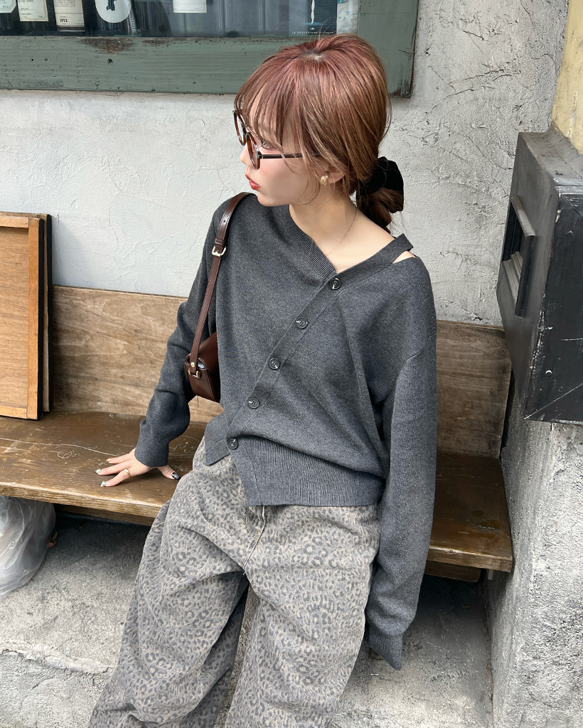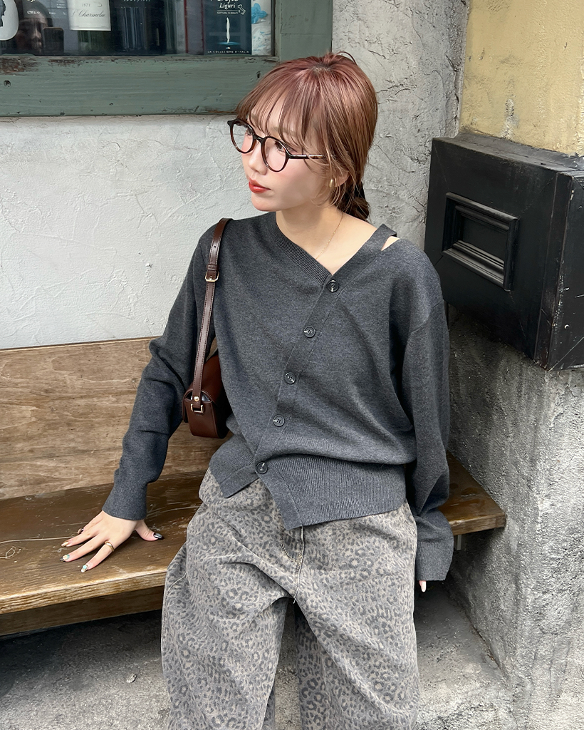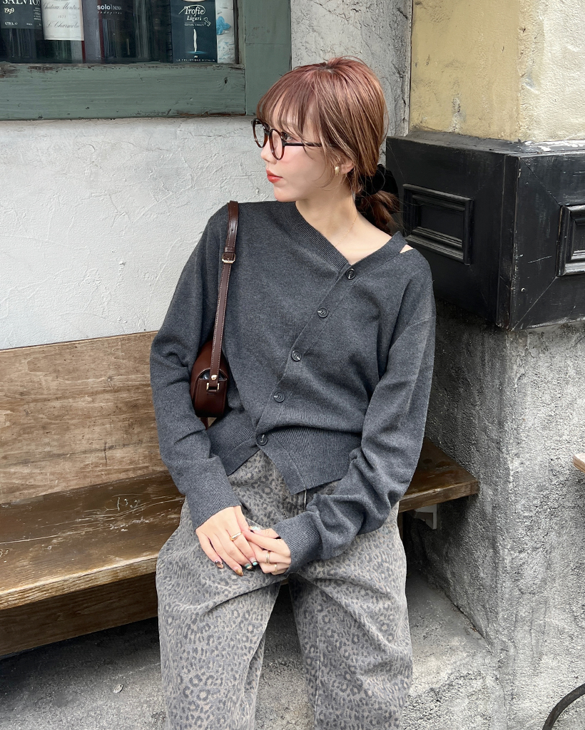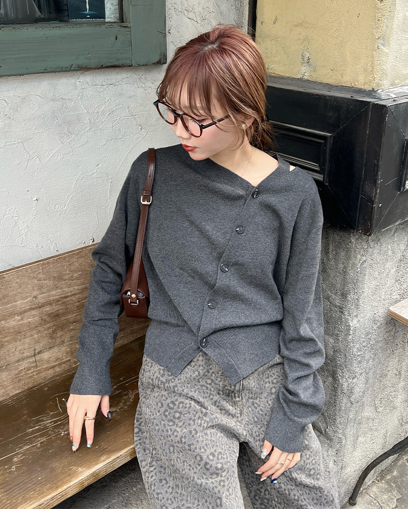 斜めラインのボタンディテールでカーディガンを着ているように見えますが、