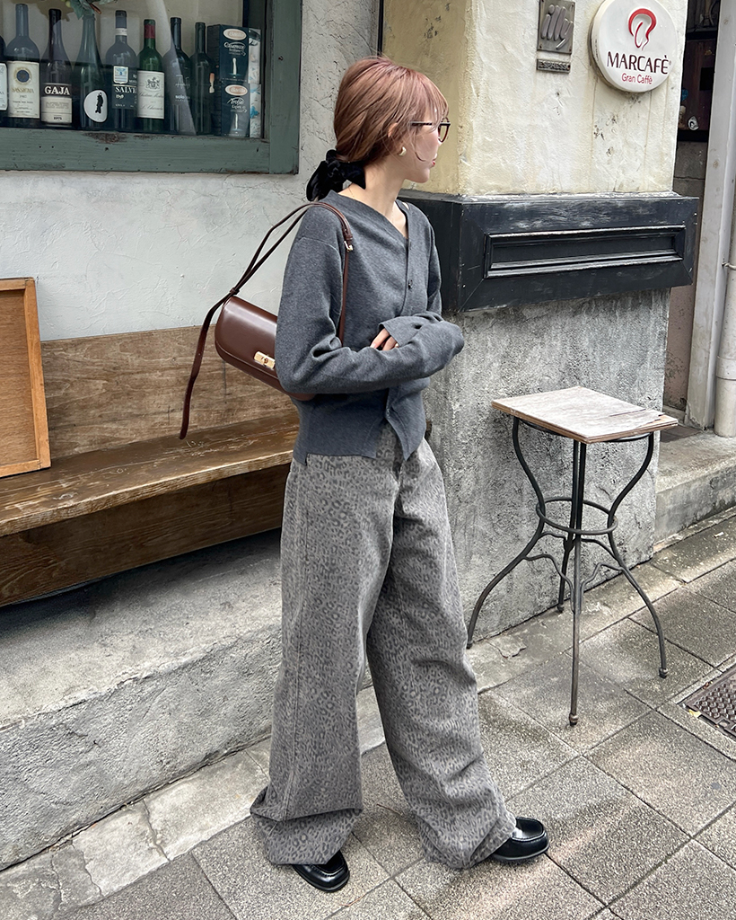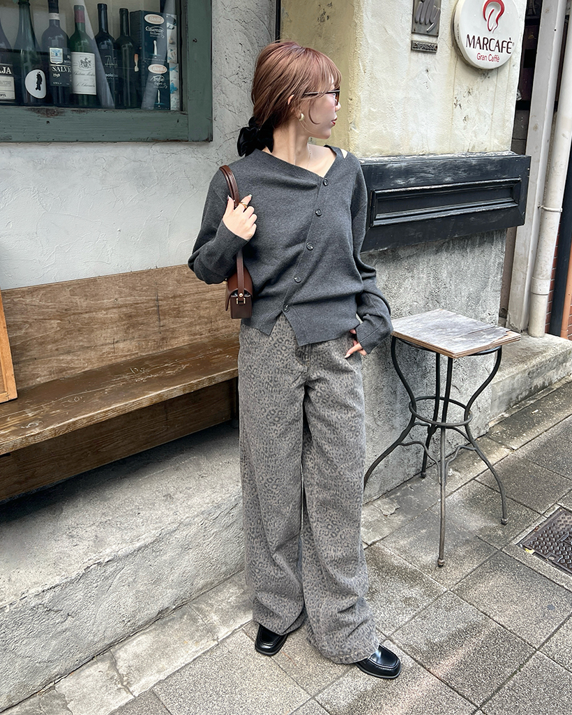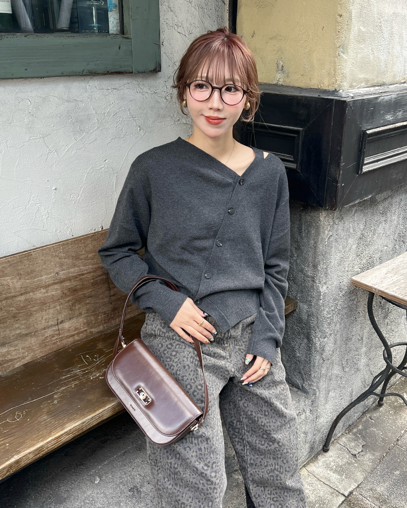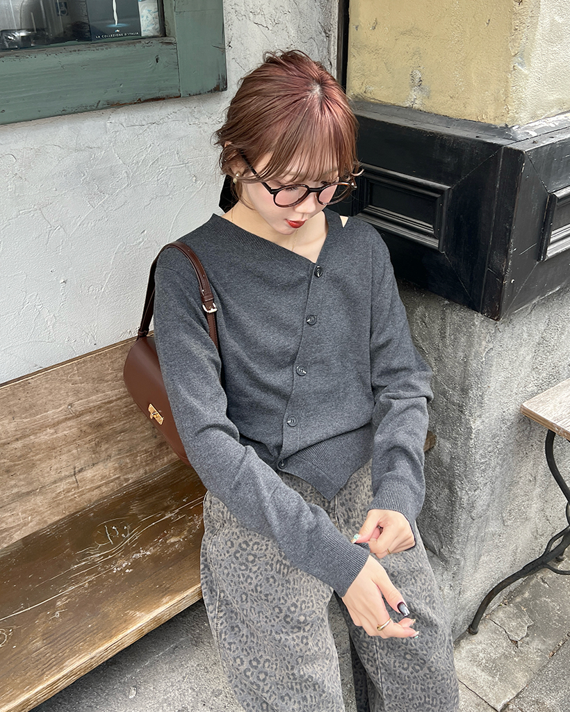 斜めラインのボタンディテールでカーディガンを着ているように見えますが、