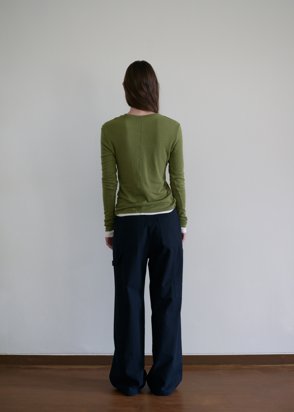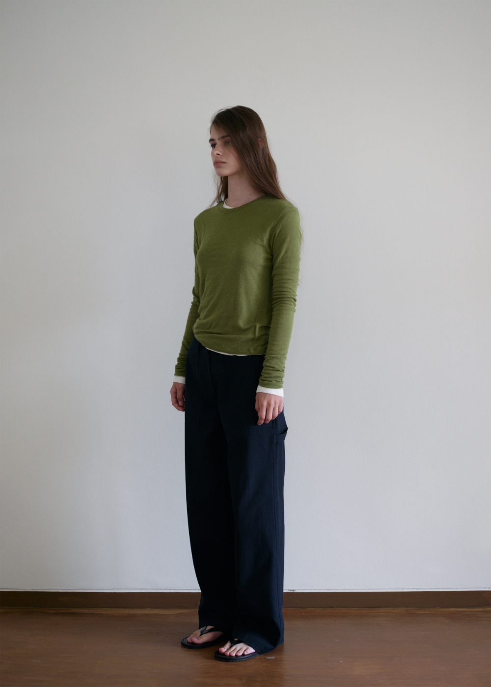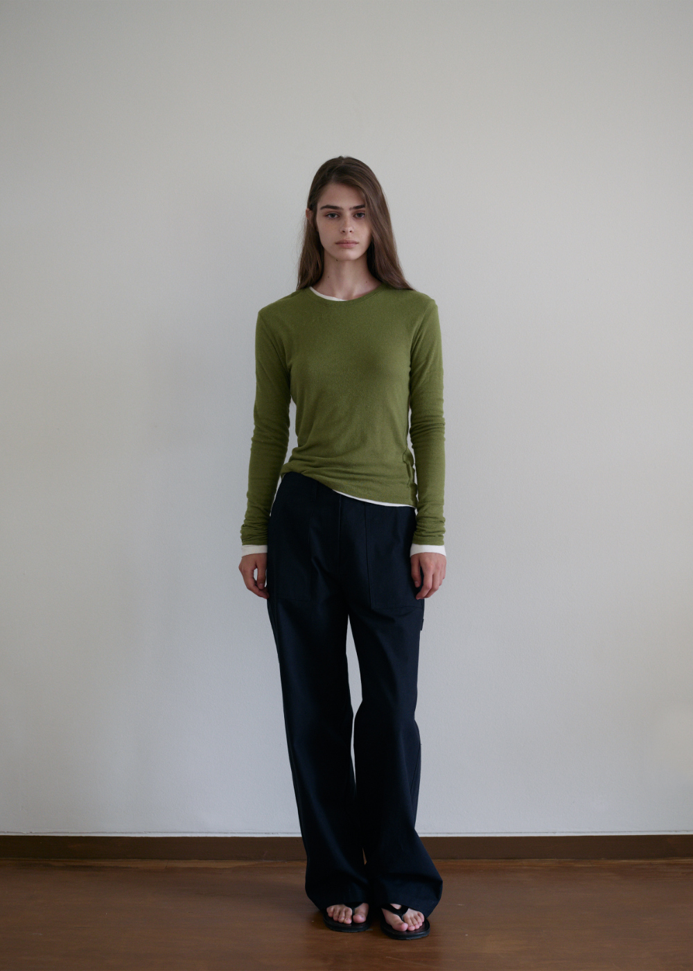 端境期には一枚で、冬場にはニットやシャツのインナーとしてレイヤードしやすく、スタイリングの幅が広がる一着。