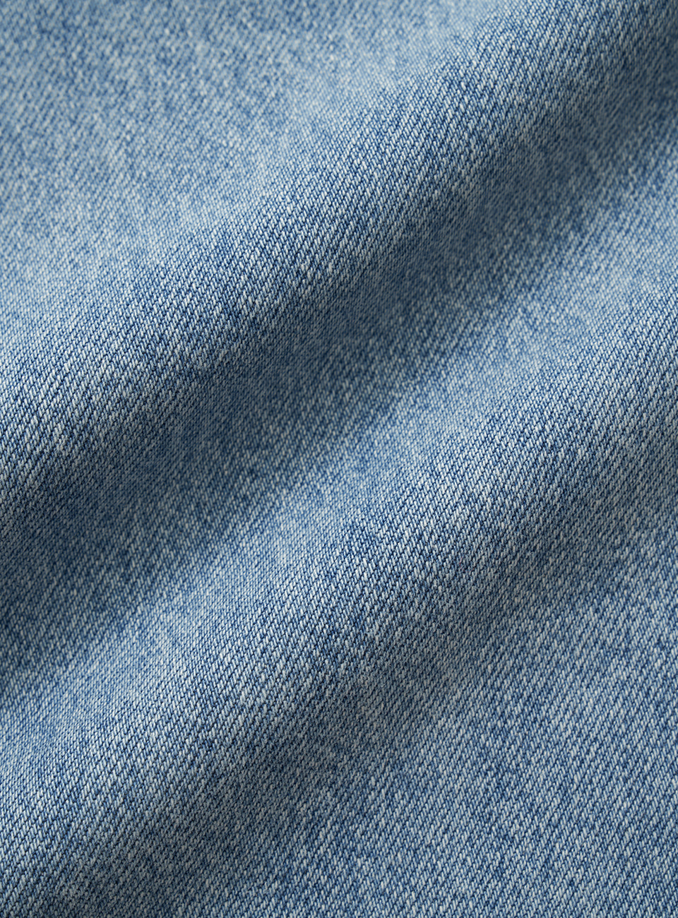 "ライトブルーカラーの自然なフェード感が際立つコットンデニムファブリック。