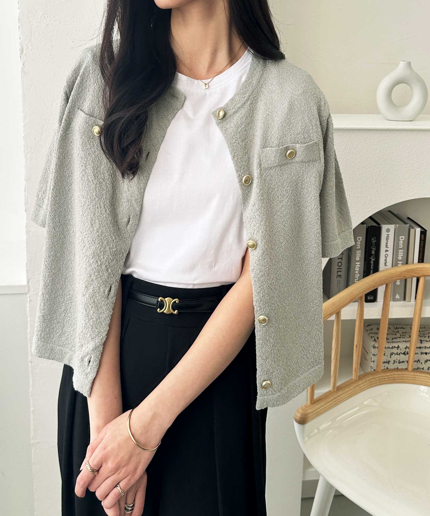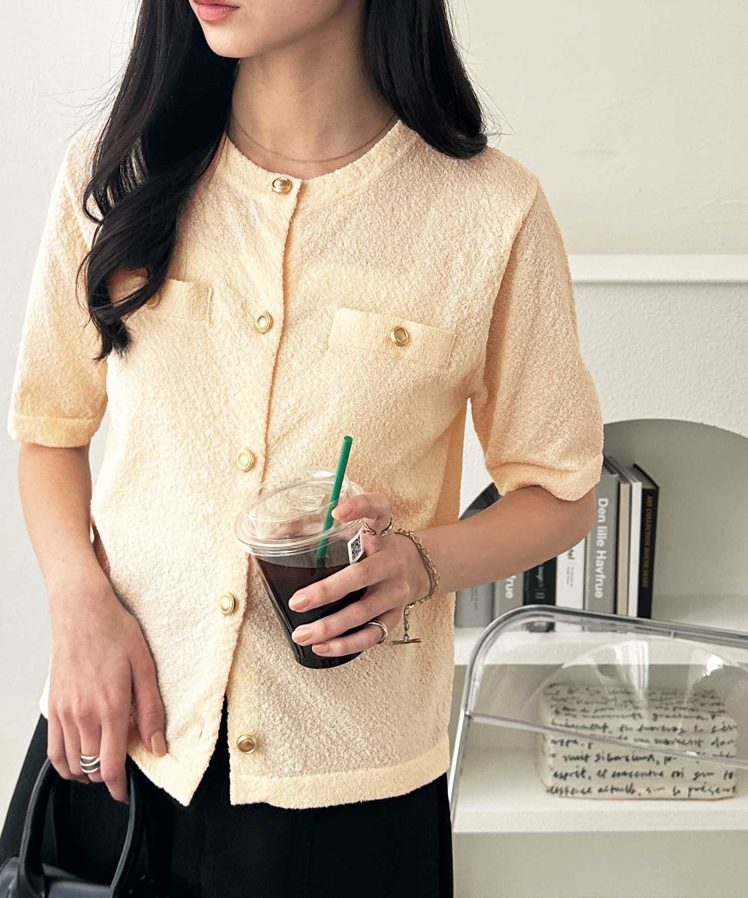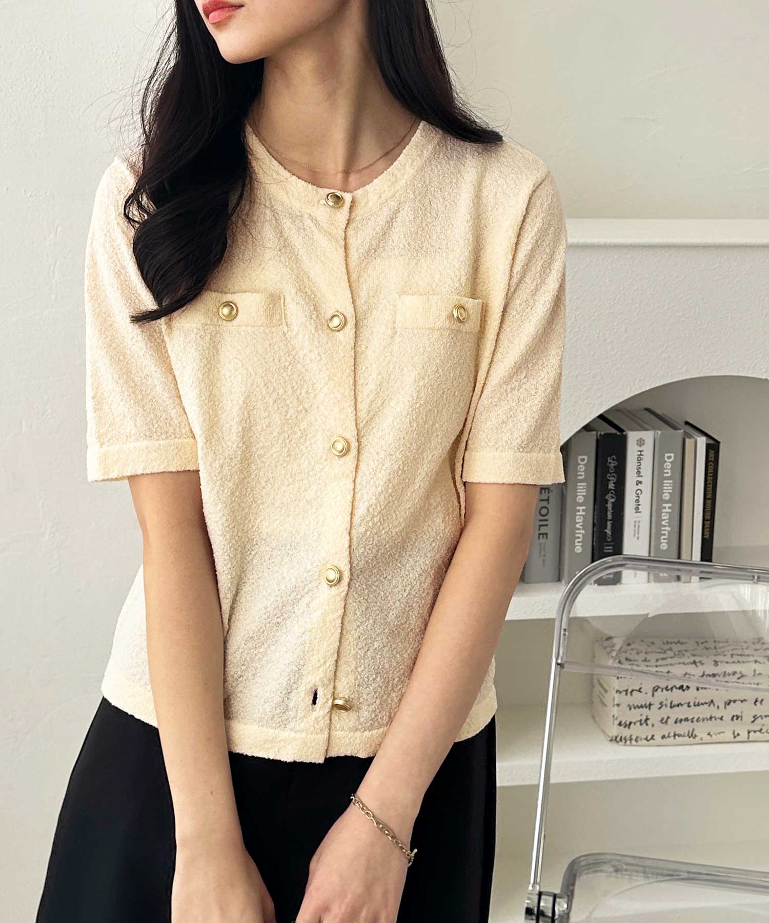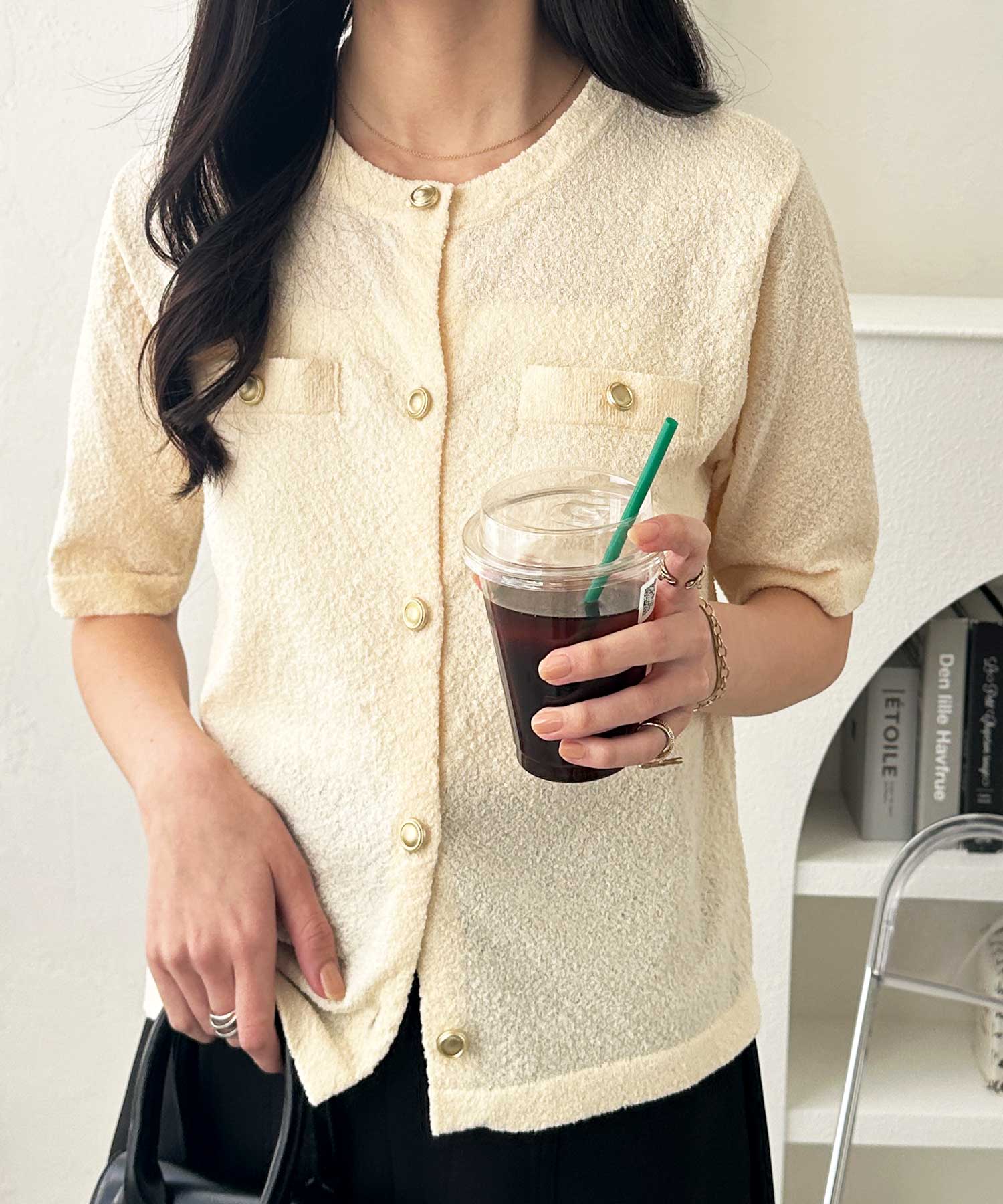 ゴールドボタンと胸のミニポケットがアクセント、羽織るだけでトラッドな印象にしてくれるサマーニットトップス。