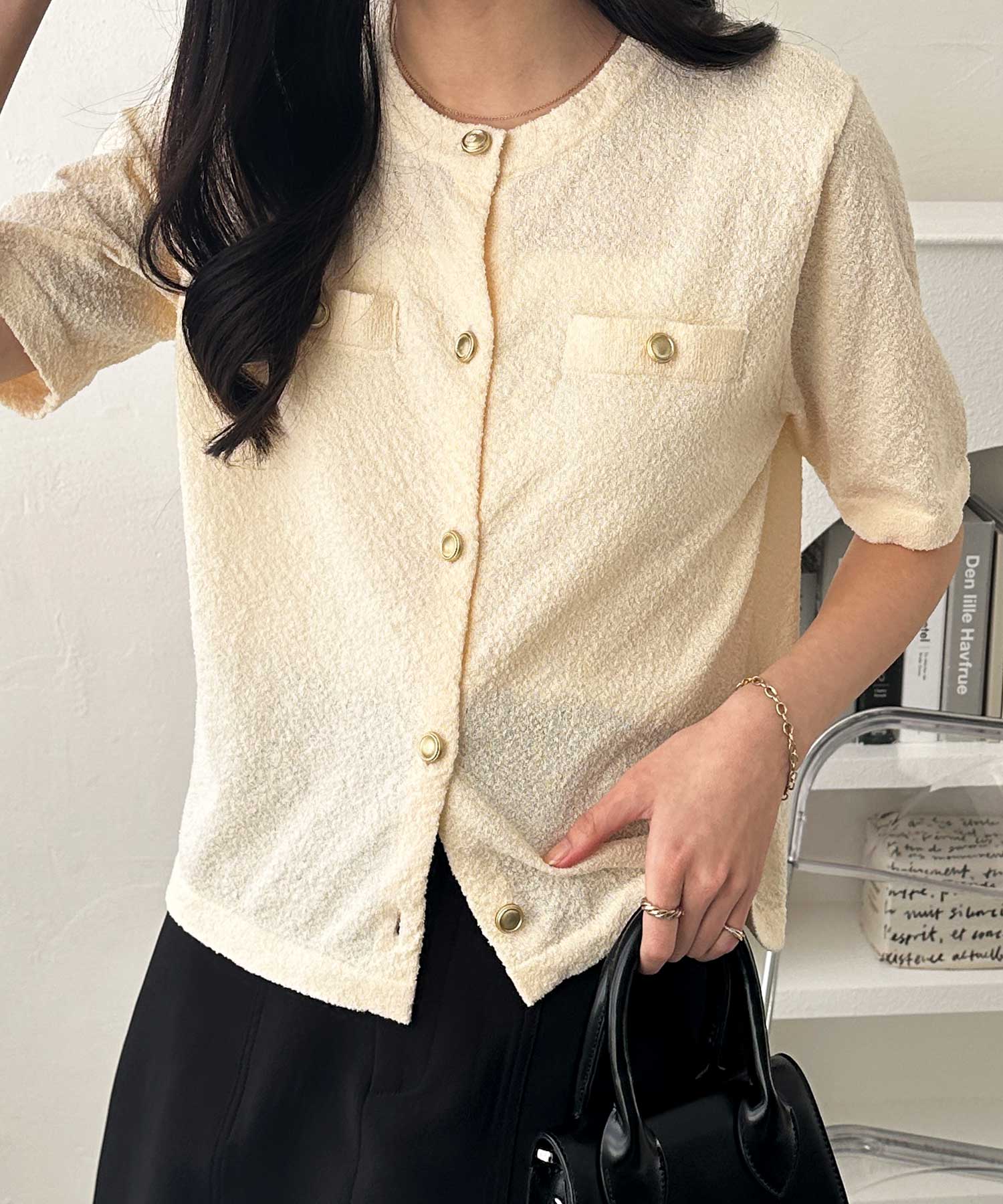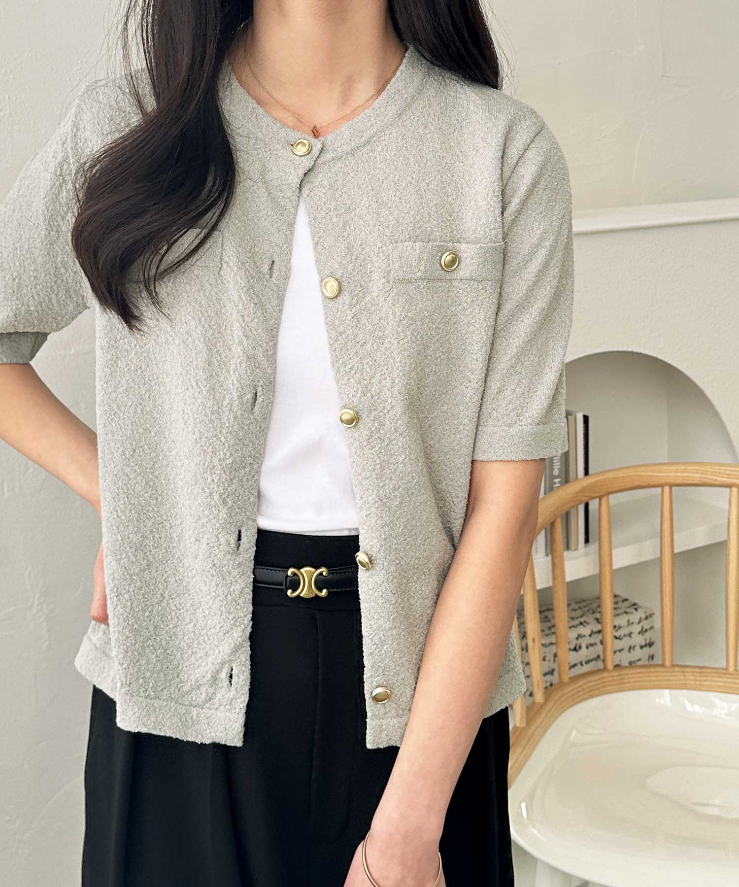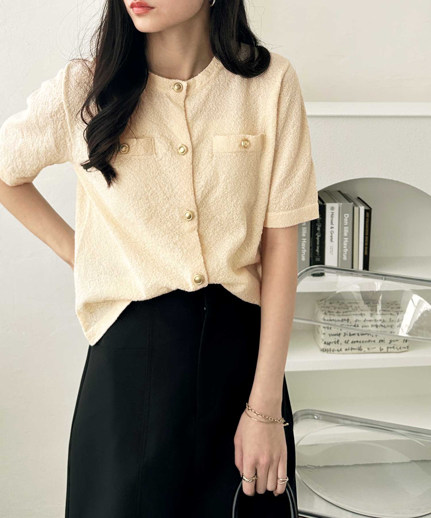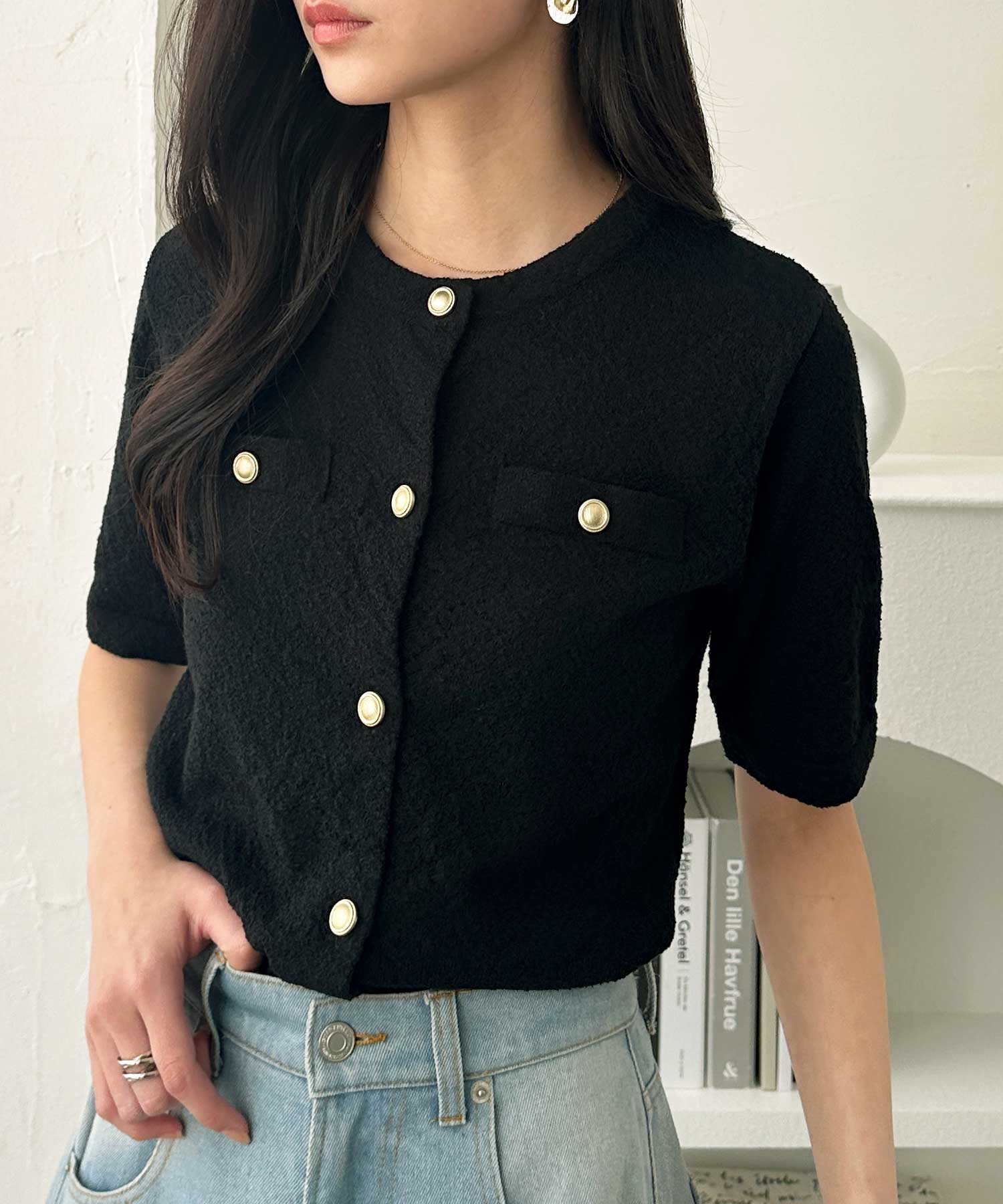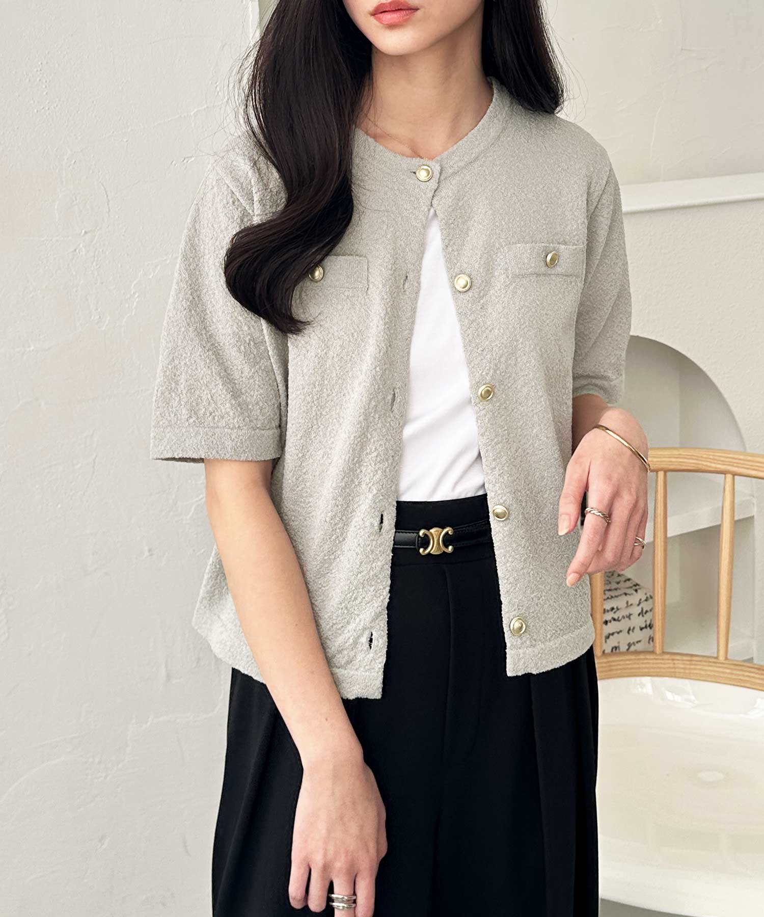 ゴールドボタンと胸のミニポケットがアクセント、羽織るだけでトラッドな印象にしてくれるサマーニットトップス。