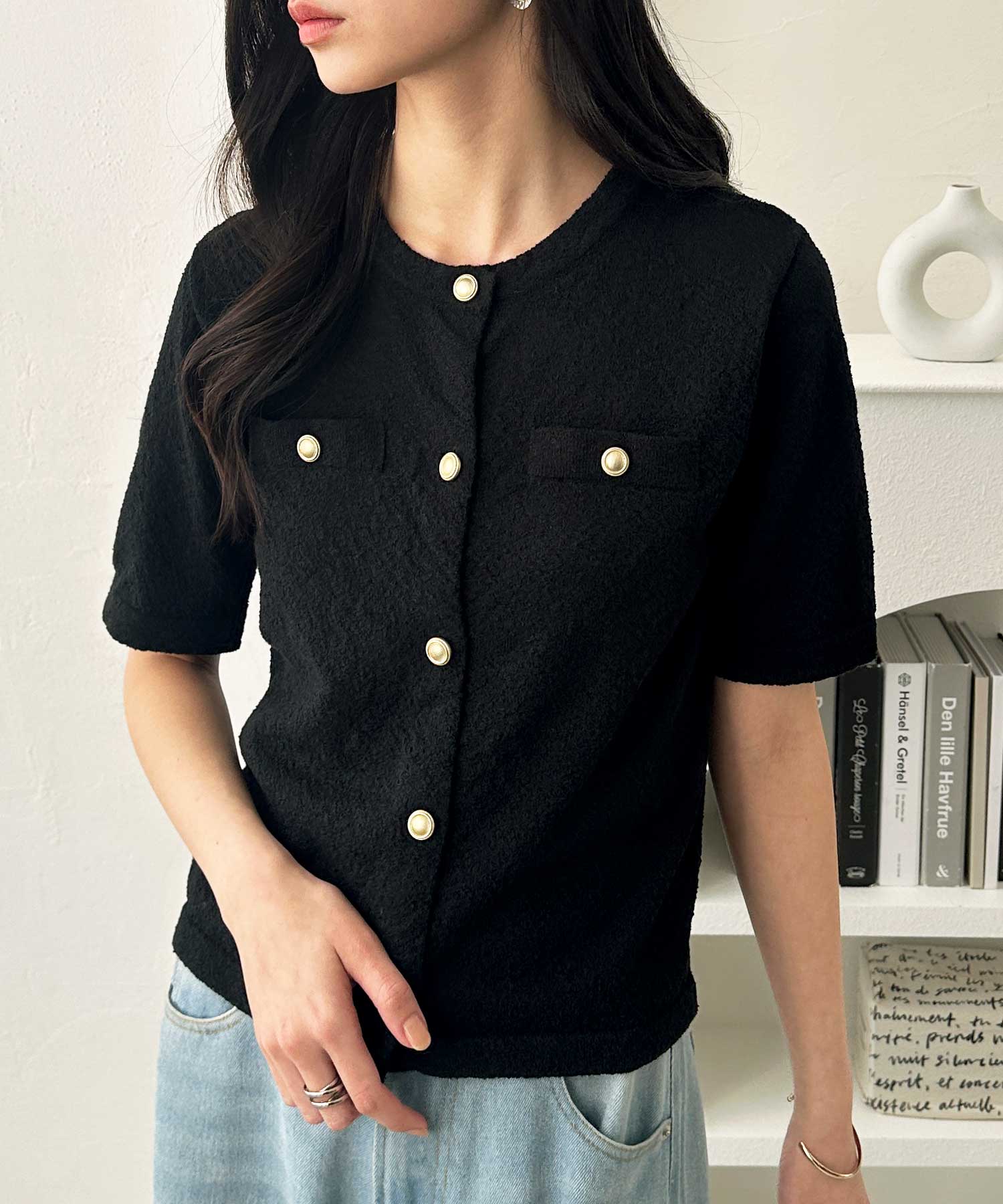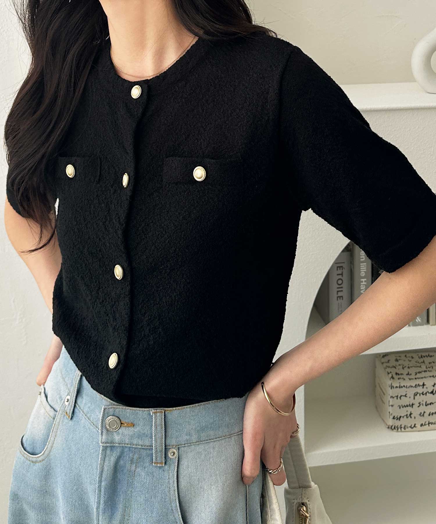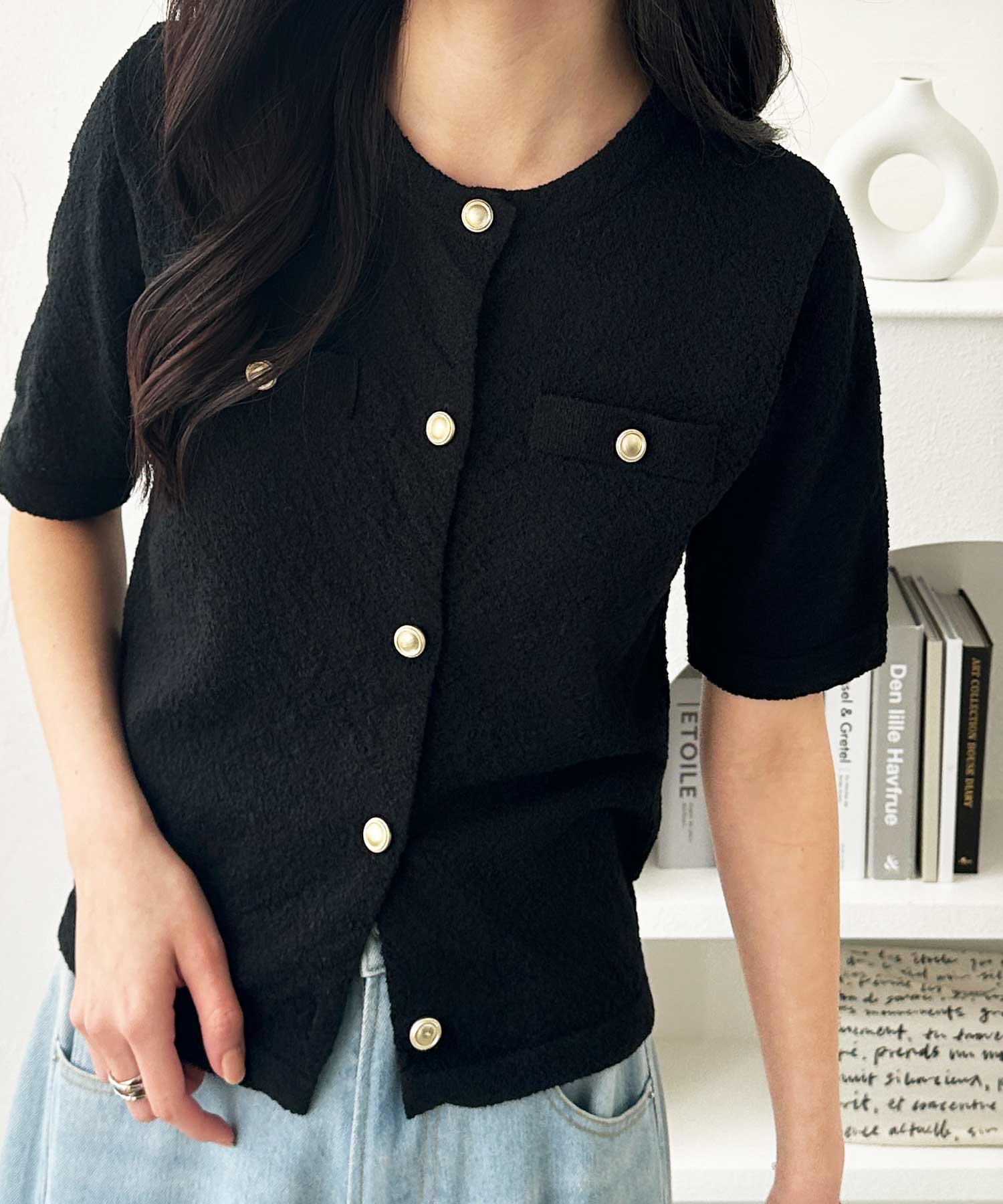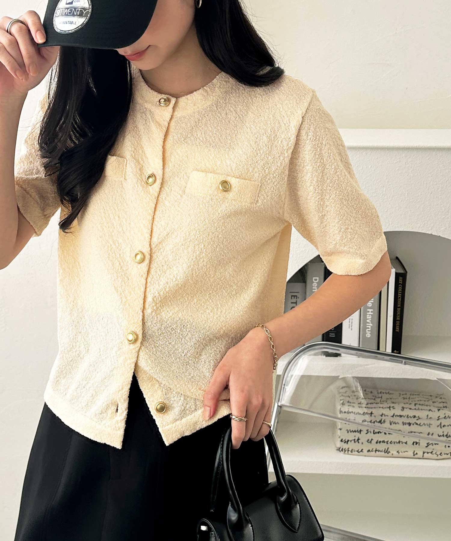 ゴールドボタンと胸のミニポケットがアクセント、羽織るだけでトラッドな印象にしてくれるサマーニットトップス。