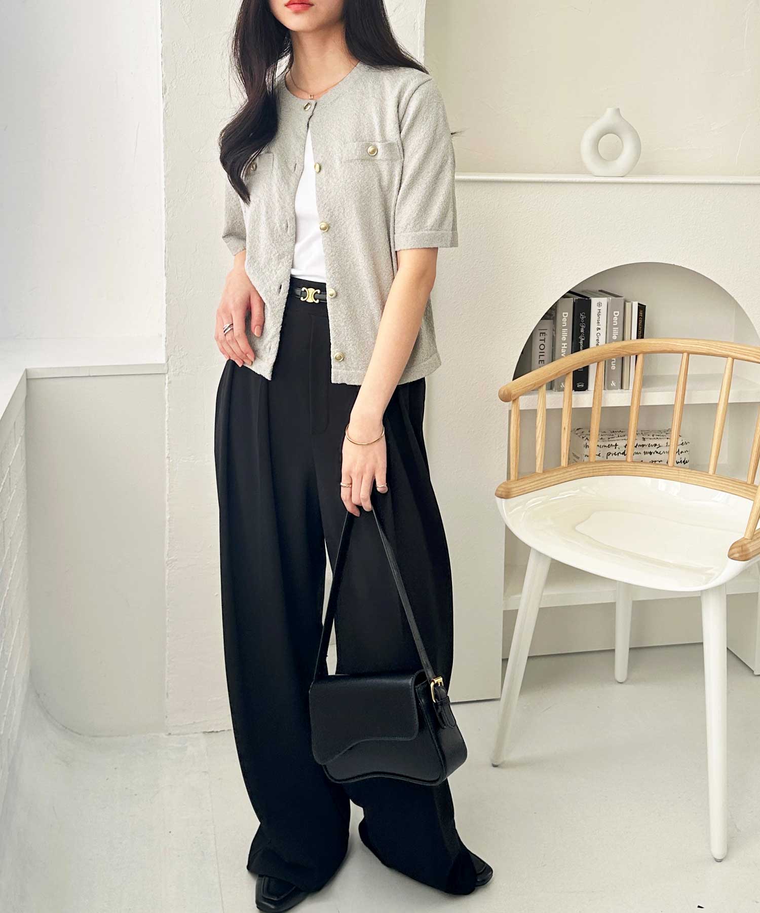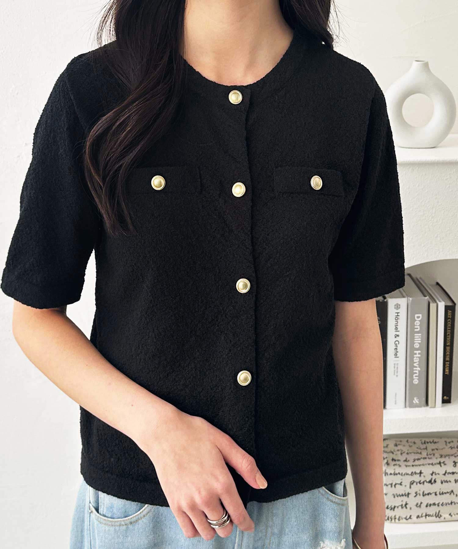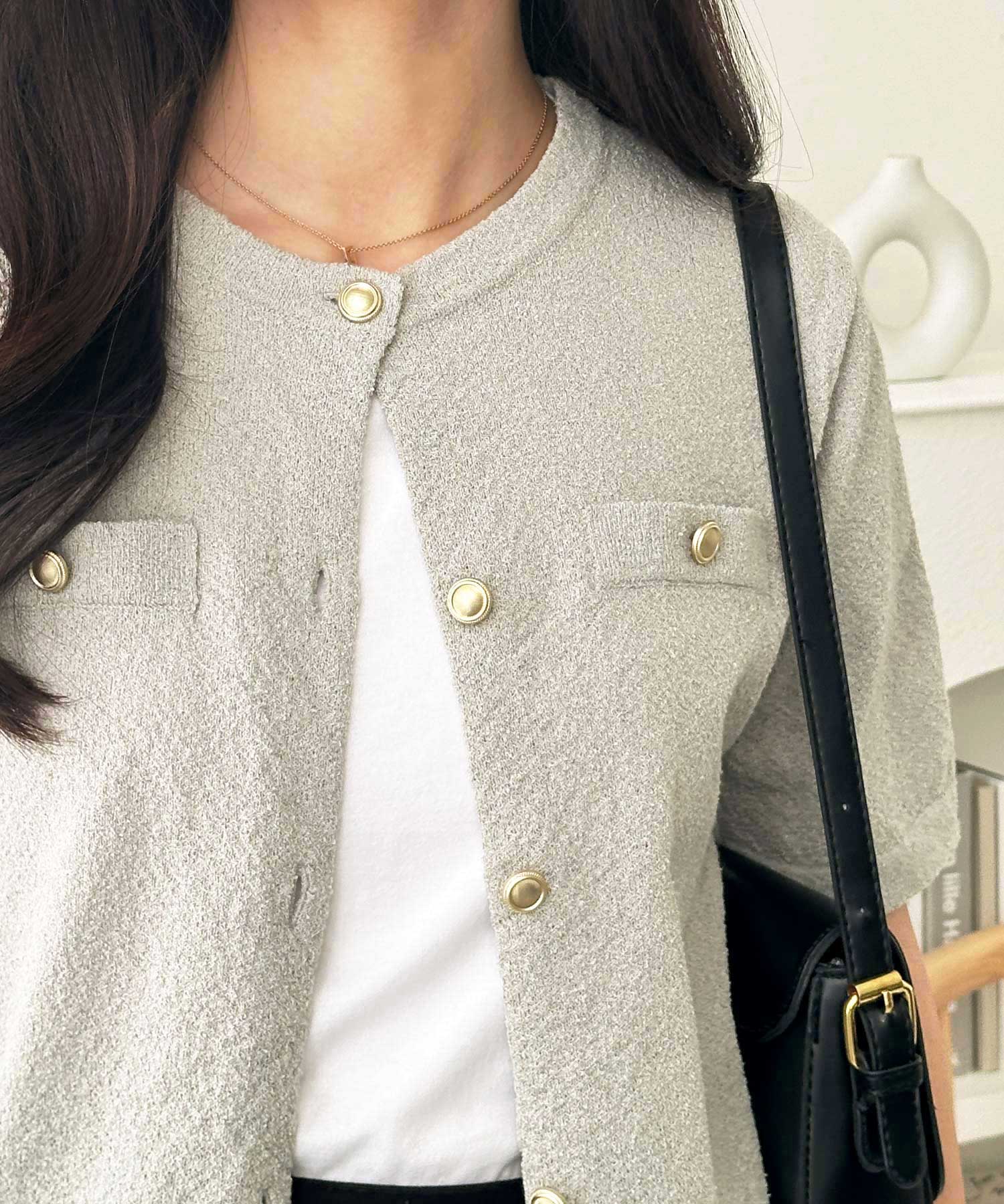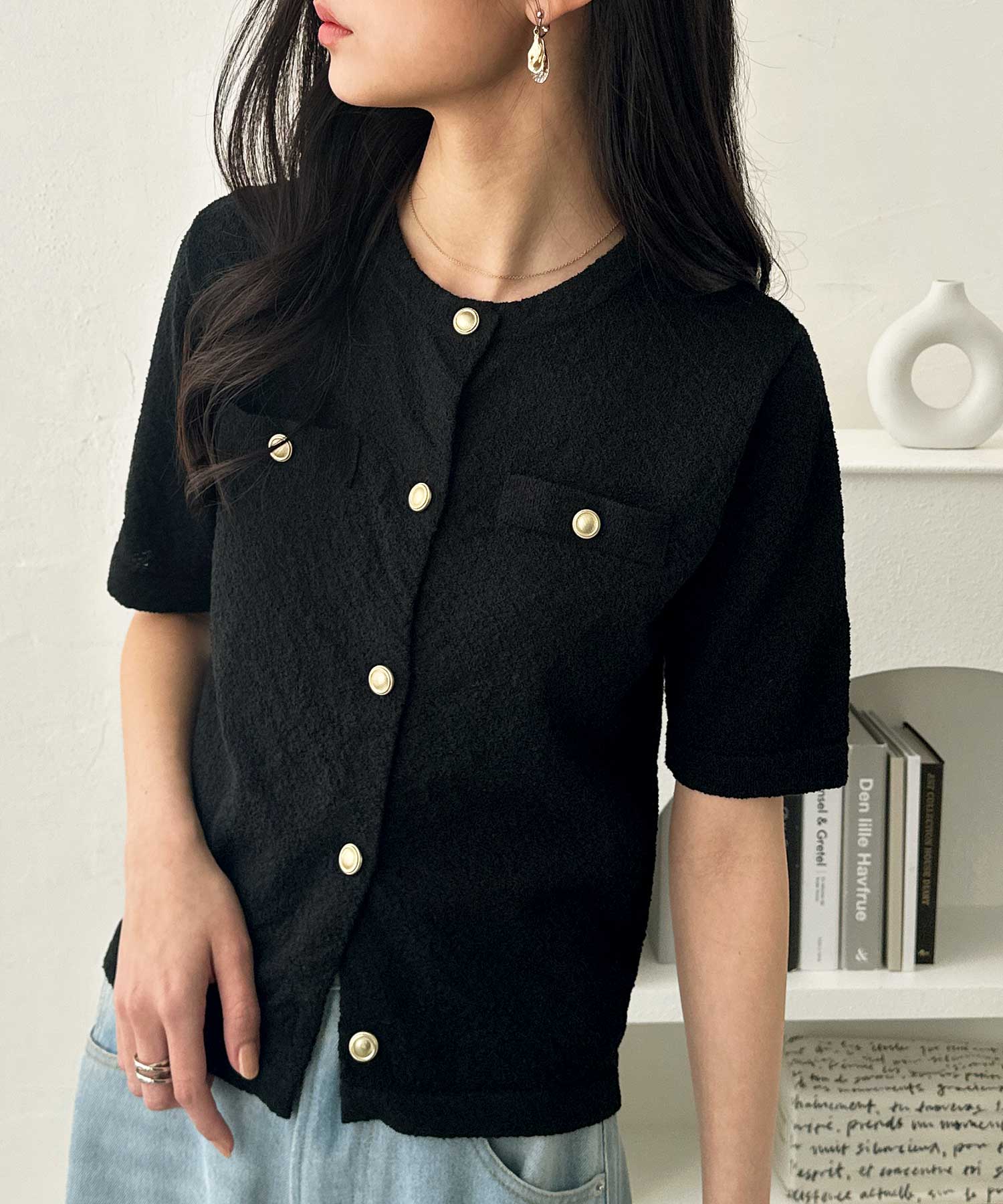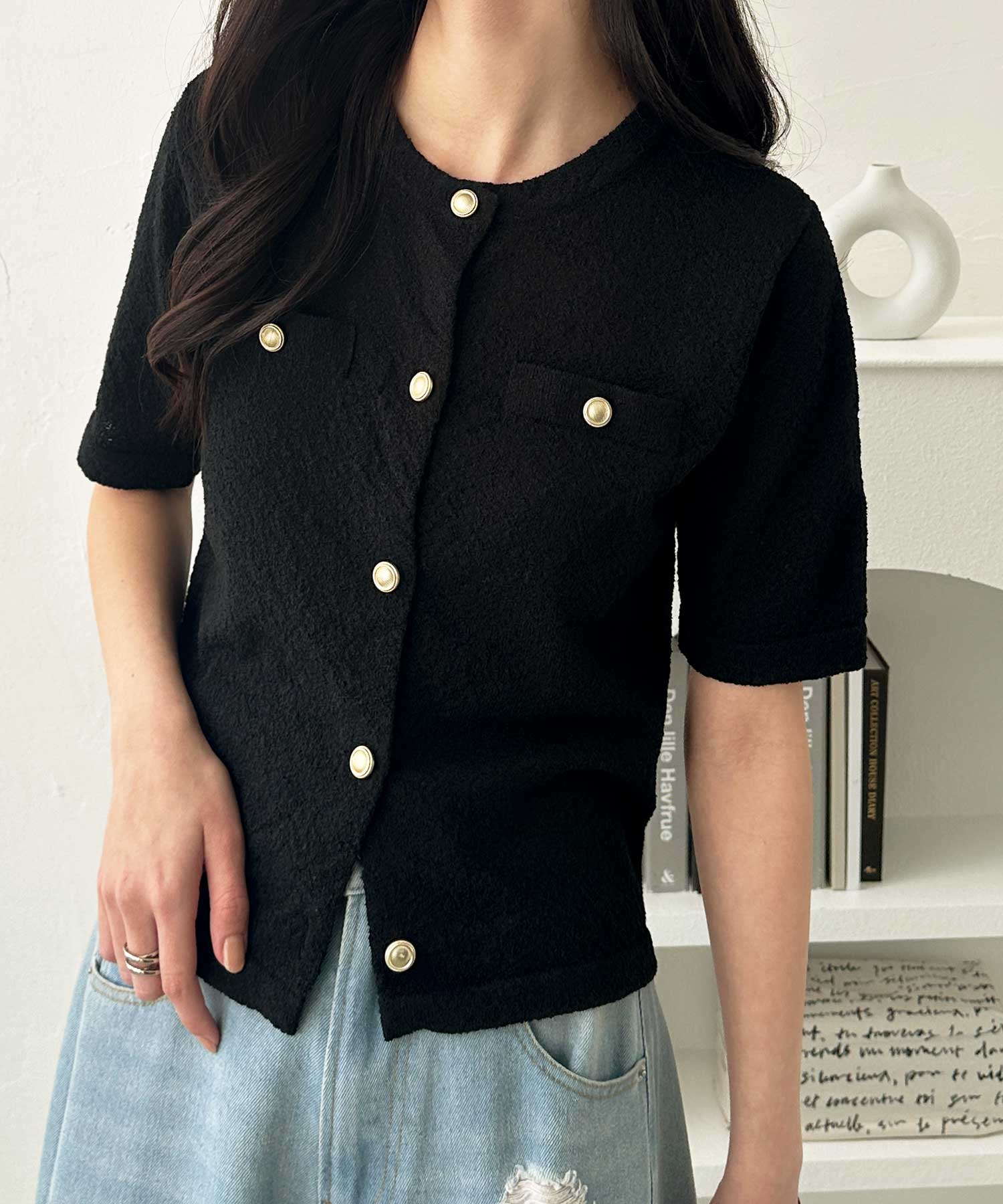 ゴールドボタンと胸のミニポケットがアクセント、羽織るだけでトラッドな印象にしてくれるサマーニットトップス。