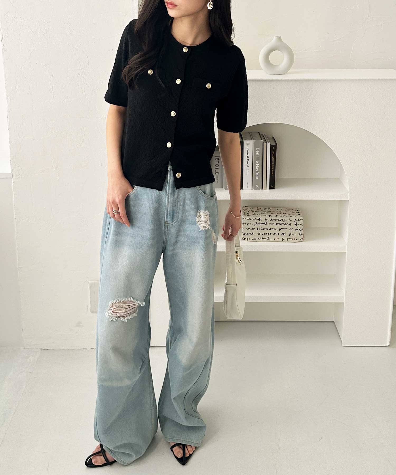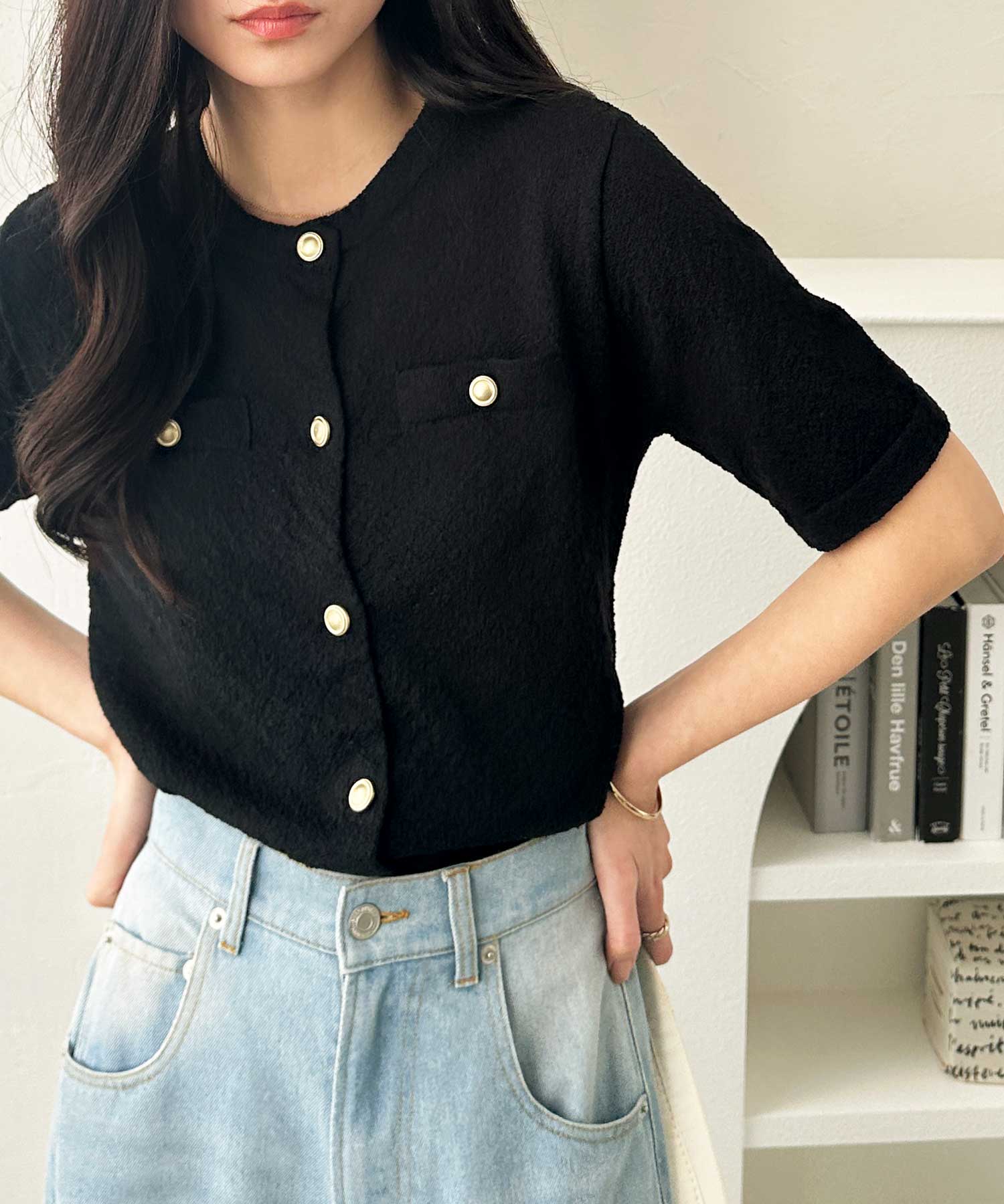 ゴールドボタン5分袖ニットカーデ