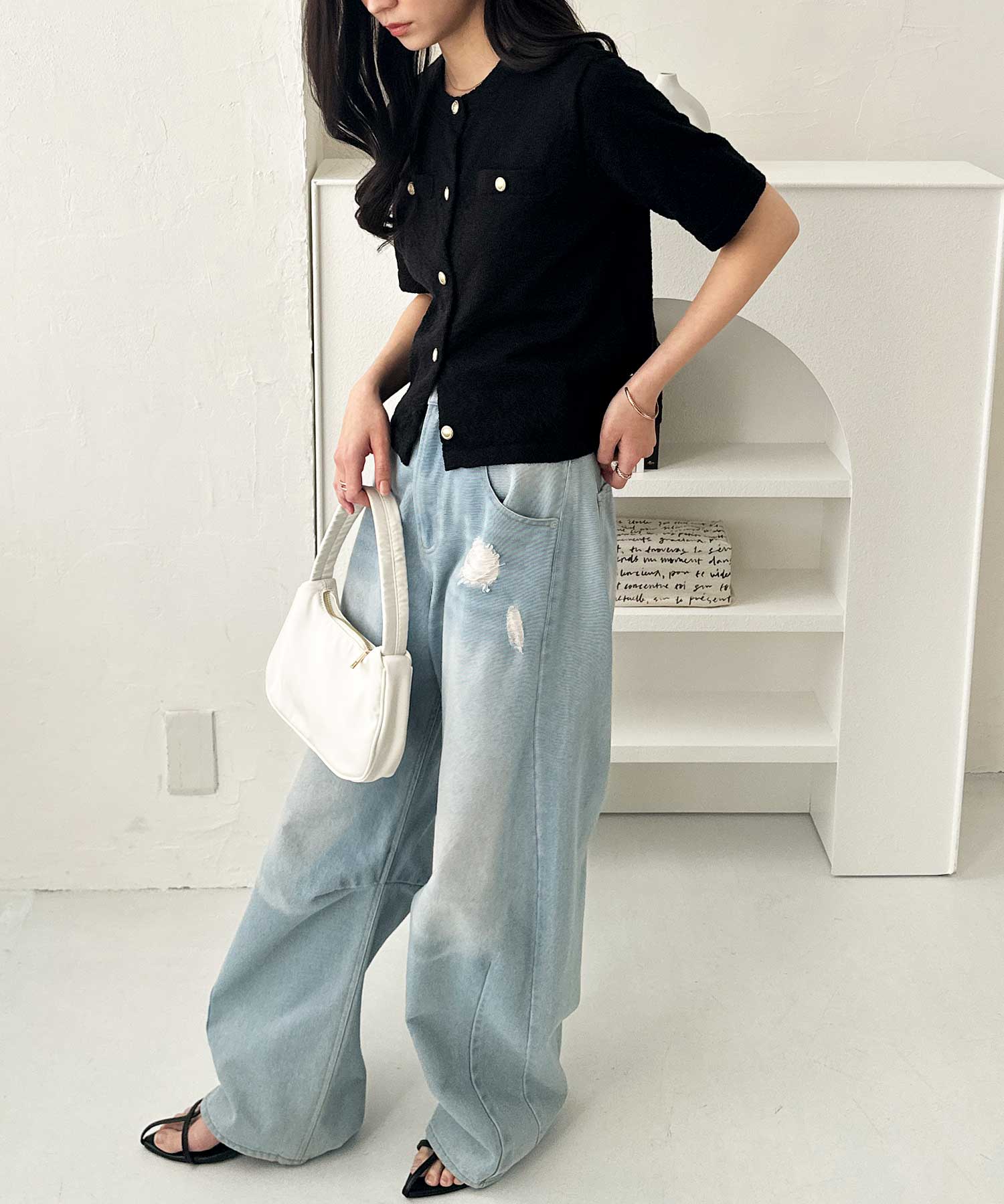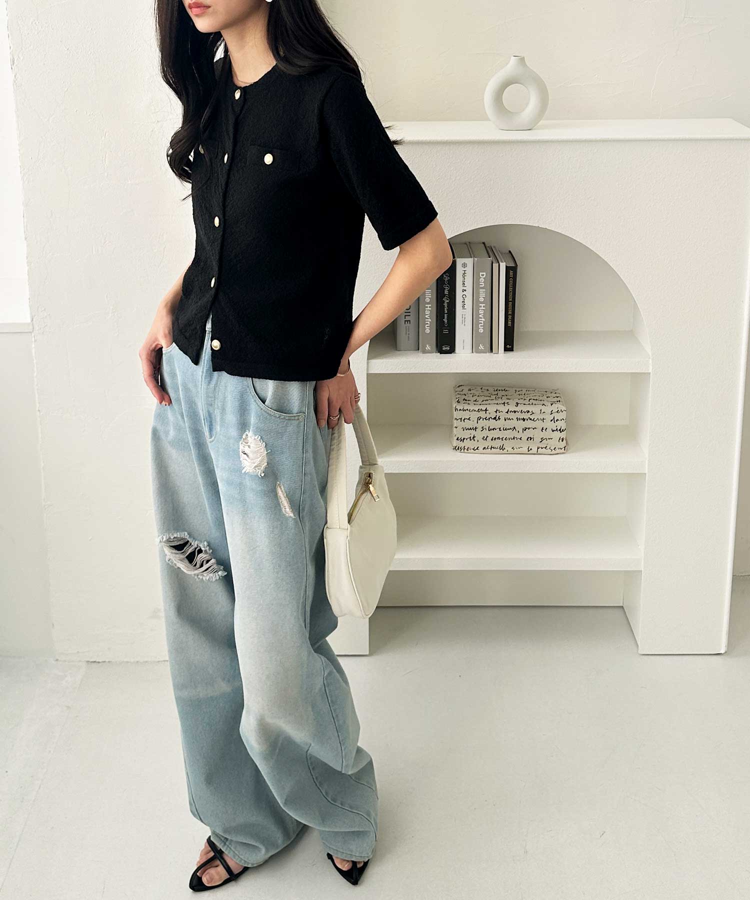 キレイめボトムだけでなく、デニムなどのカジュアルボトムとも合わせやすい!