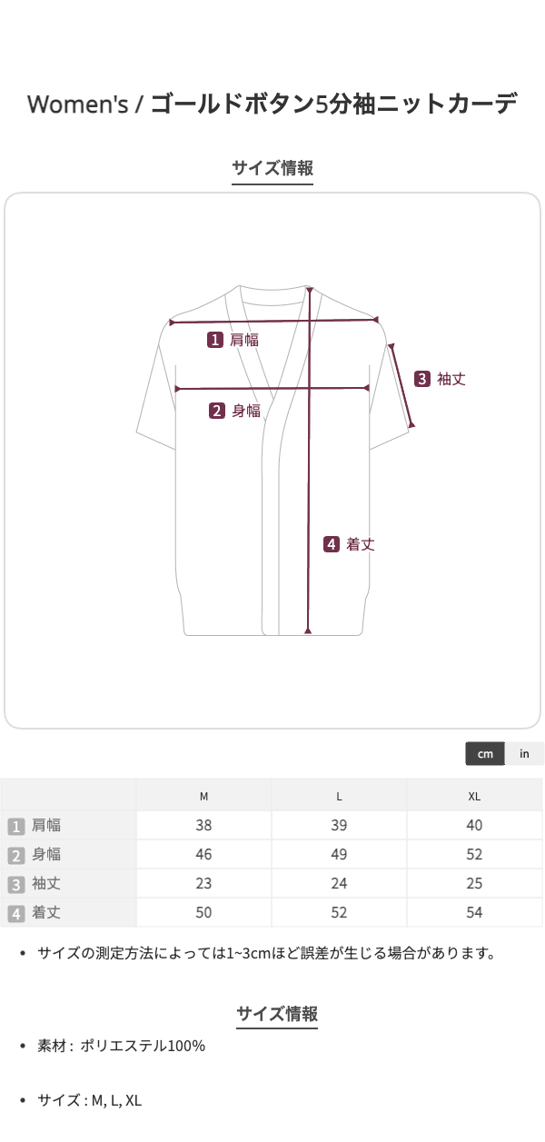 M:バスト92、肩幅38、前身丈50、袖丈23