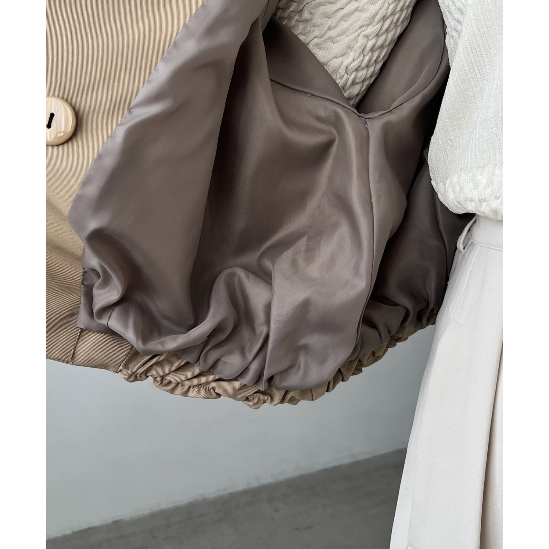 ・裾のギャザーで丸みのある立体的なシルエットに