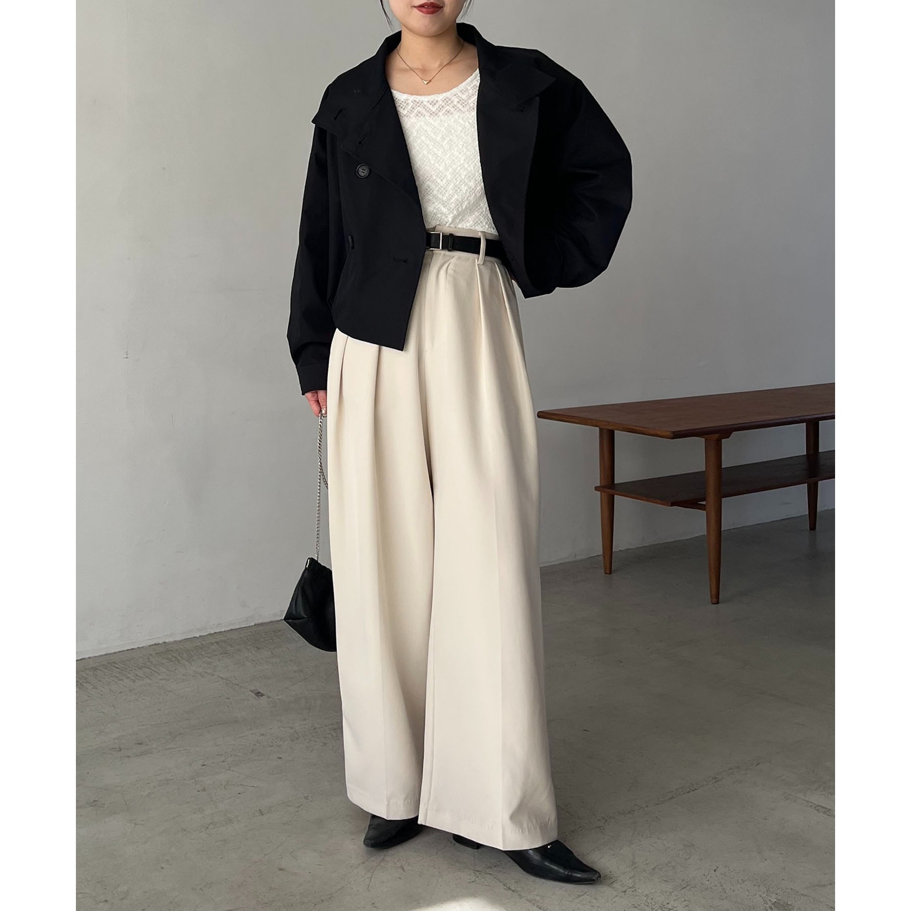 【ベージュ着用アイテム】pants:2タックワイドパンツ、inner:シャーリングニット