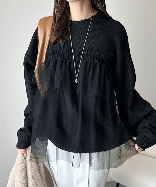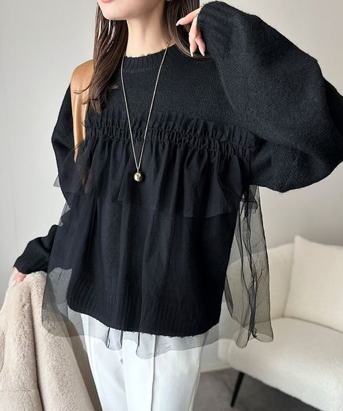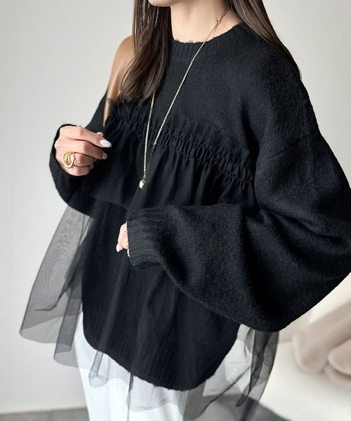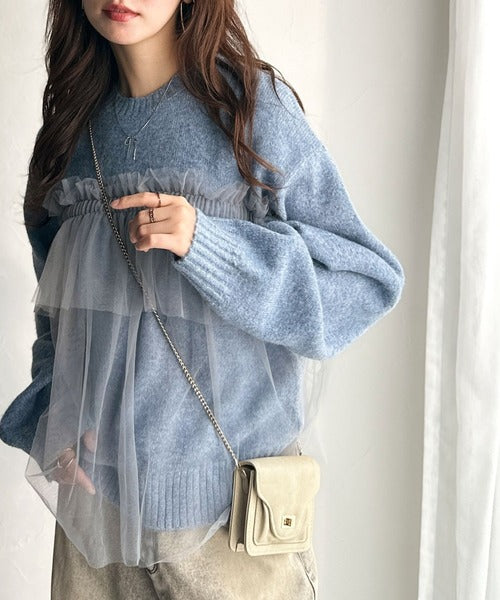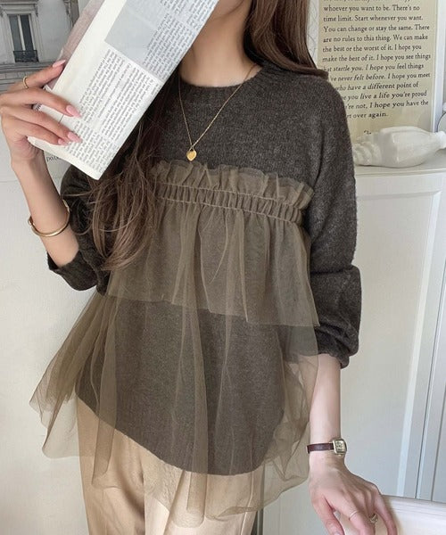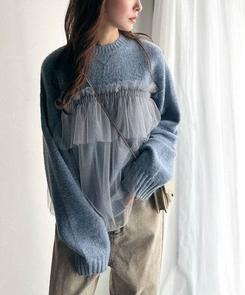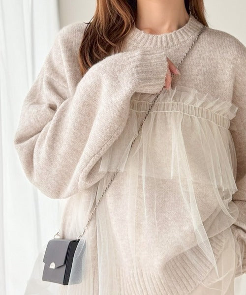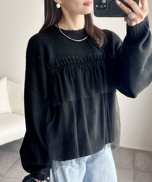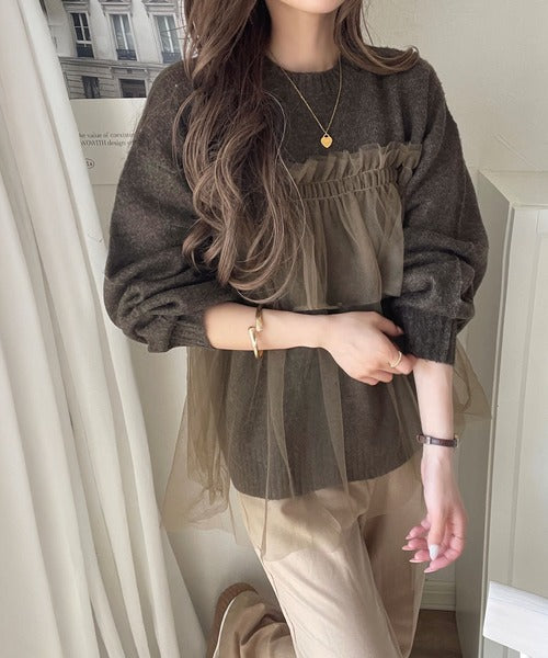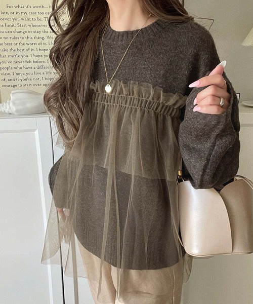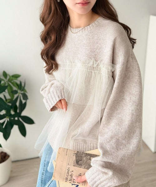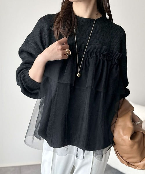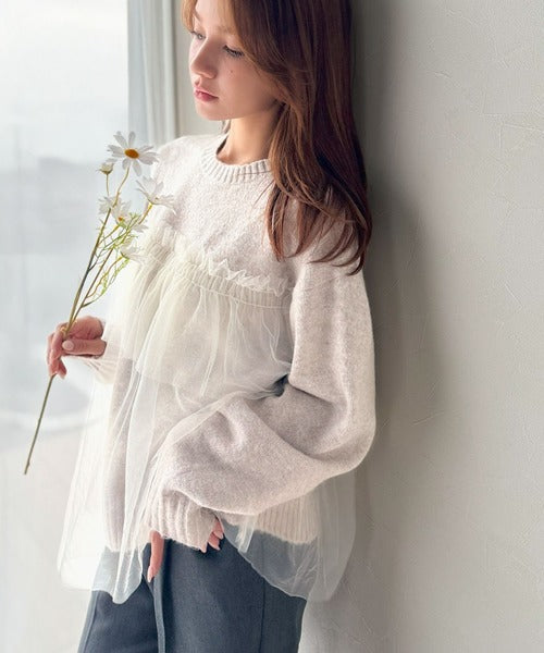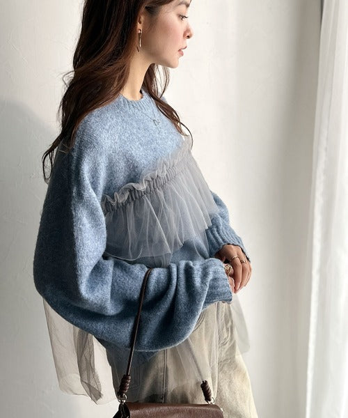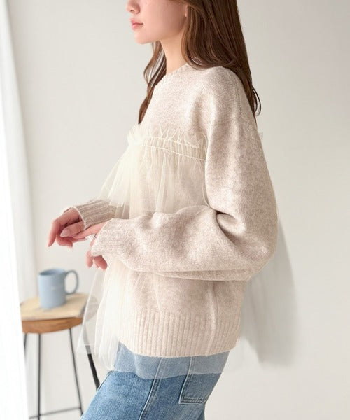 チュール素材をドッキングしたニットで、甘すぎない大人ガーリーな印象を演出。