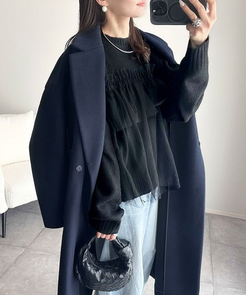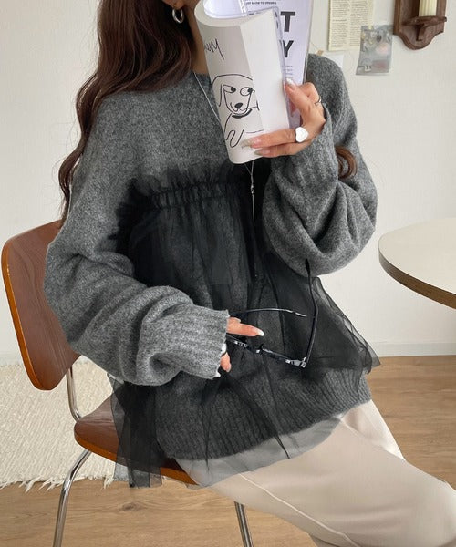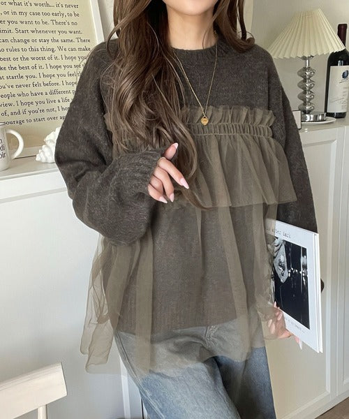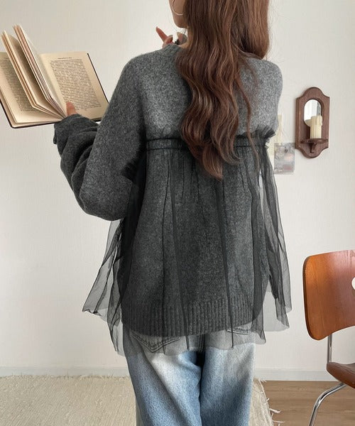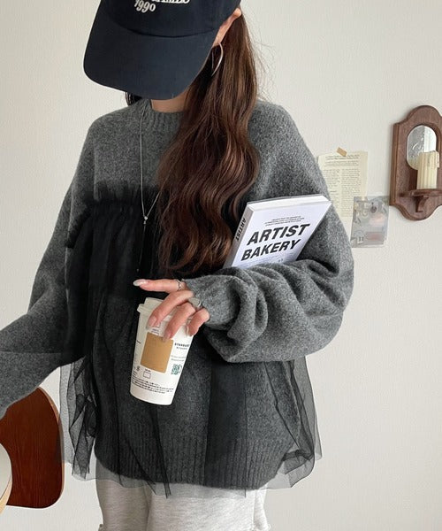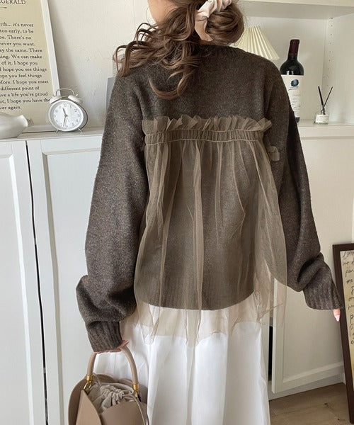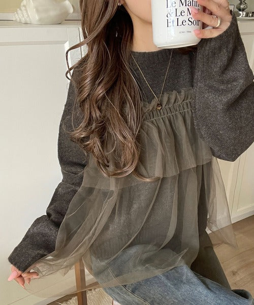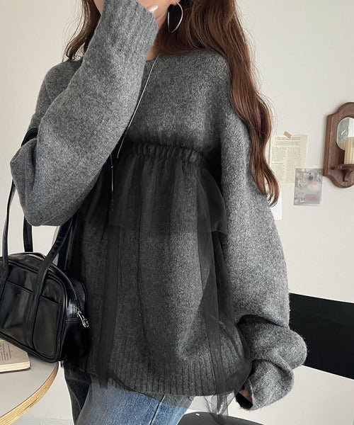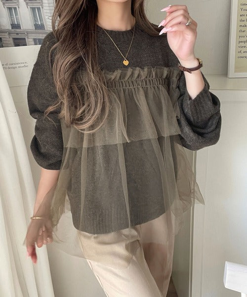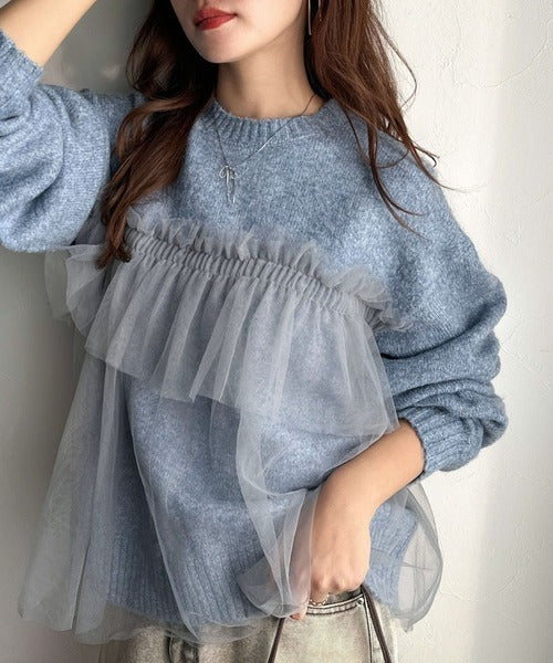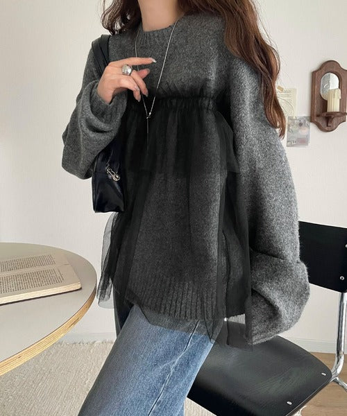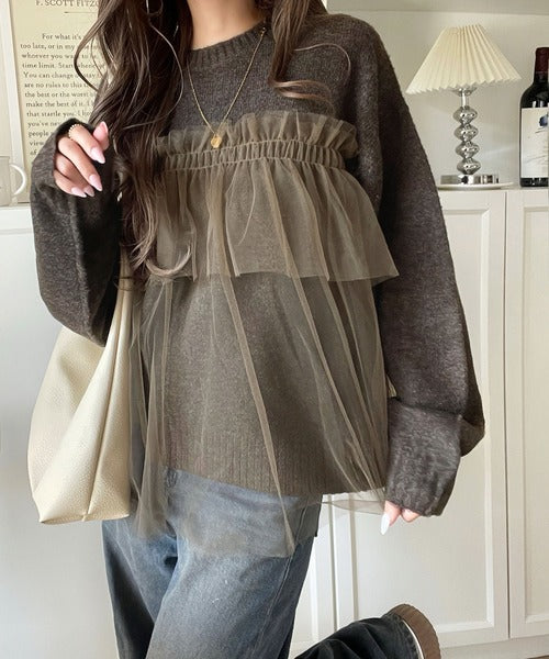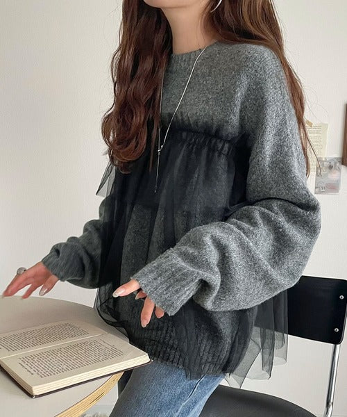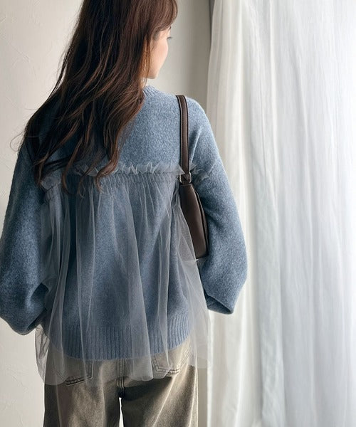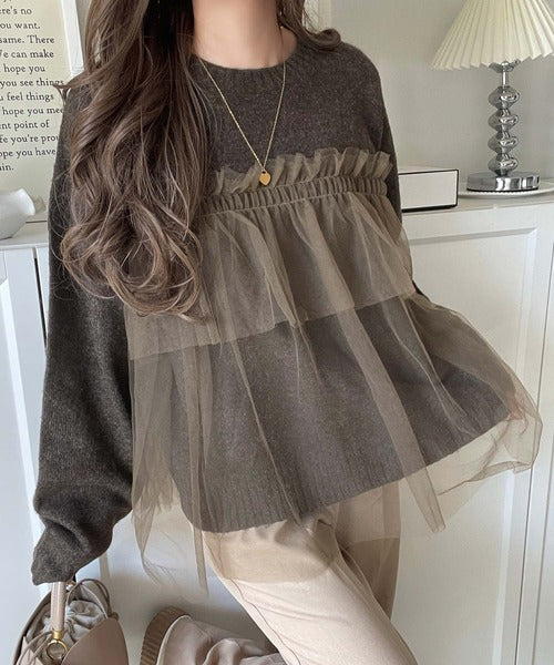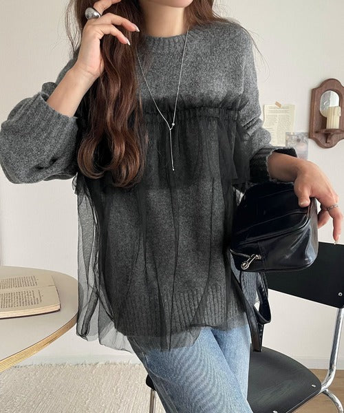 チュール素材をドッキングしたニットで、甘すぎない大人ガーリーな印象を演出。