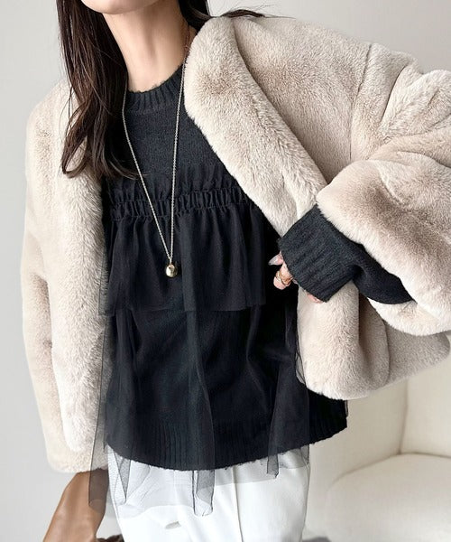 ふわふわとした手触りのニットと柔らかいチュール素材。