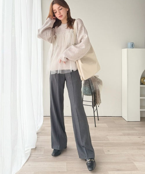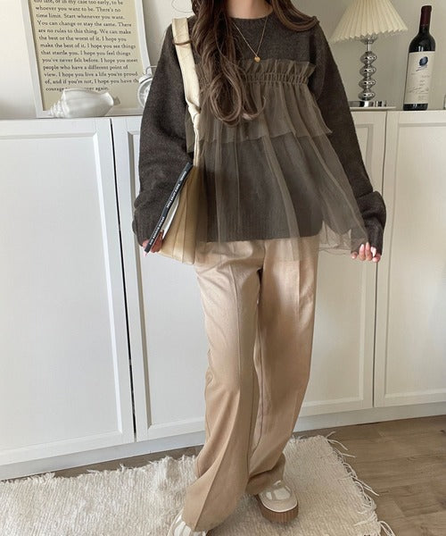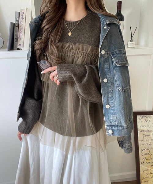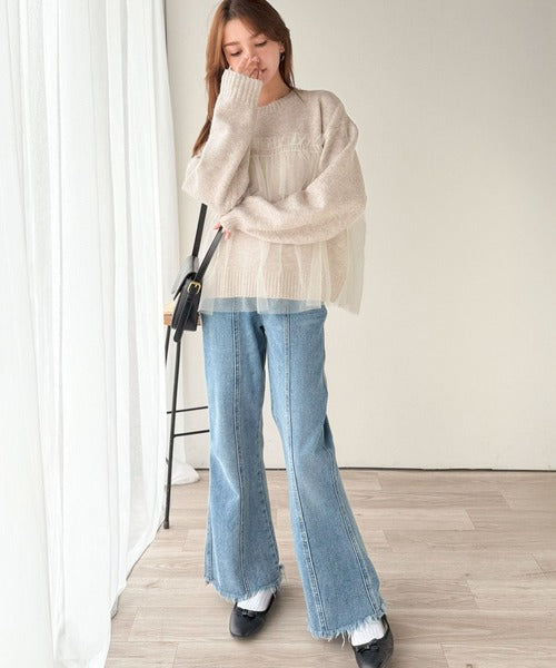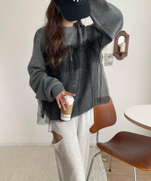 チュール素材をドッキングしたニットは、甘すぎず大人っぽいカジュアルスタイルに最適。