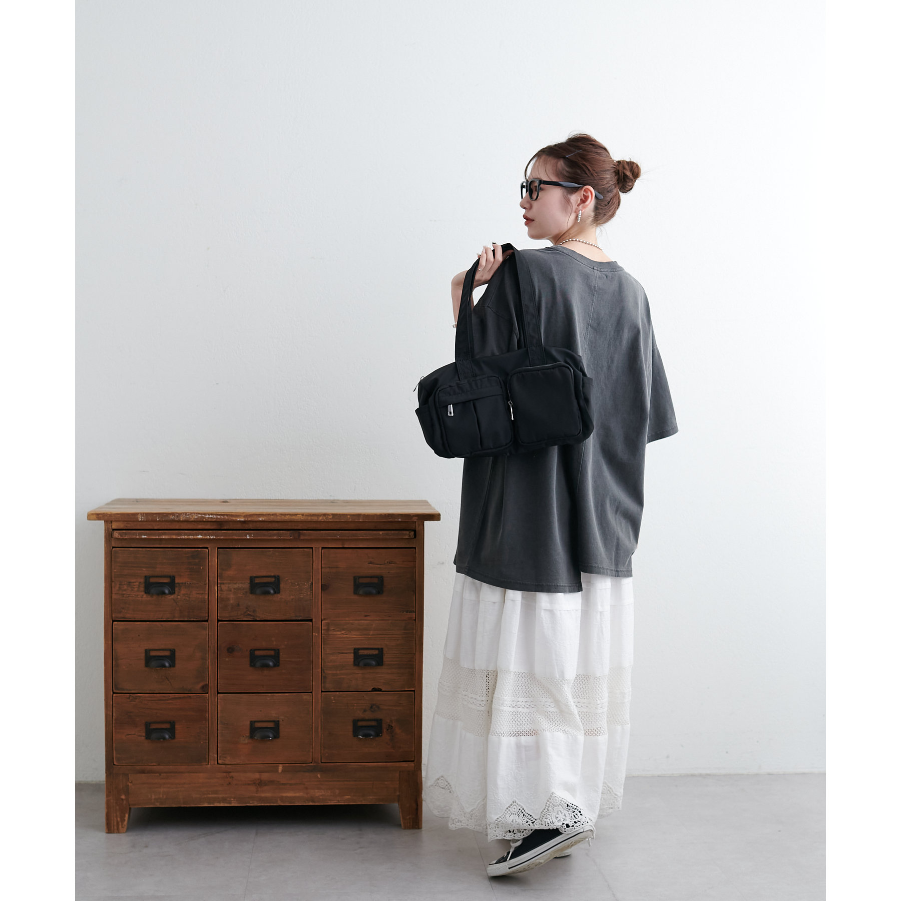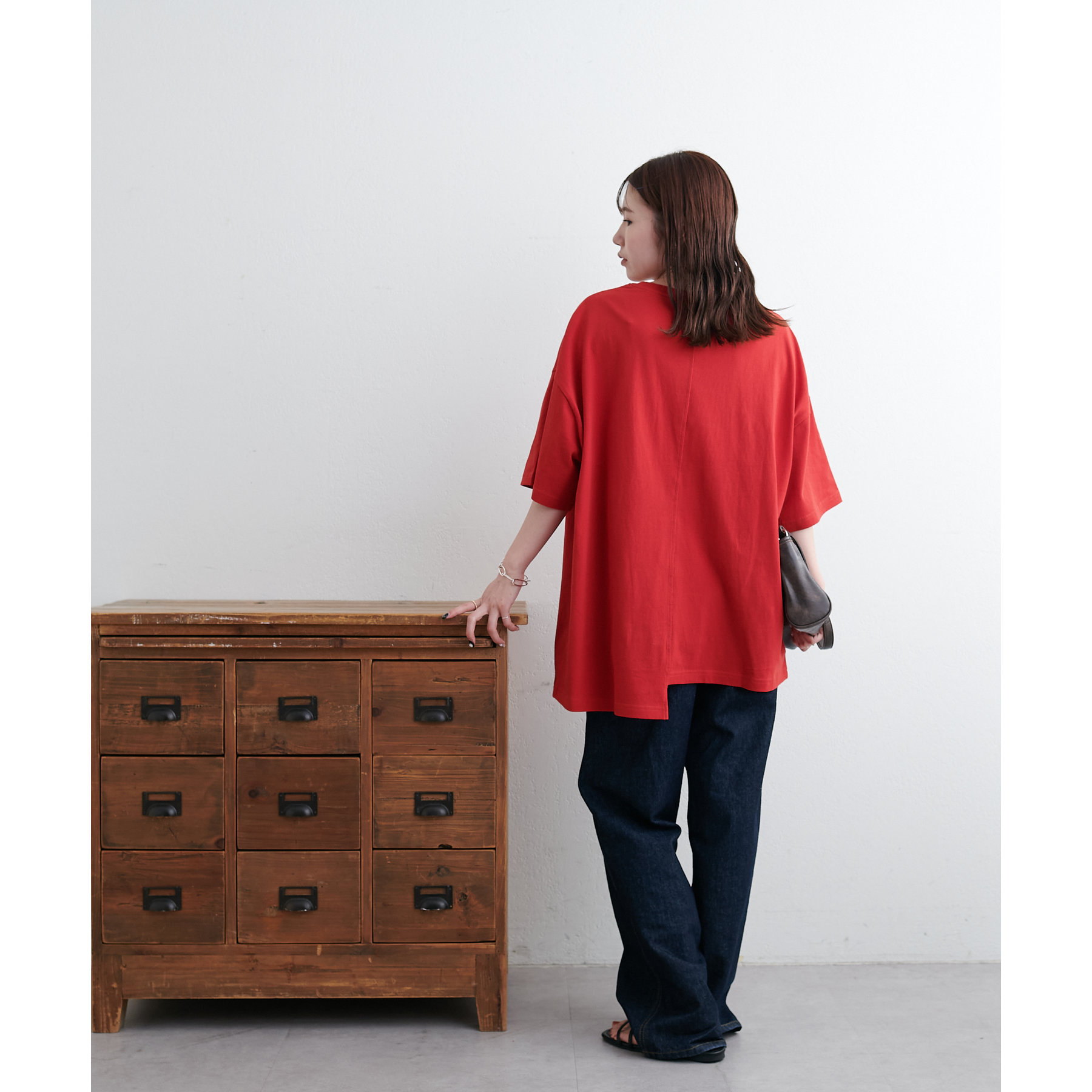 163cmスタッフ:肩が落ちたドロップショルダーに、たっぷりとゆとりを持たせたワイドボディ。着るだけでこなれ感のあるルーズなシルエットも魅力のひとつです☆