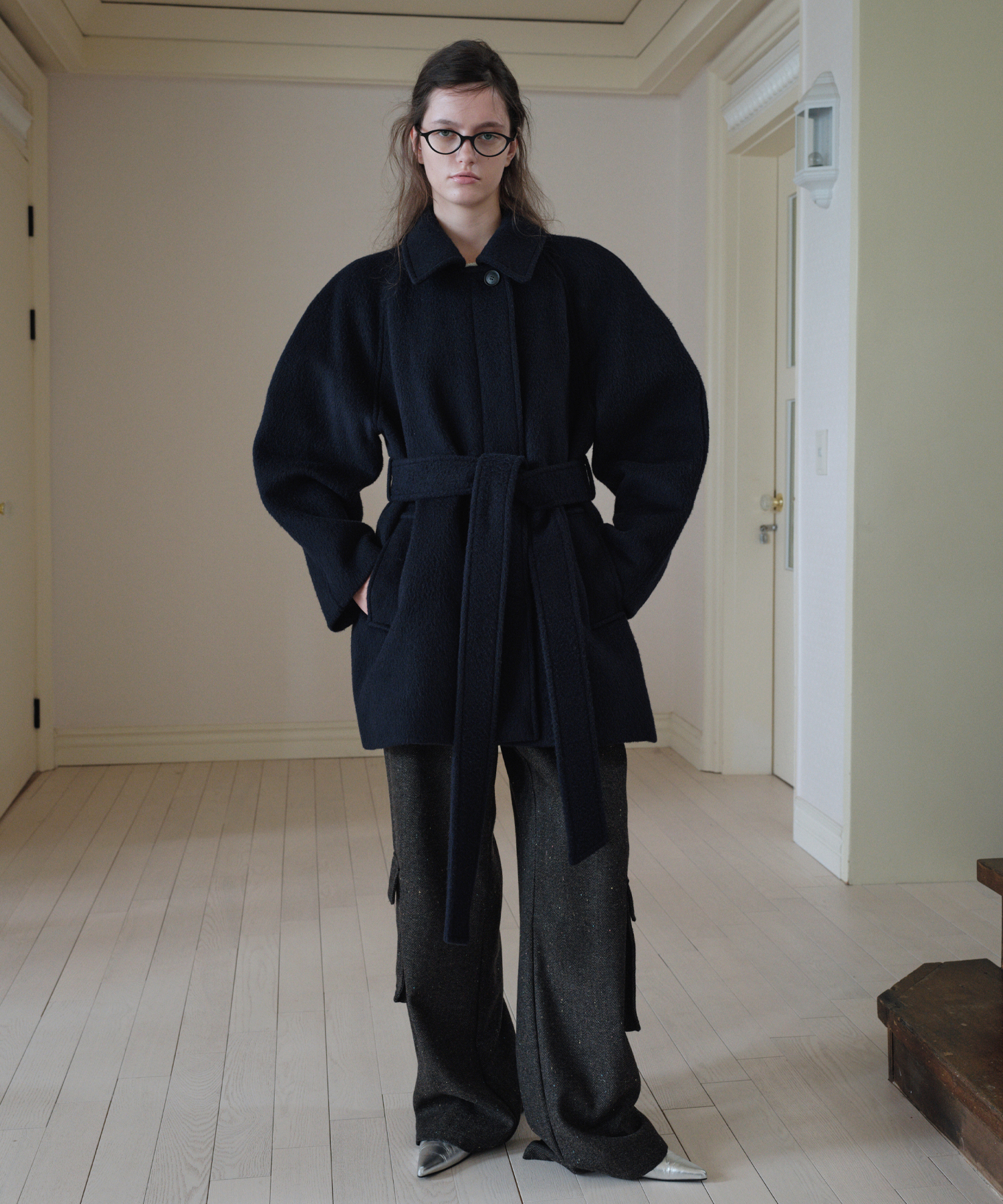 ボリュームショルダーが特徴のベルト付きハーフコートです。