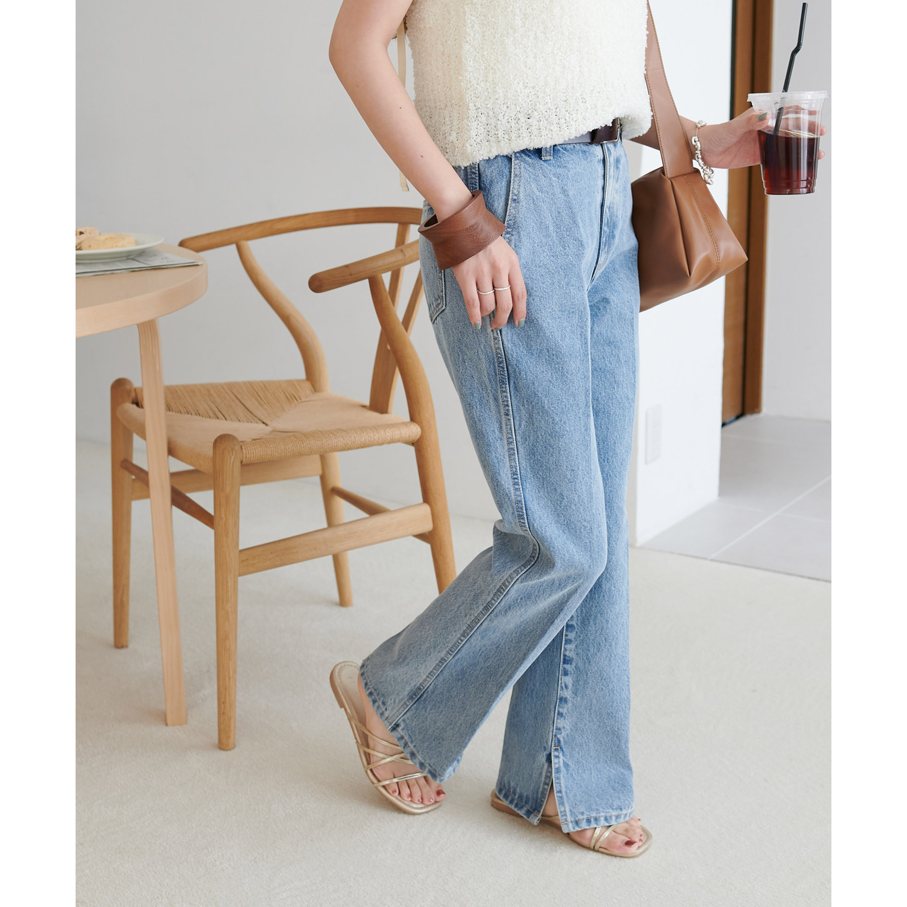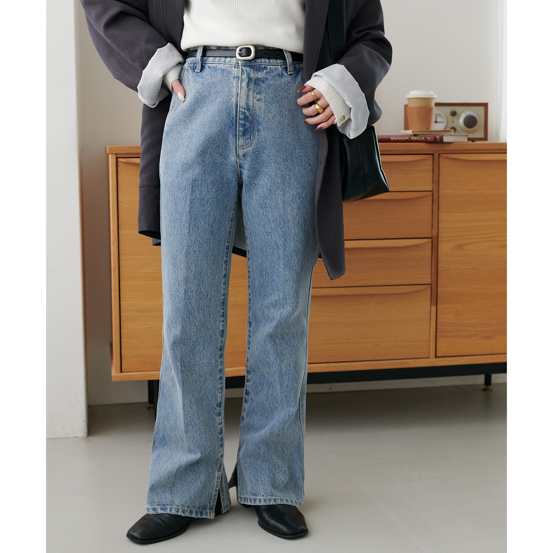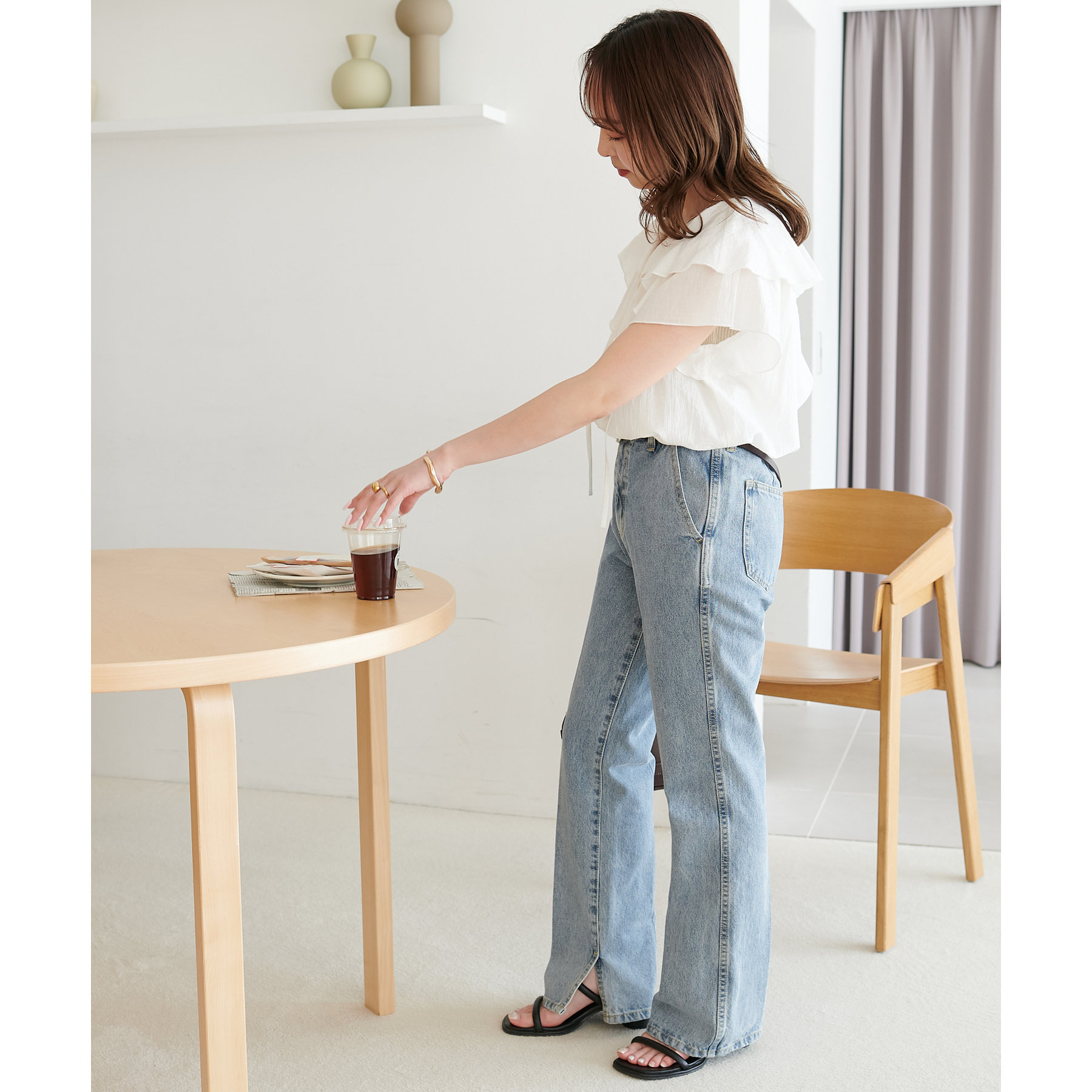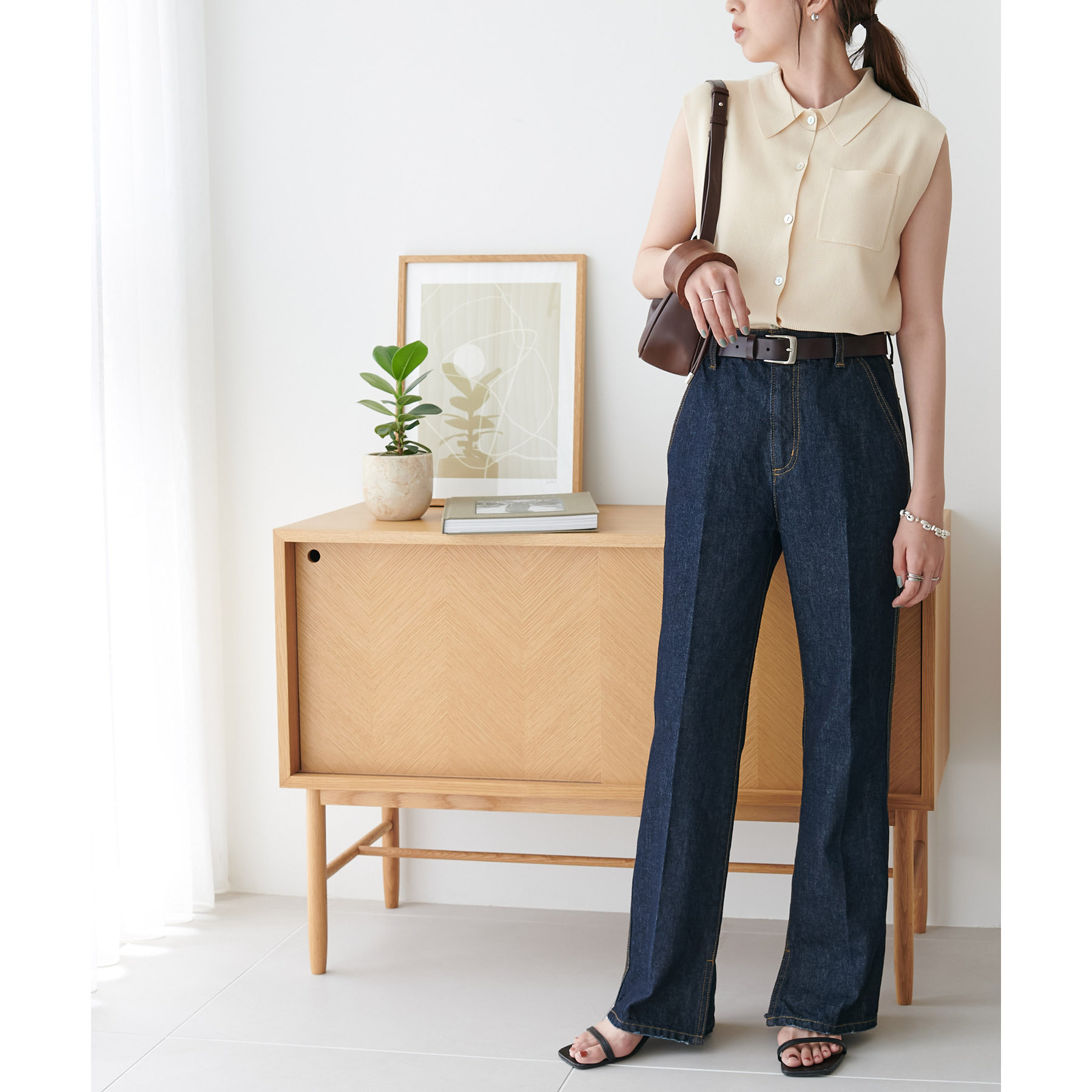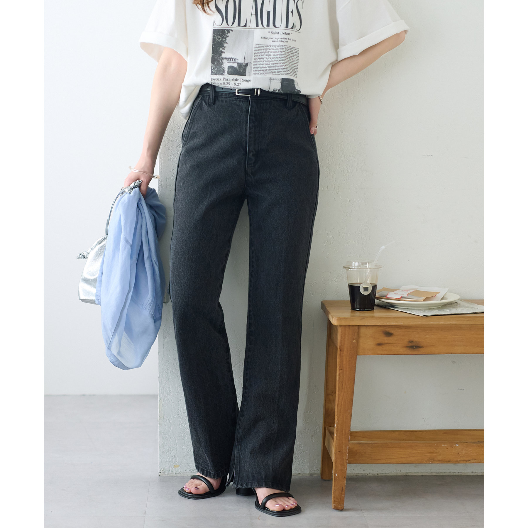 膝下からの程よい広がりとセンタープレスデザインが美脚効果をもたらす秘訣です。カジュアルながらも裾にスリットを入れることにより、抜け感と女性らしさをプラスします。カットオフデザインがなくなったことで、よりスッキリとした印象に。