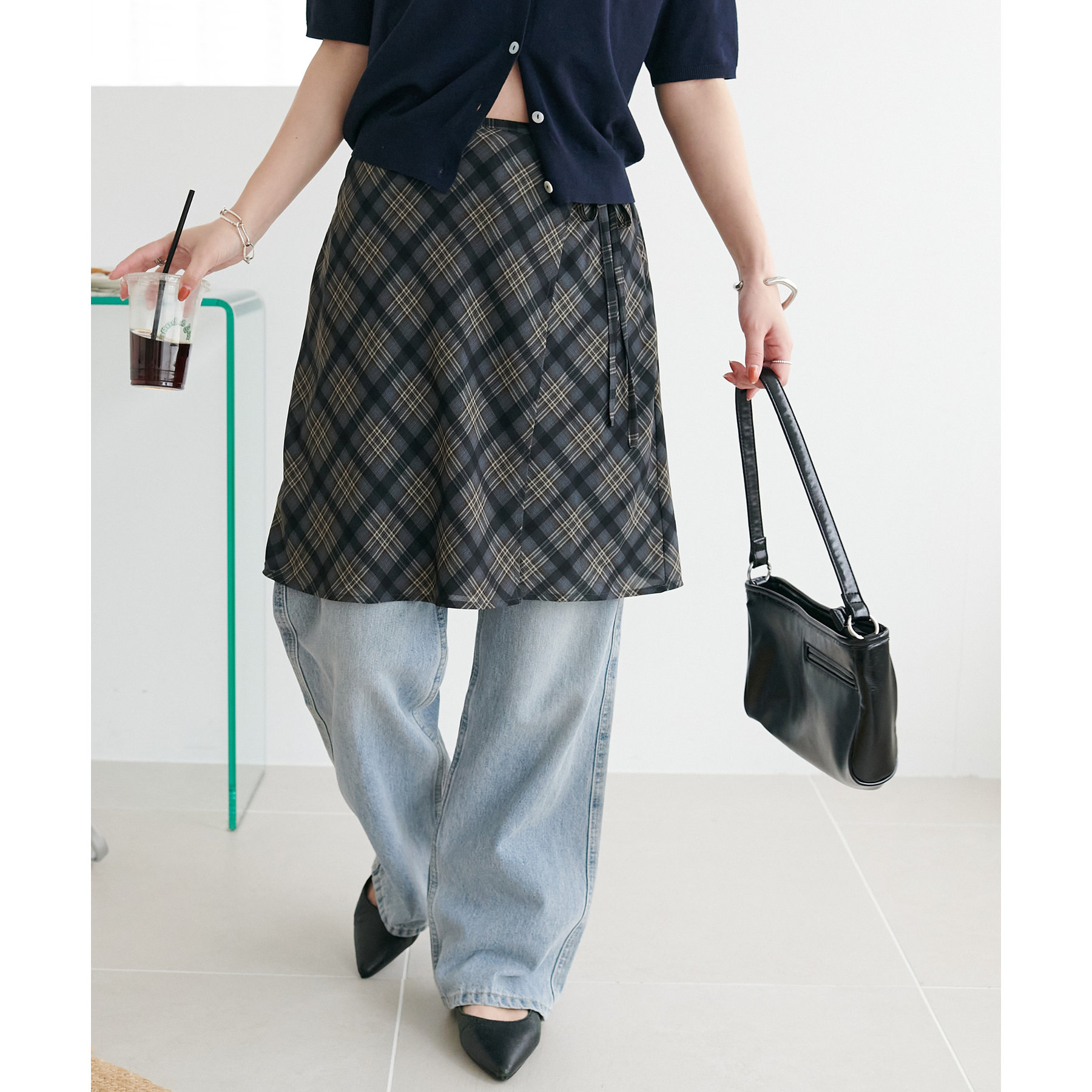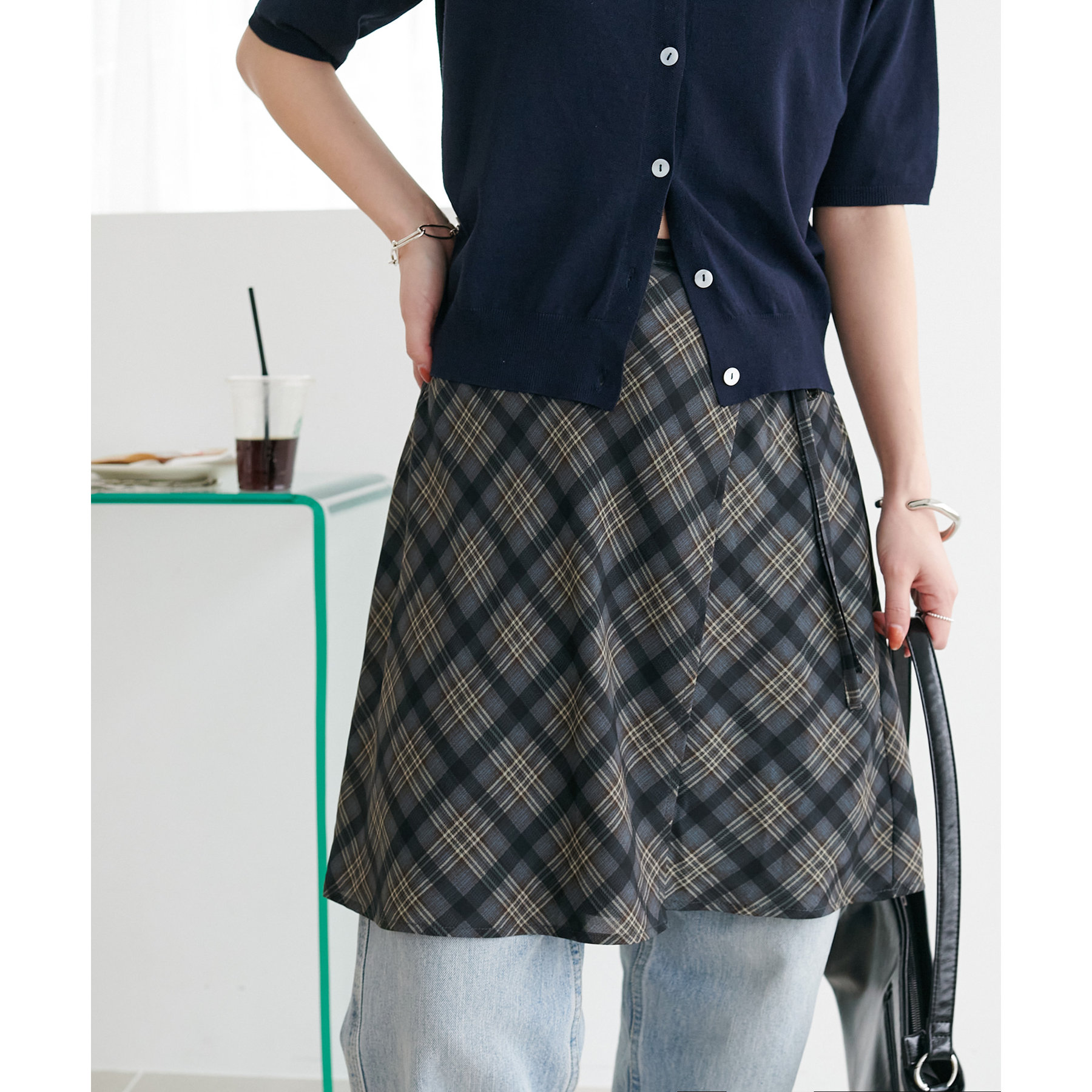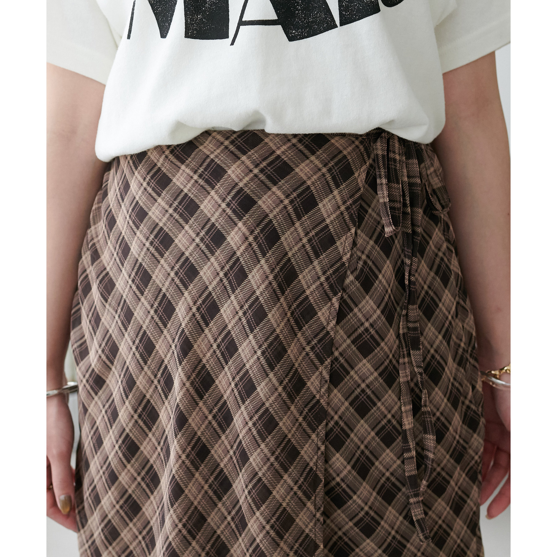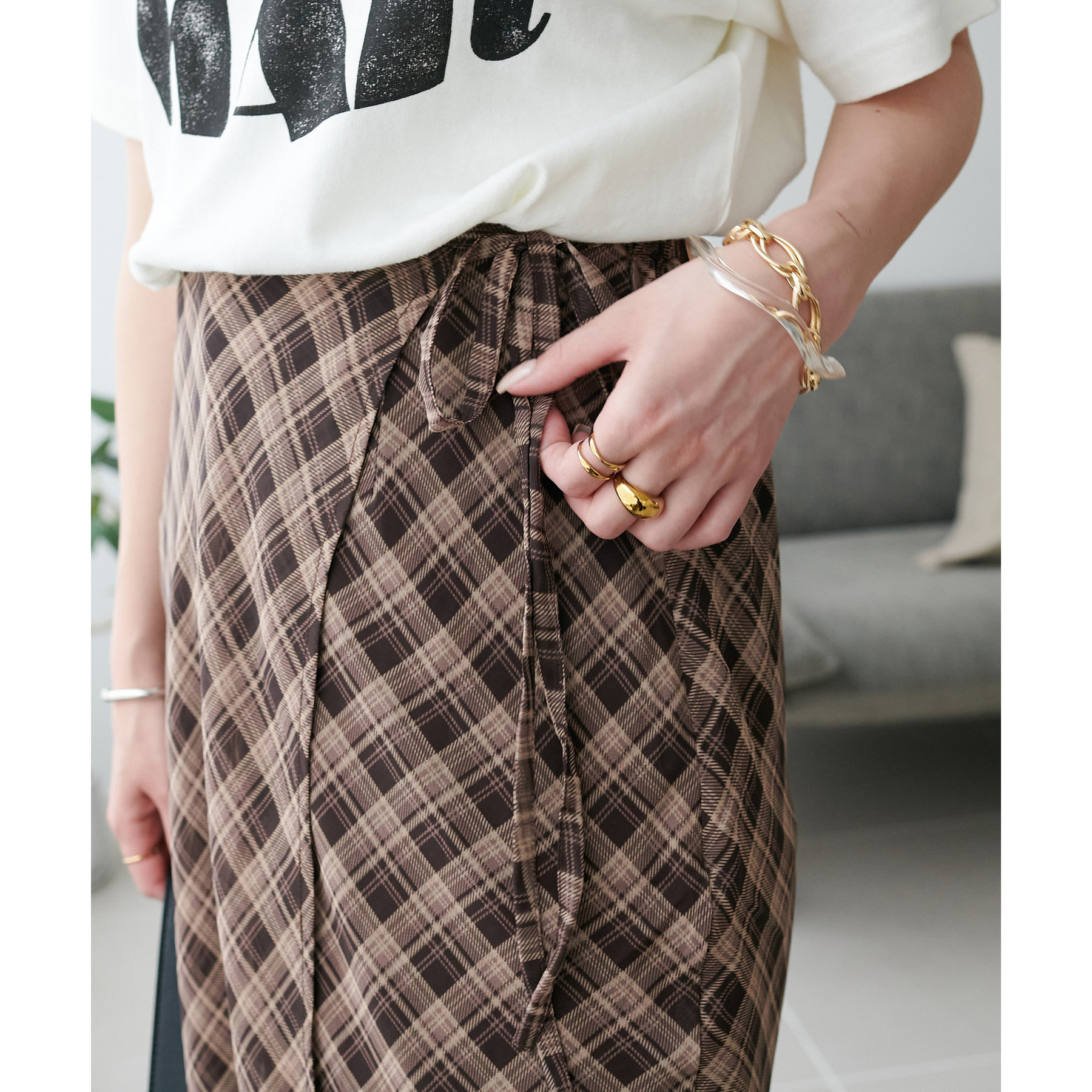チェック柄のクラシカルな雰囲気に、ラップデザインならではの抜け感が加わることで、ほどよくカジュアルダウンされ、日常に取り入れやすい仕上がりに。