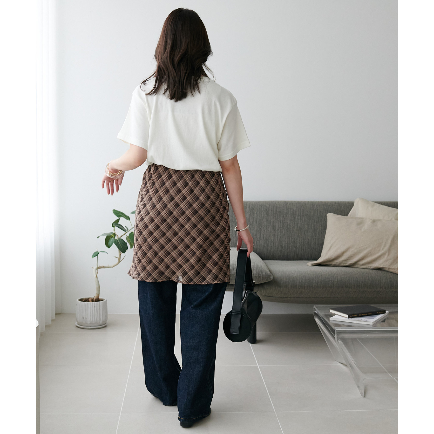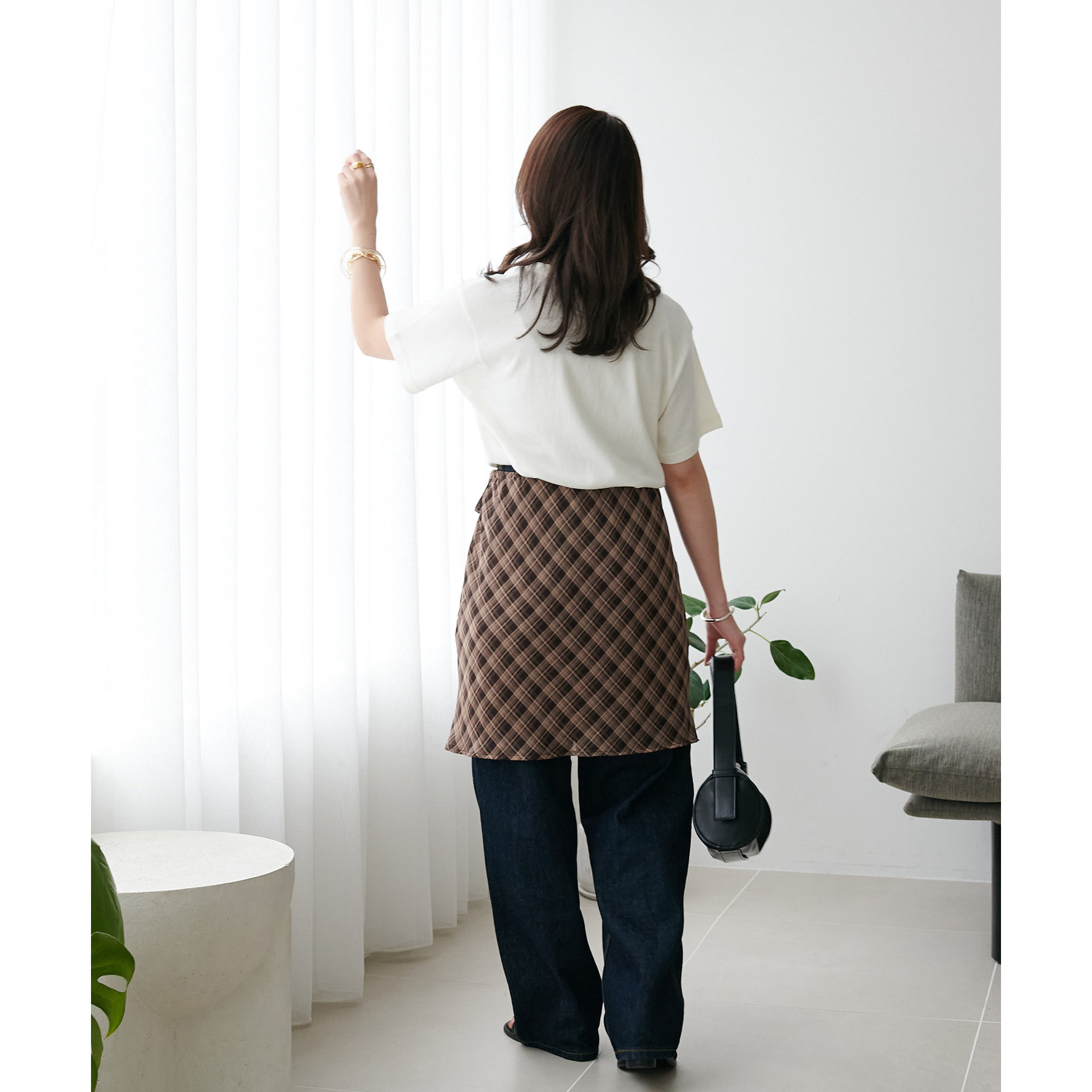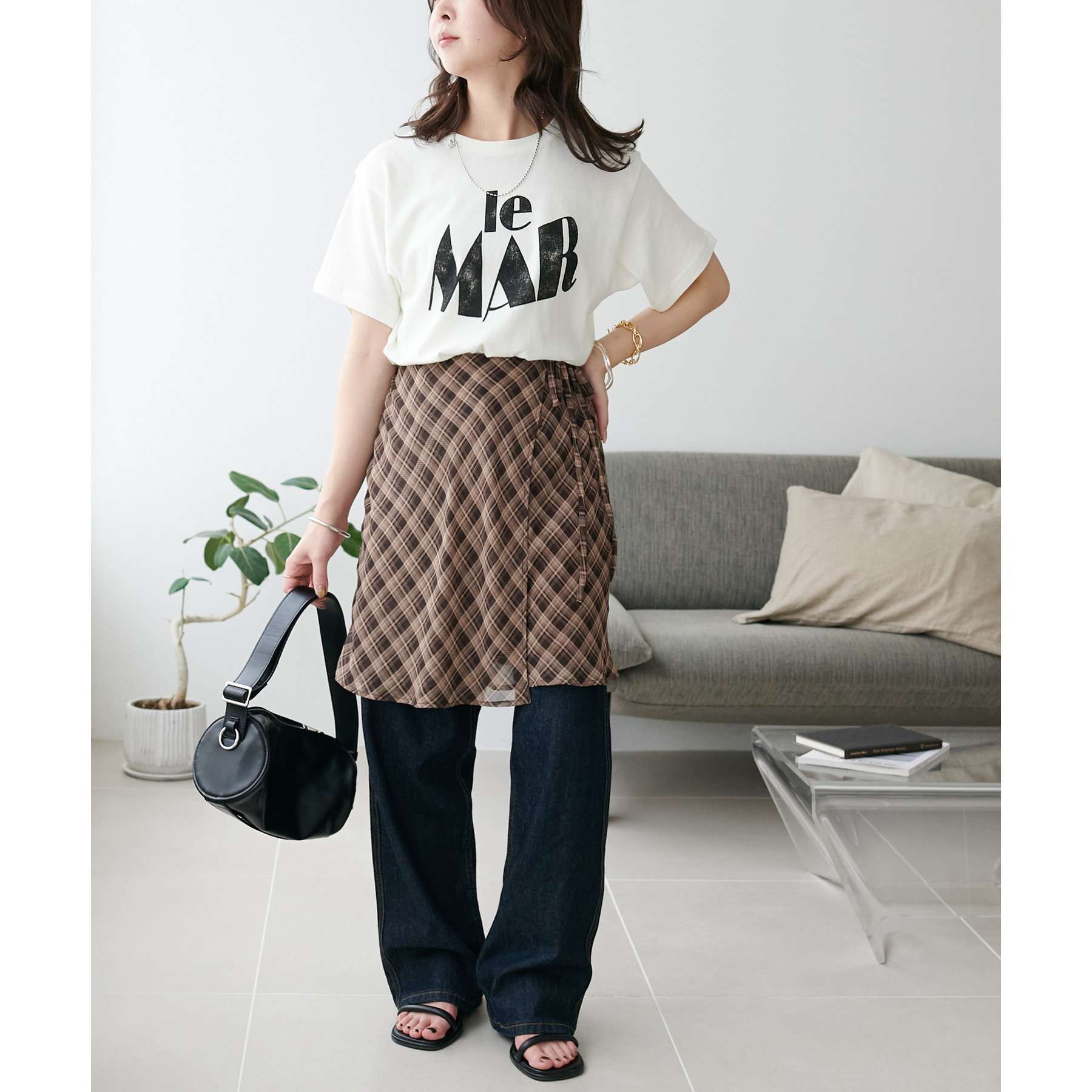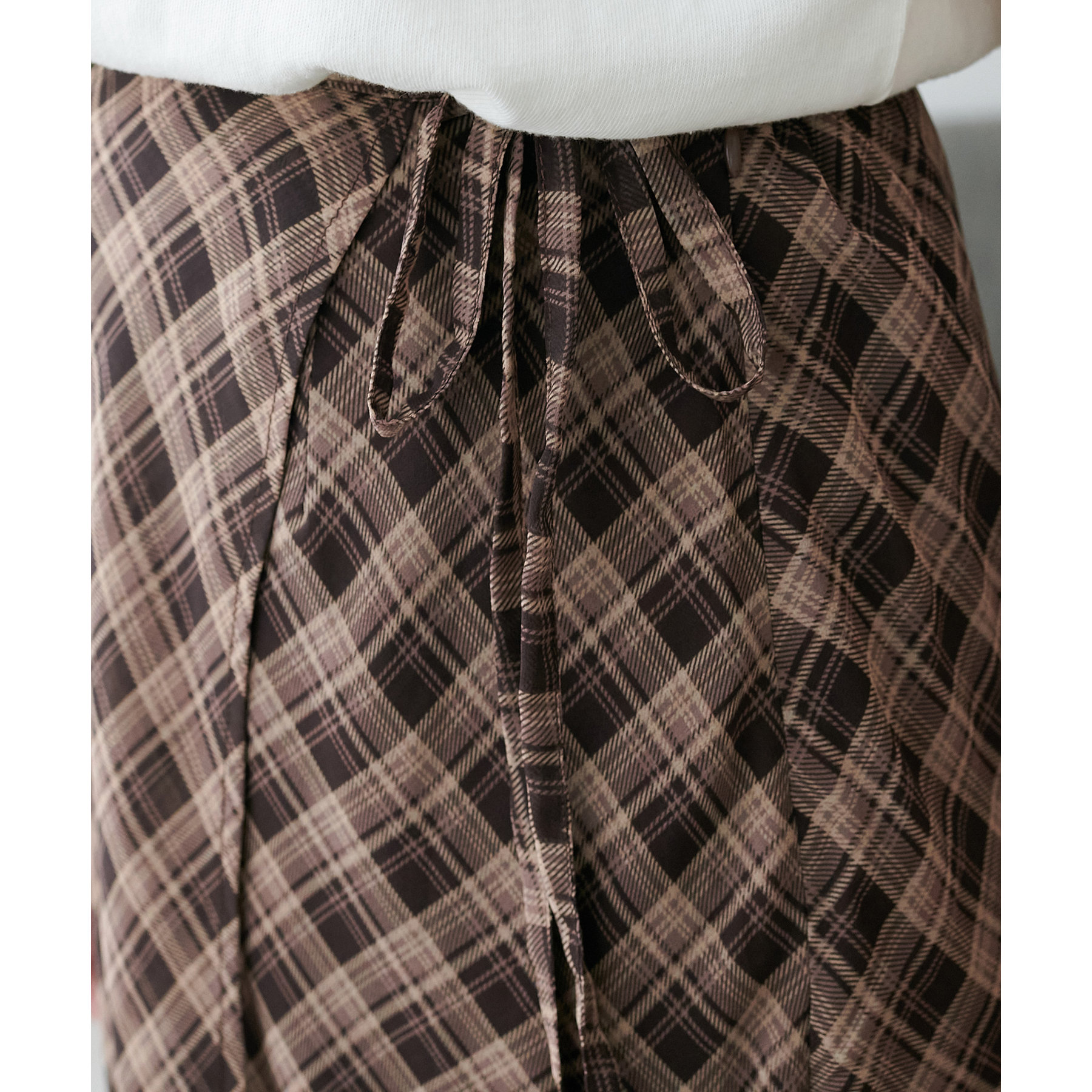 チェック柄のクラシカルな雰囲気に、ラップデザインならではの抜け感が加わることで、ほどよくカジュアルダウンされ、日常に取り入れやすい仕上がりに。