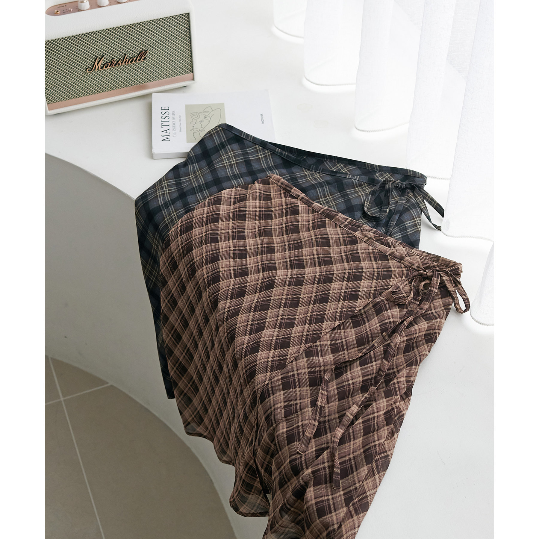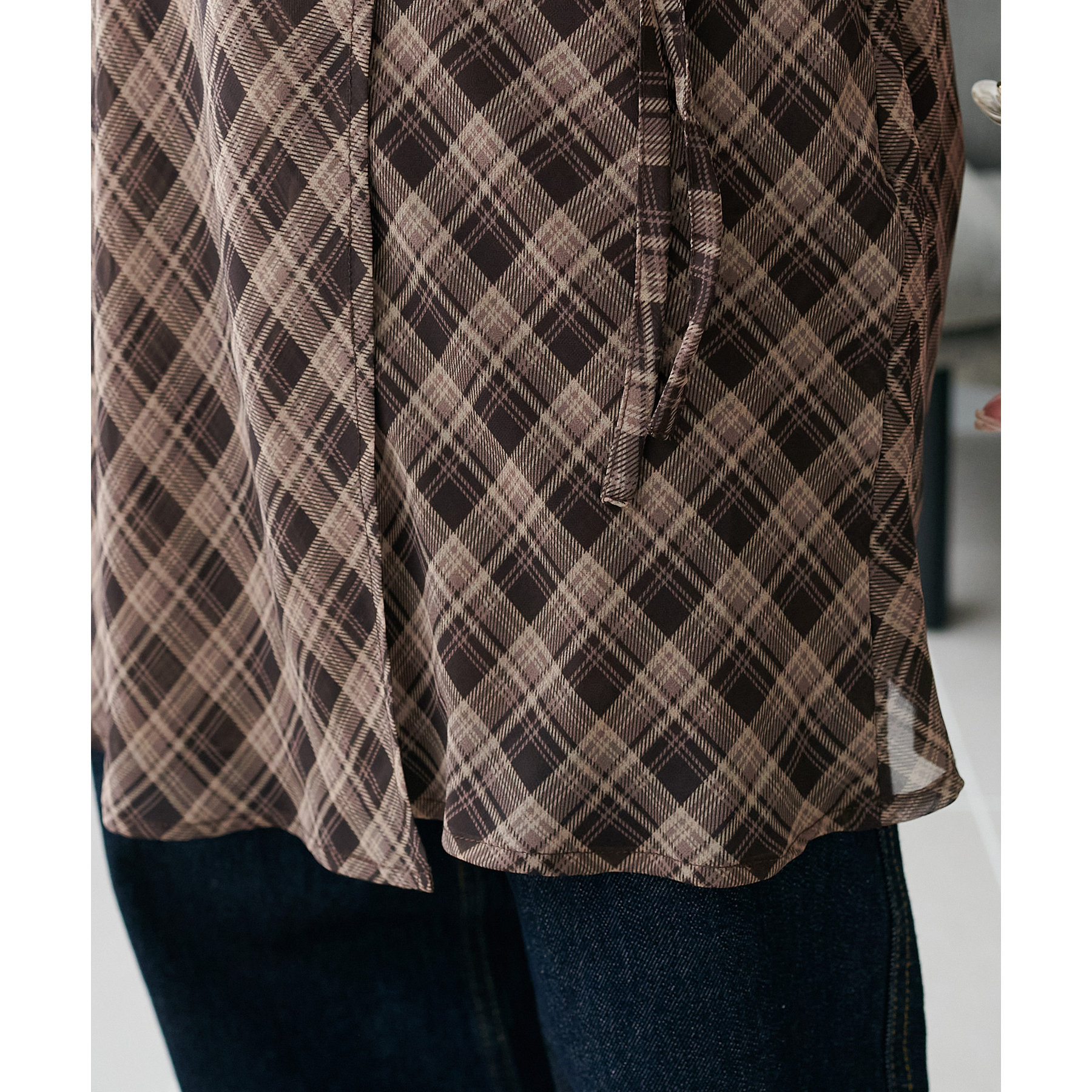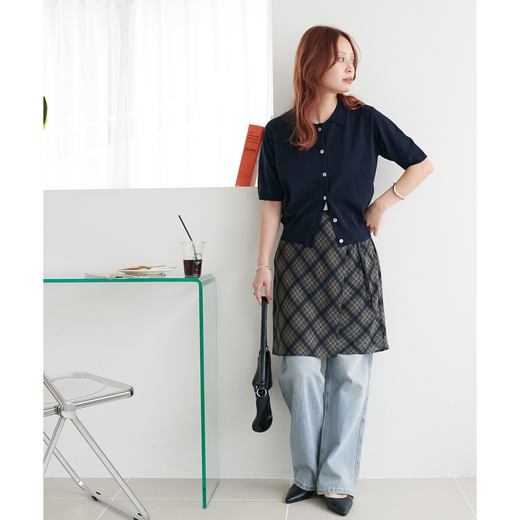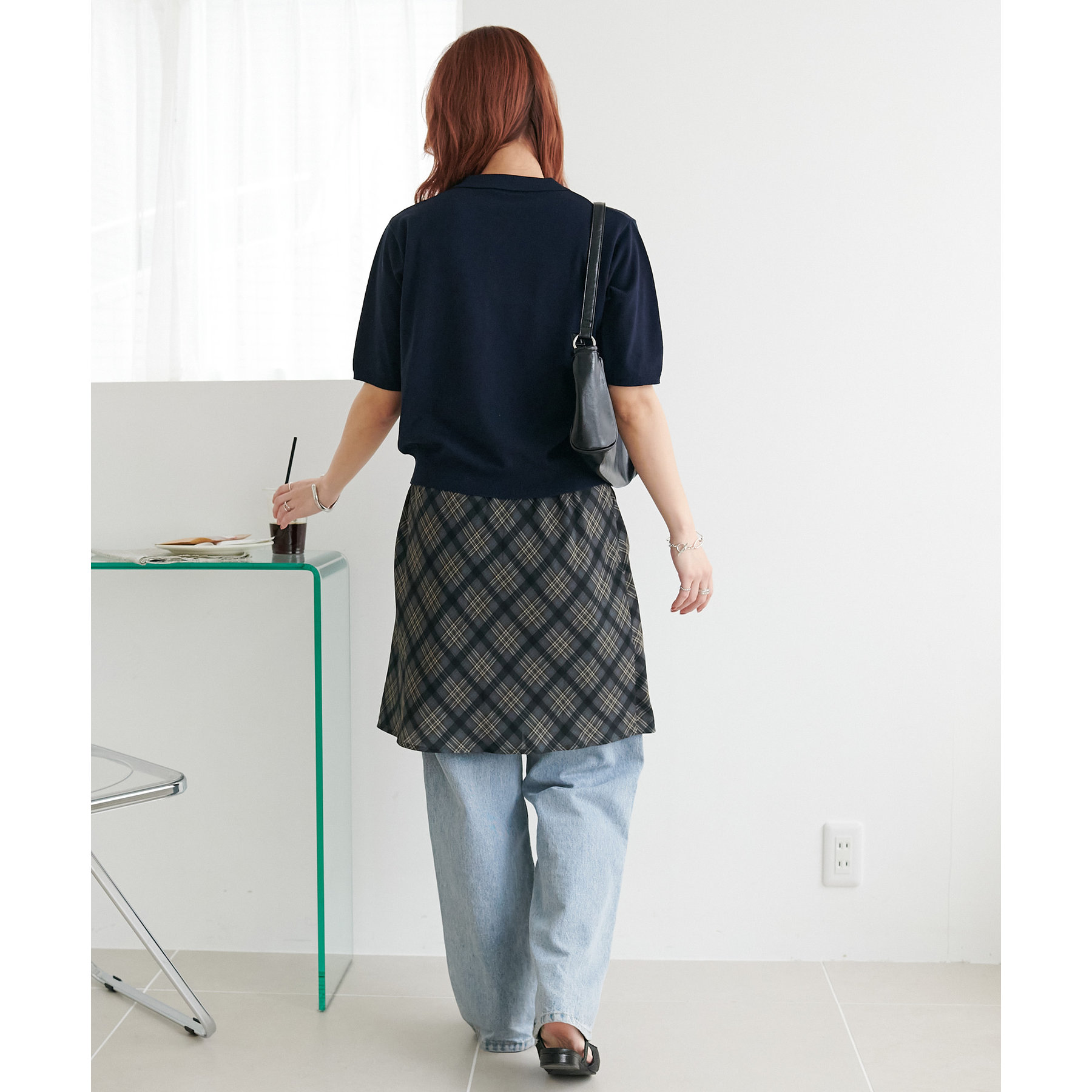チェック柄のクラシカルな雰囲気に、ラップデザインならではの抜け感が加わることで、ほどよくカジュアルダウンされ、日常に取り入れやすい仕上がりに。