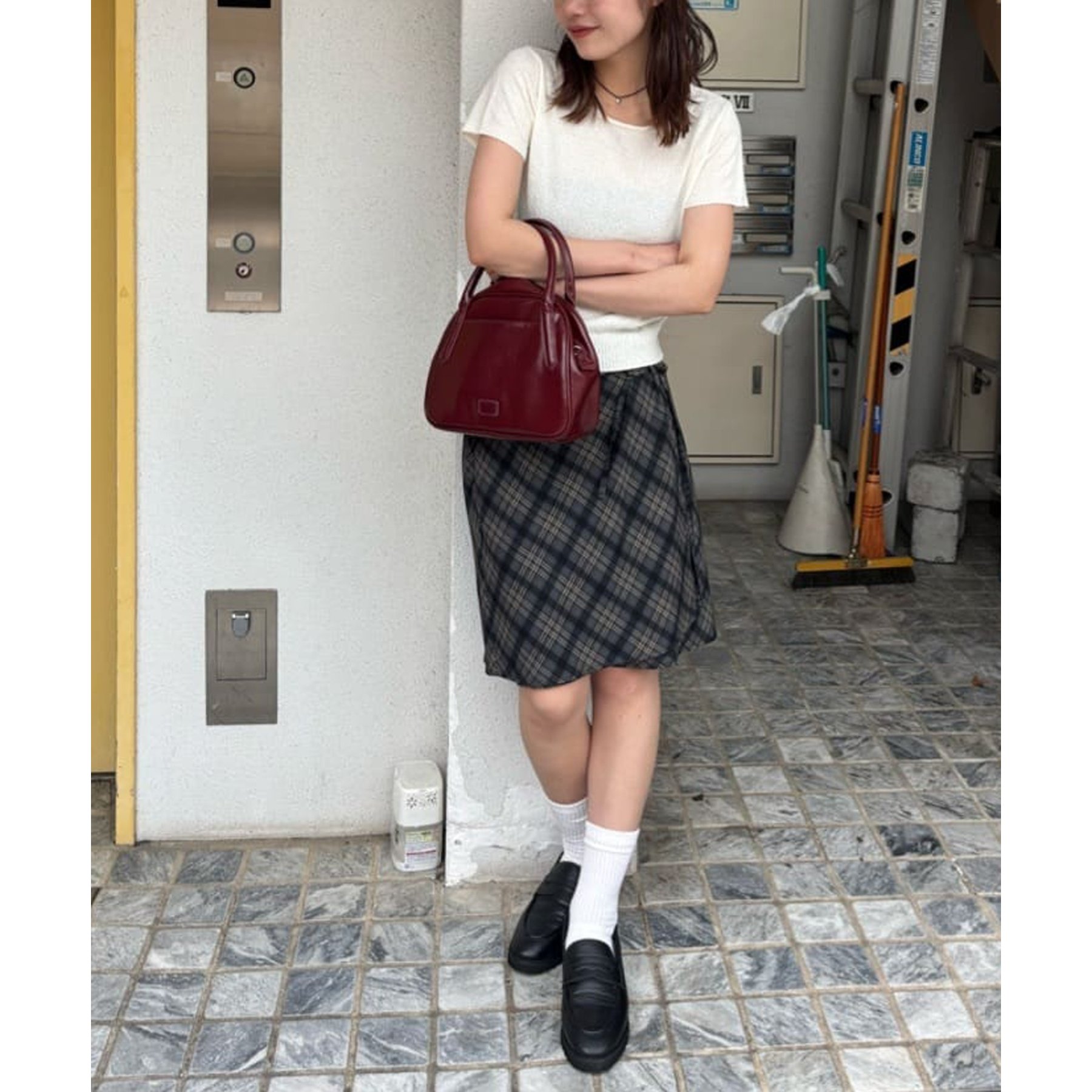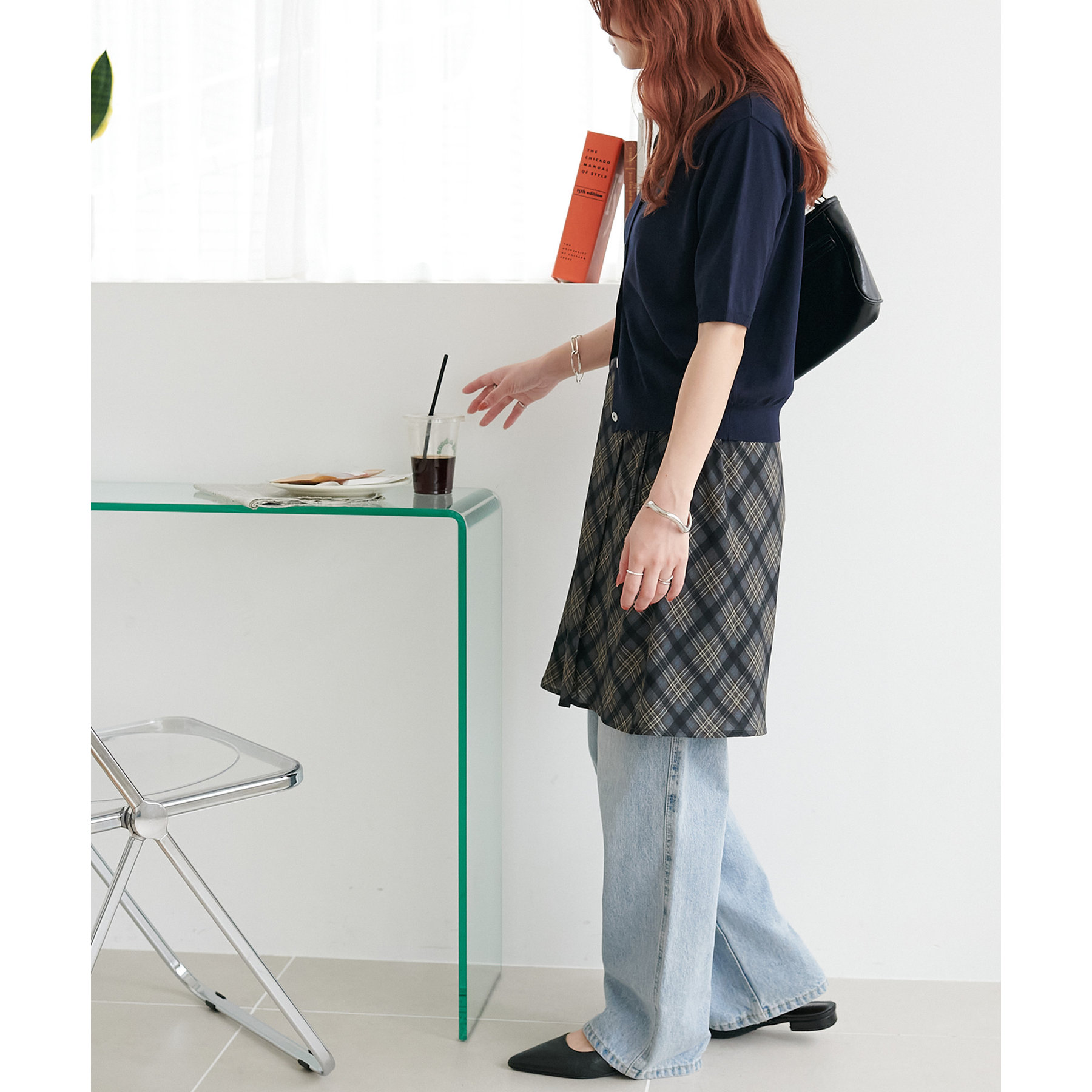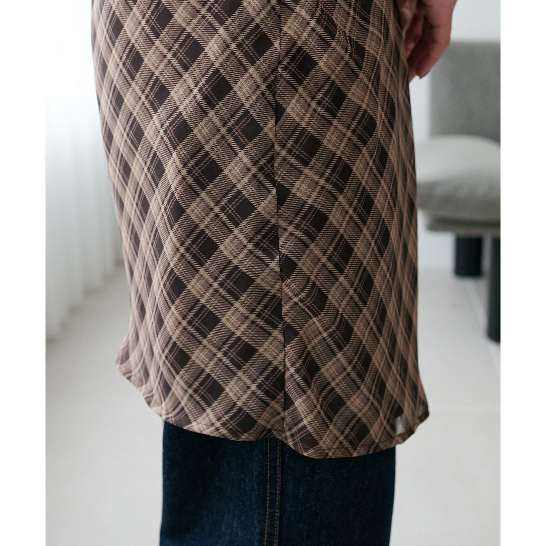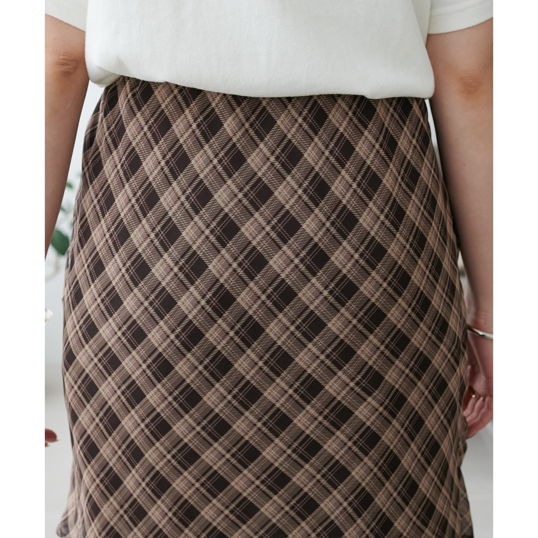 チェック柄のクラシカルな雰囲気に、ラップデザインならではの抜け感が加わることで、ほどよくカジュアルダウンされ、日常に取り入れやすい仕上がりに。
