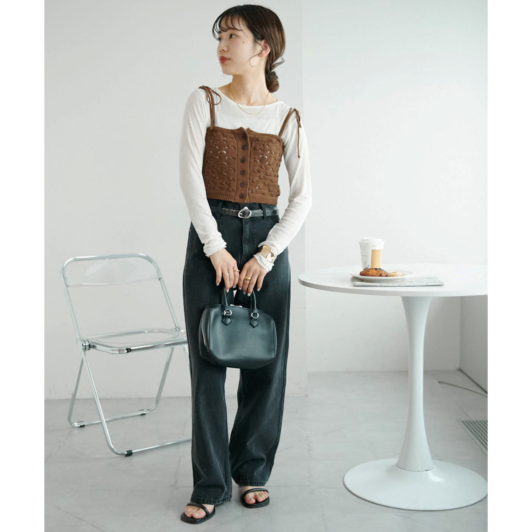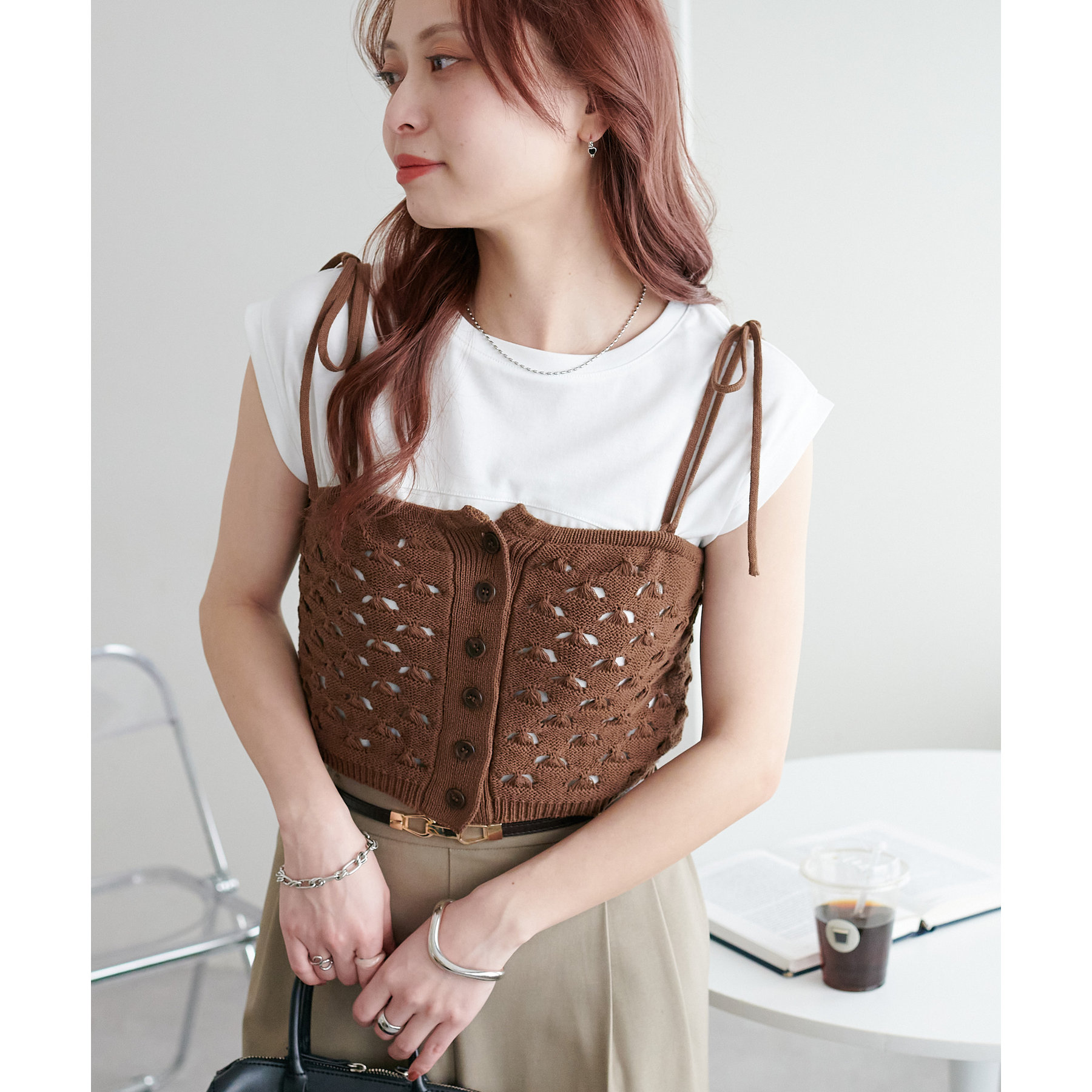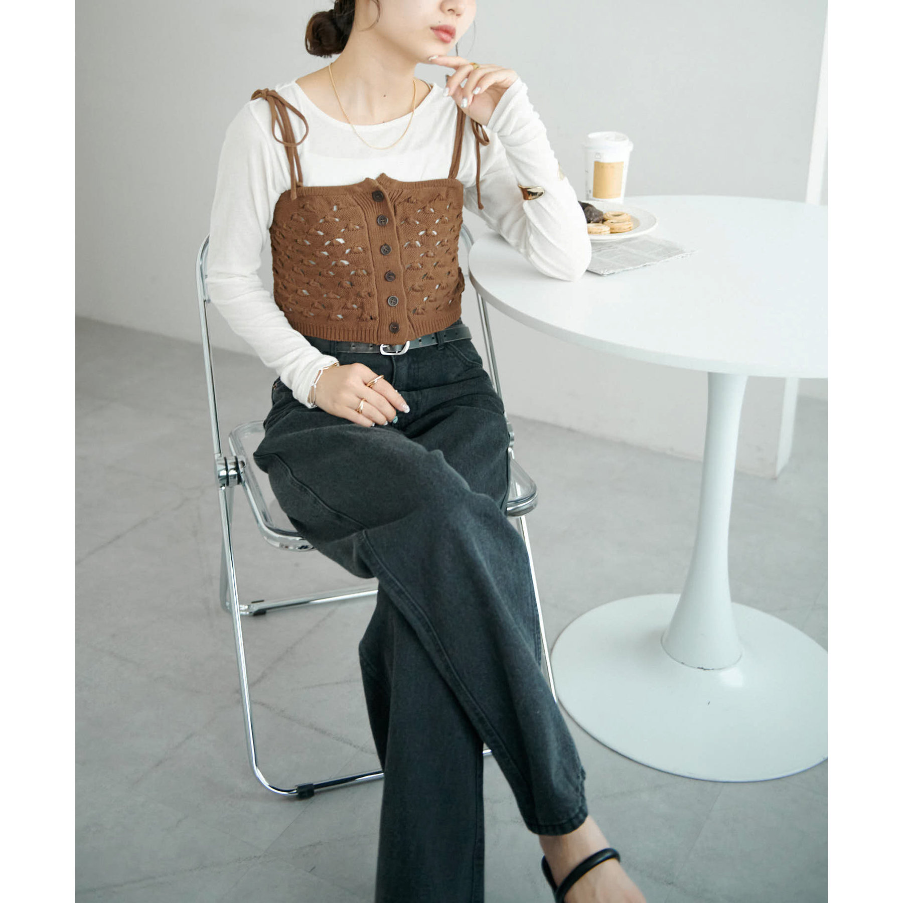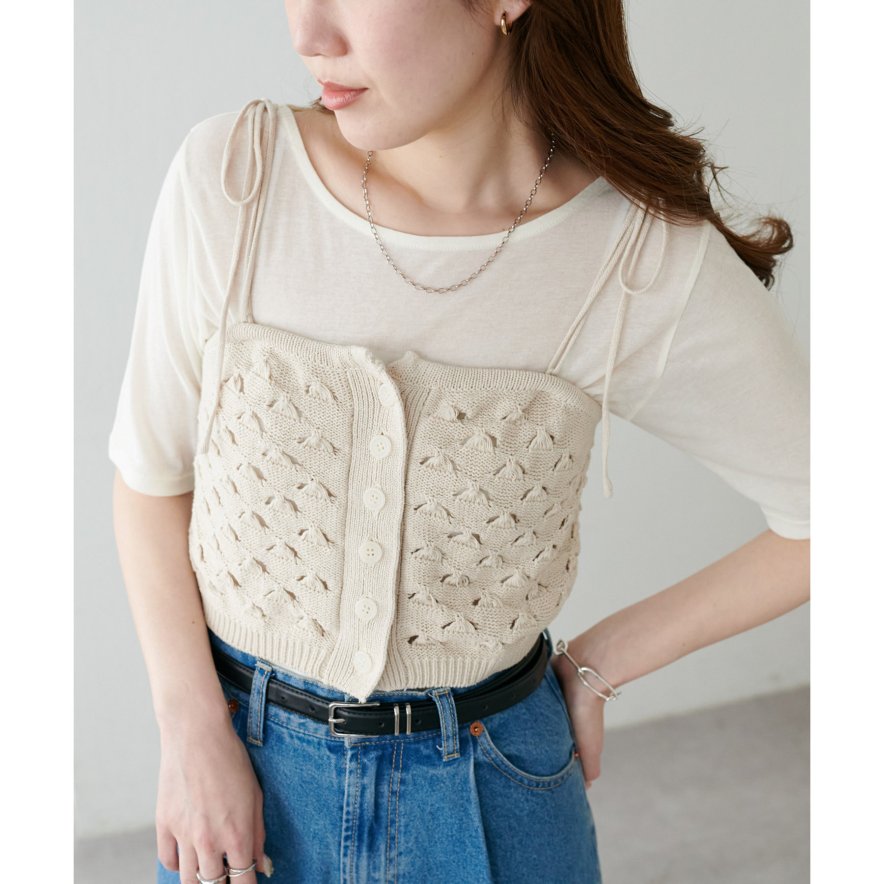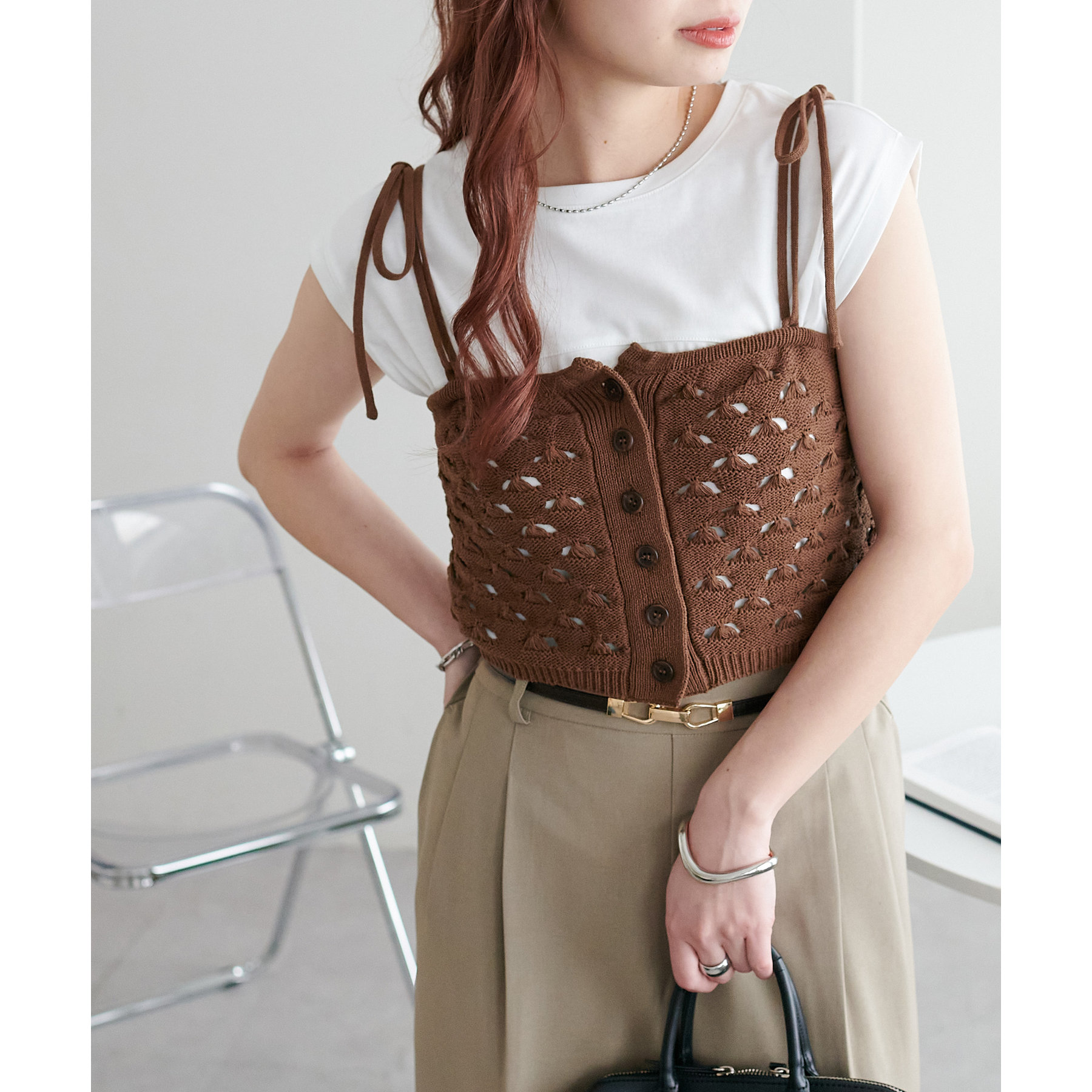 コーデのポイントになるスカシビスチェはコンパクトな着丈なので、スッキリとした印象をプラスします◎
