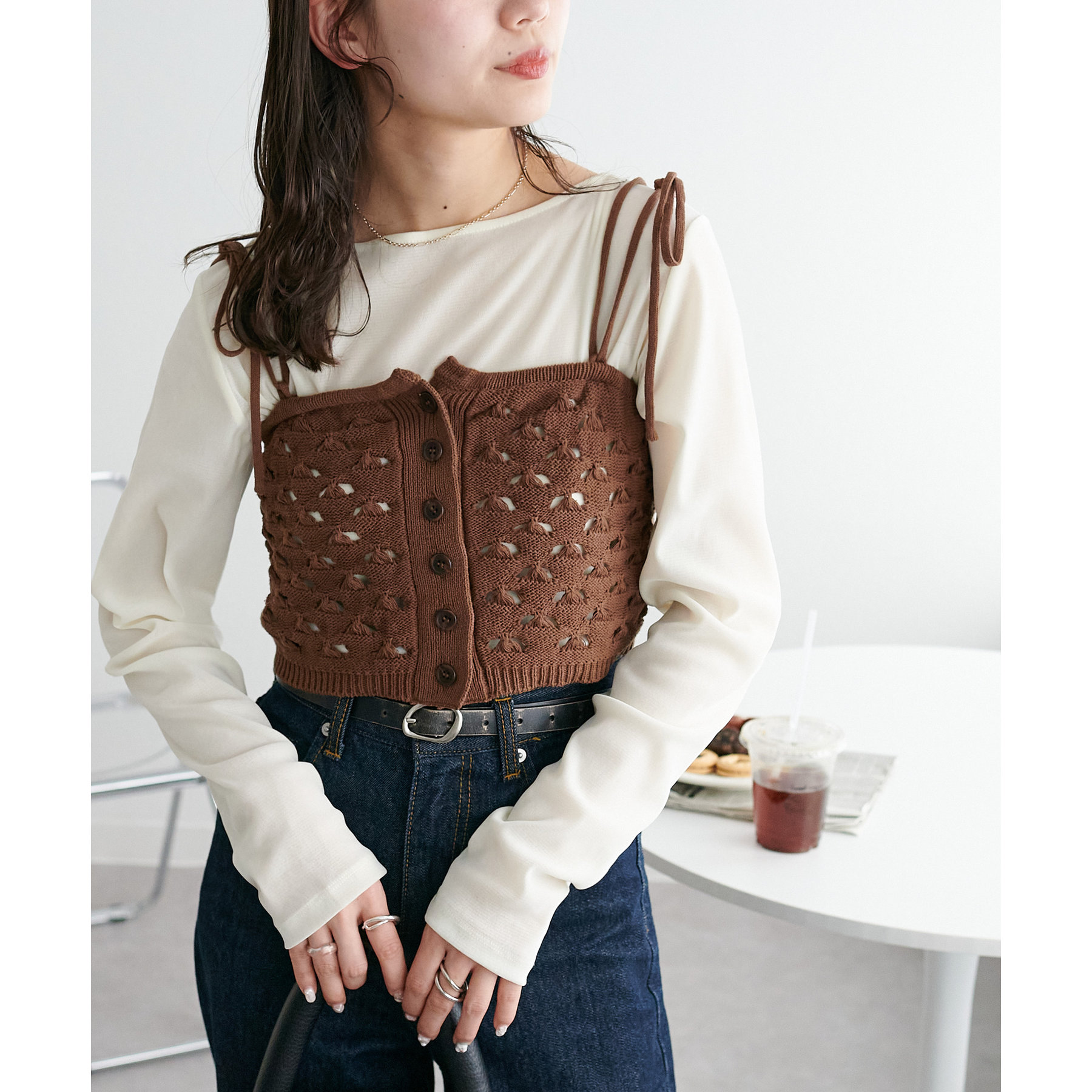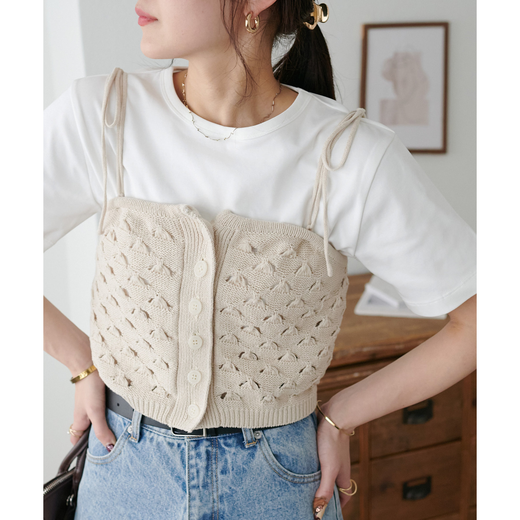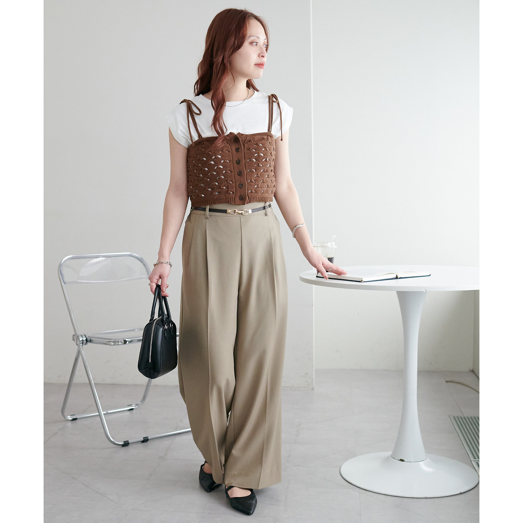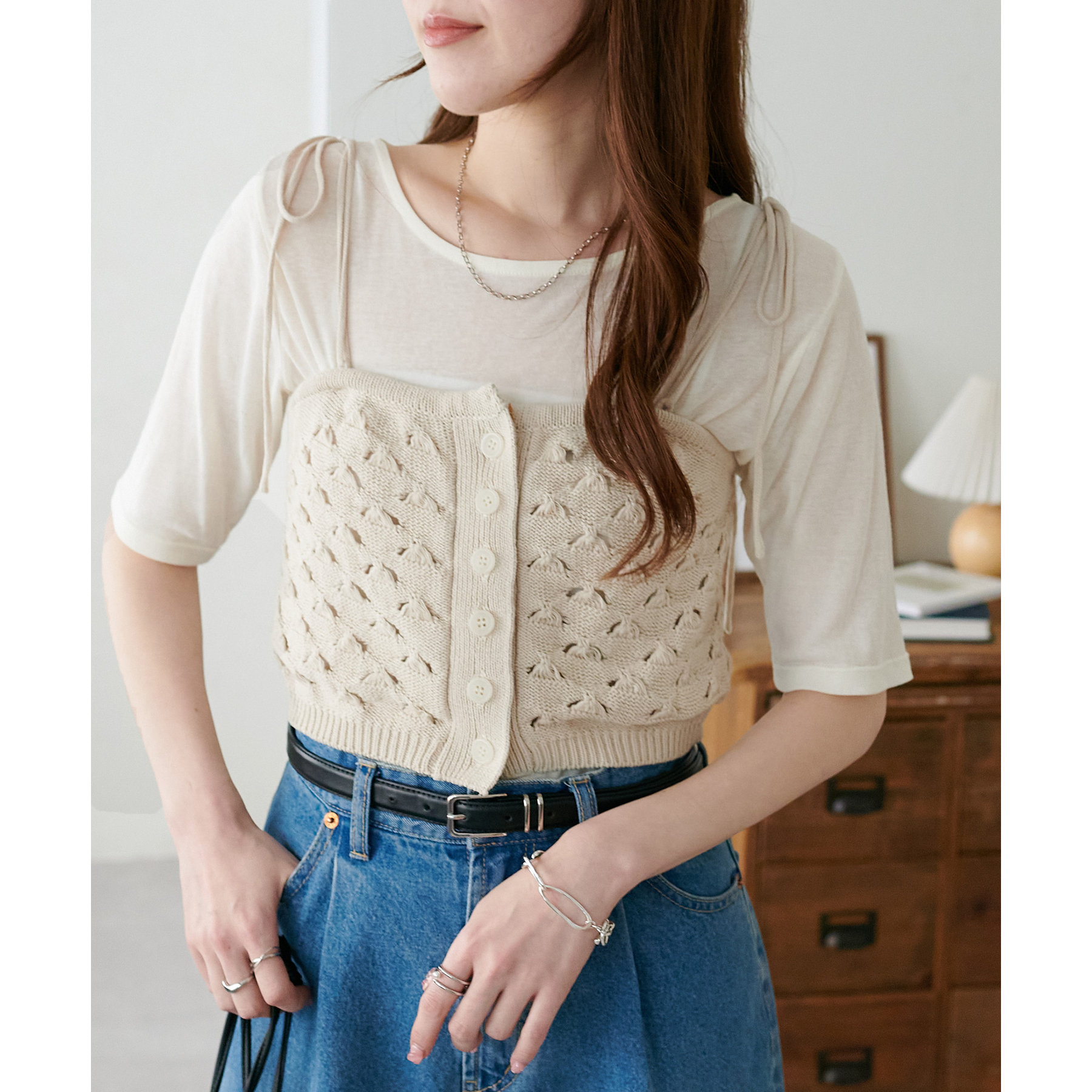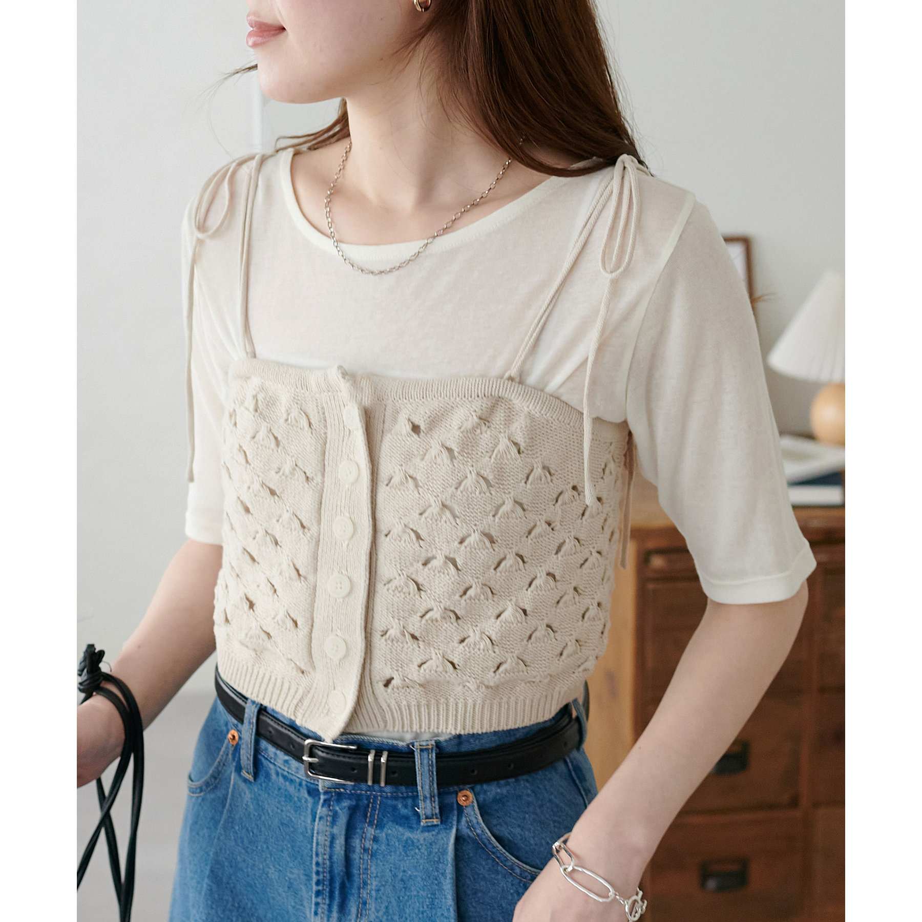 コーデのポイントになるスカシビスチェはコンパクトな着丈なので、スッキリとした印象をプラスします◎