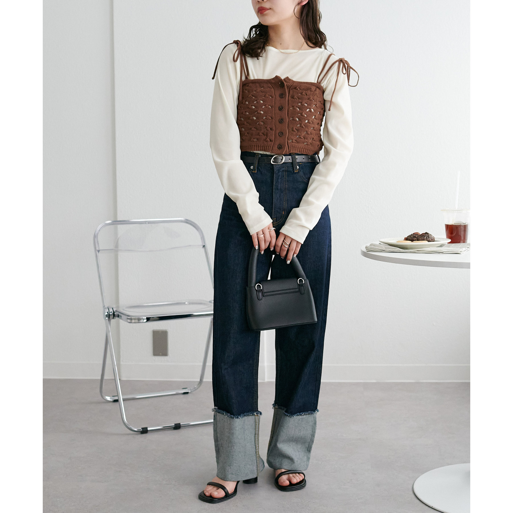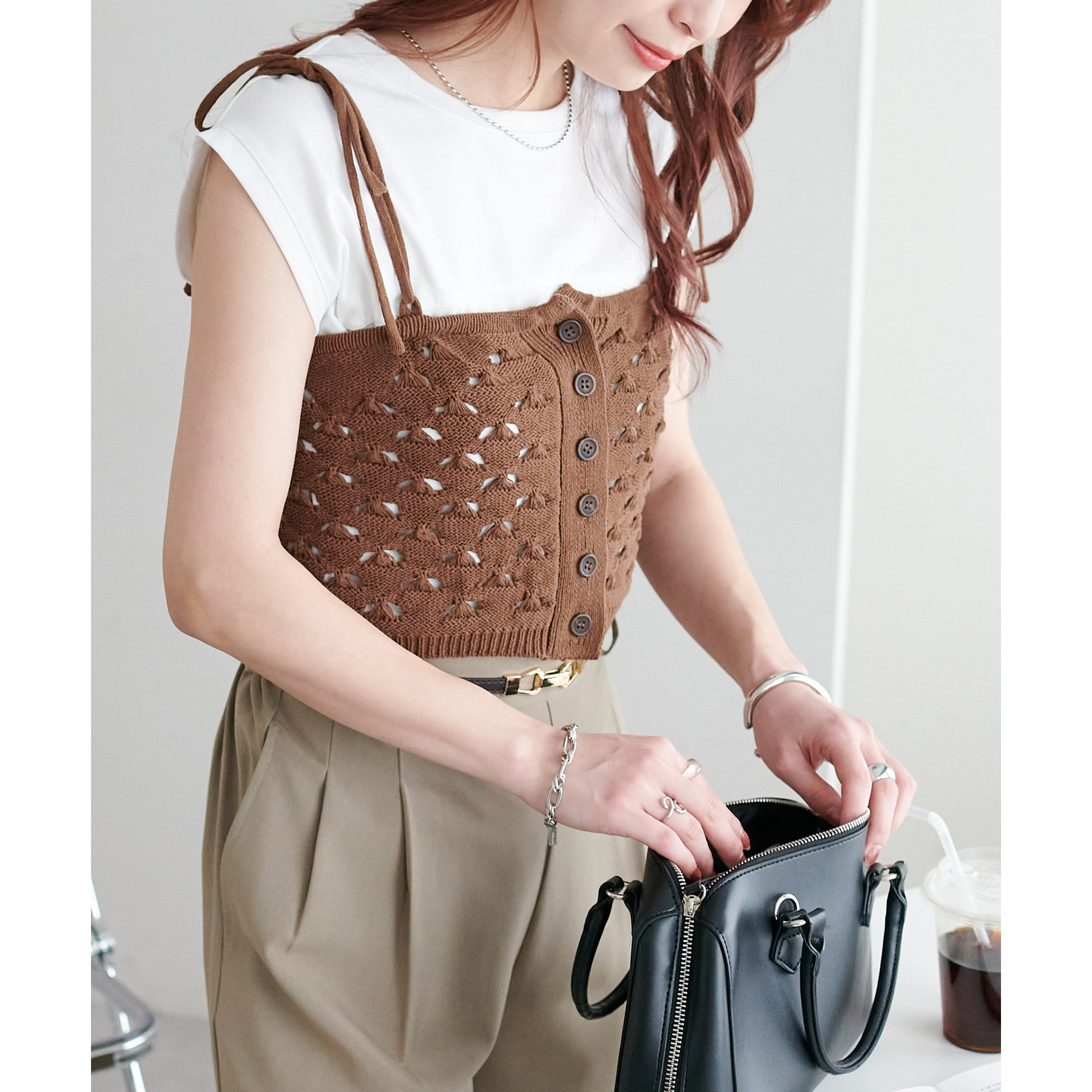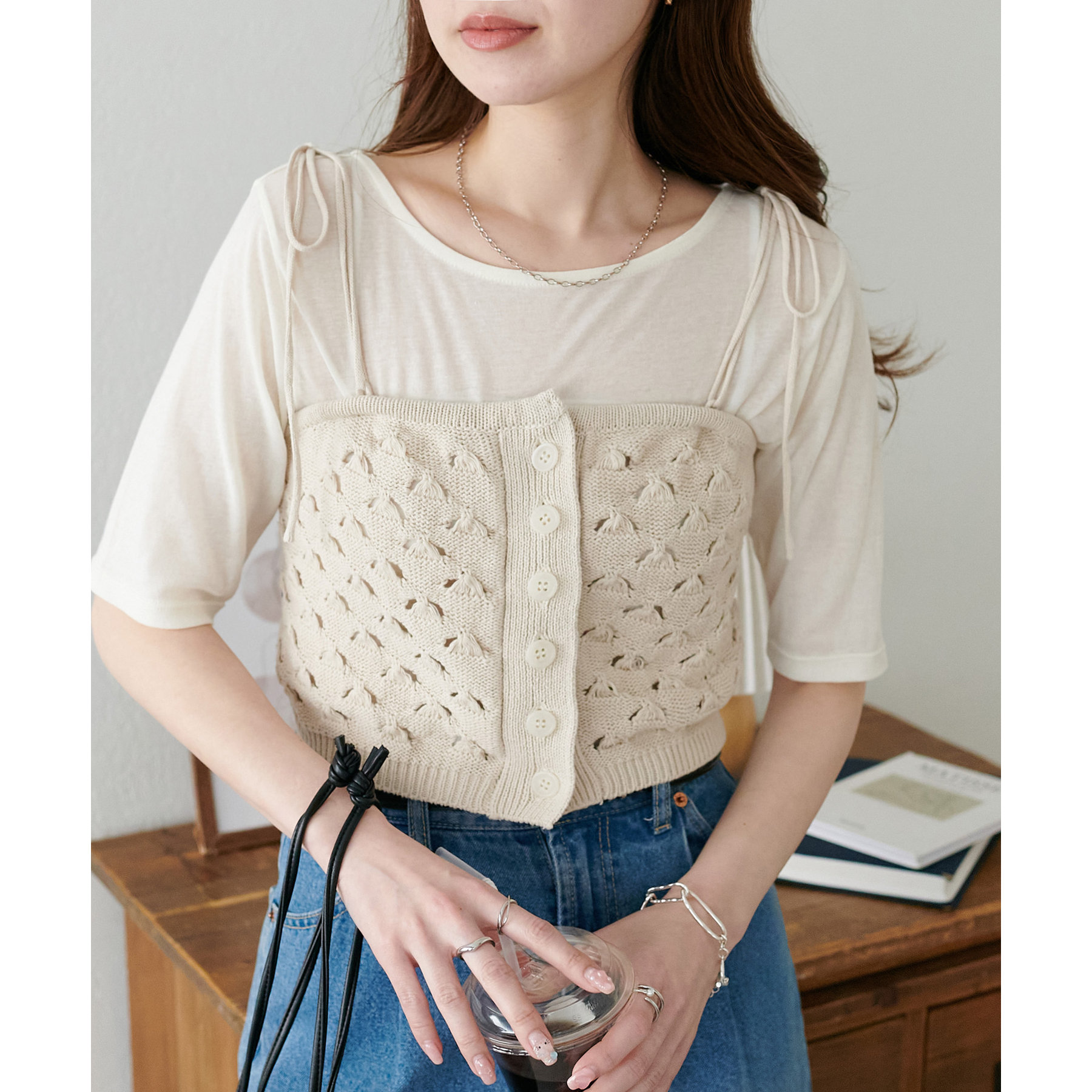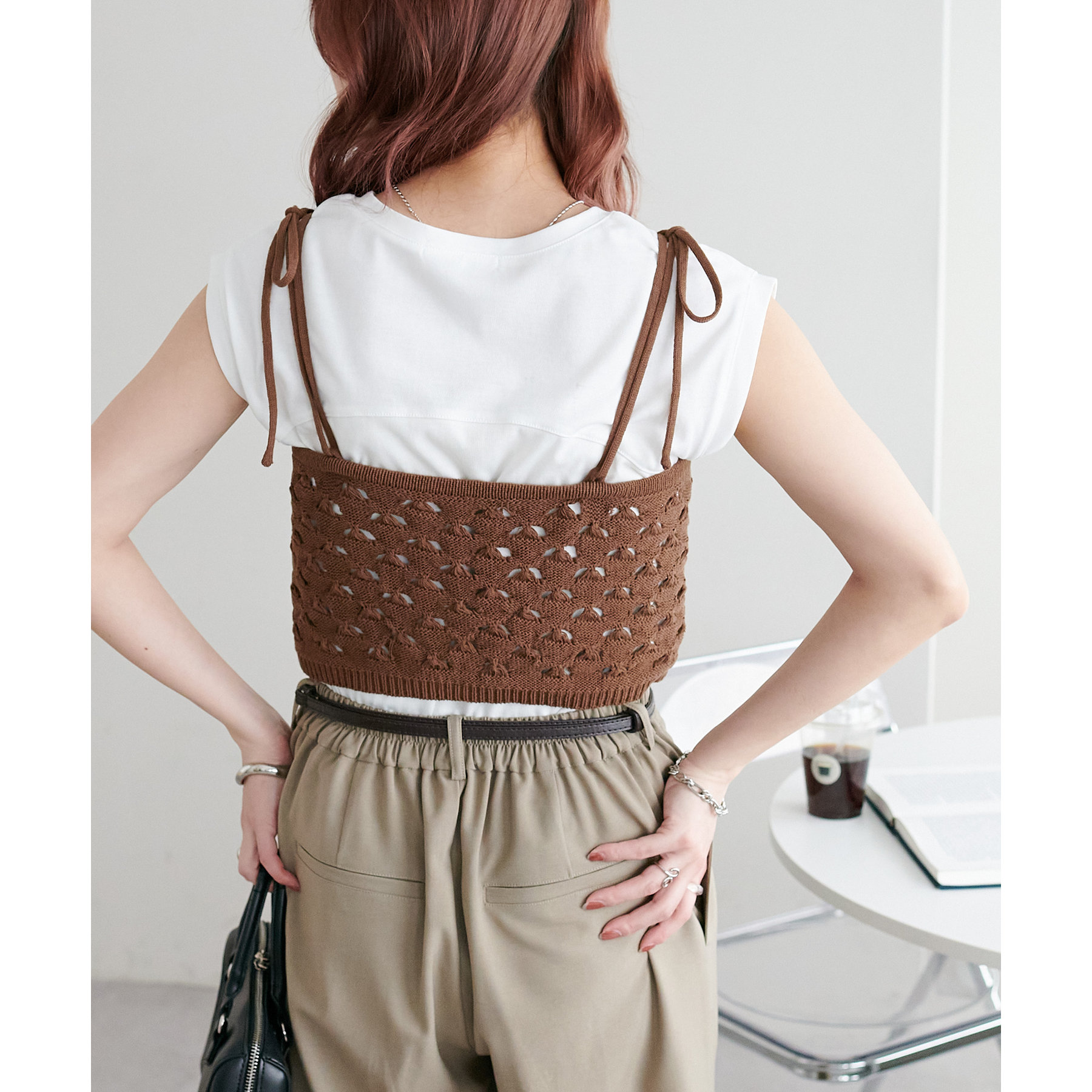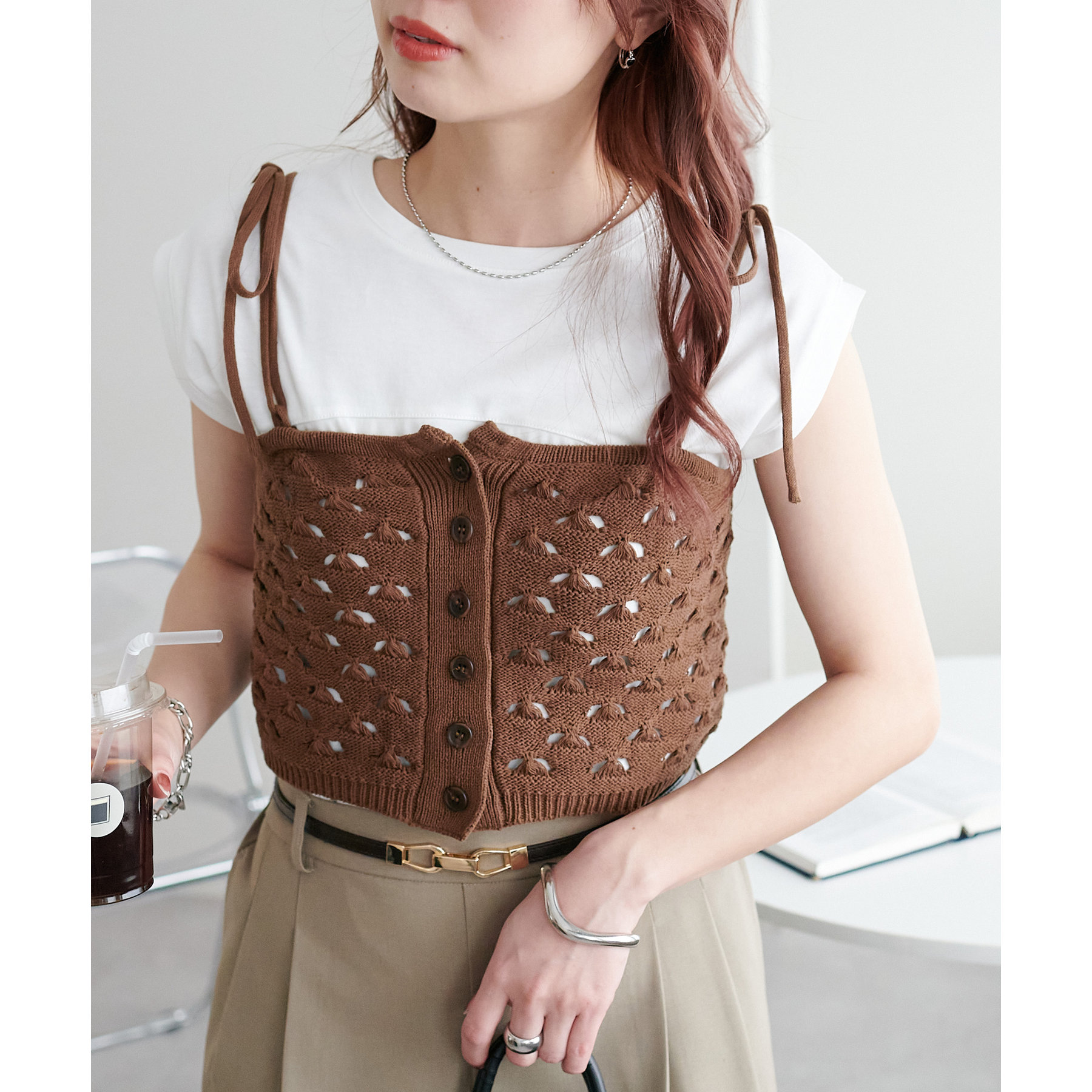 コーデのポイントになるスカシビスチェはコンパクトな着丈なので、スッキリとした印象をプラスします◎
