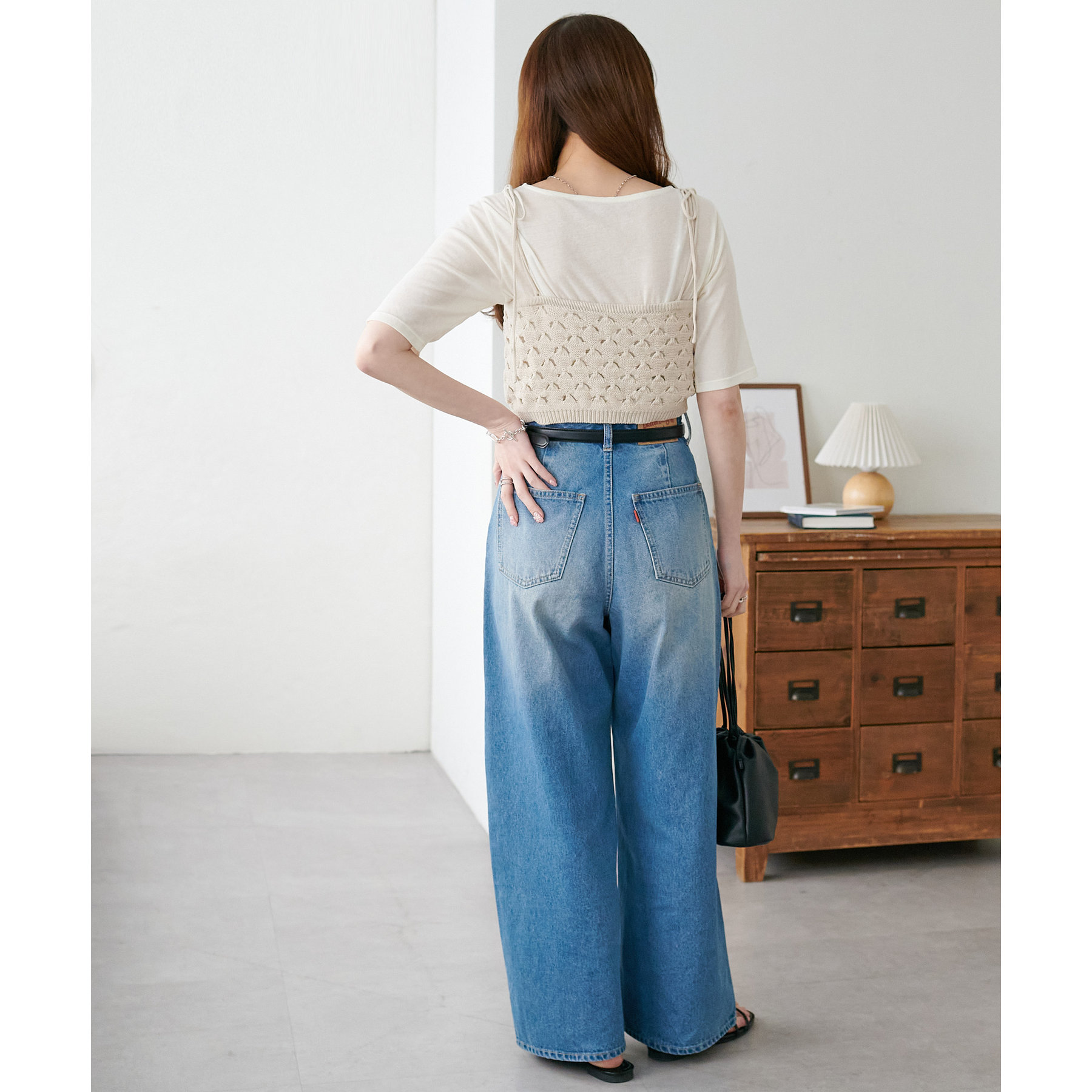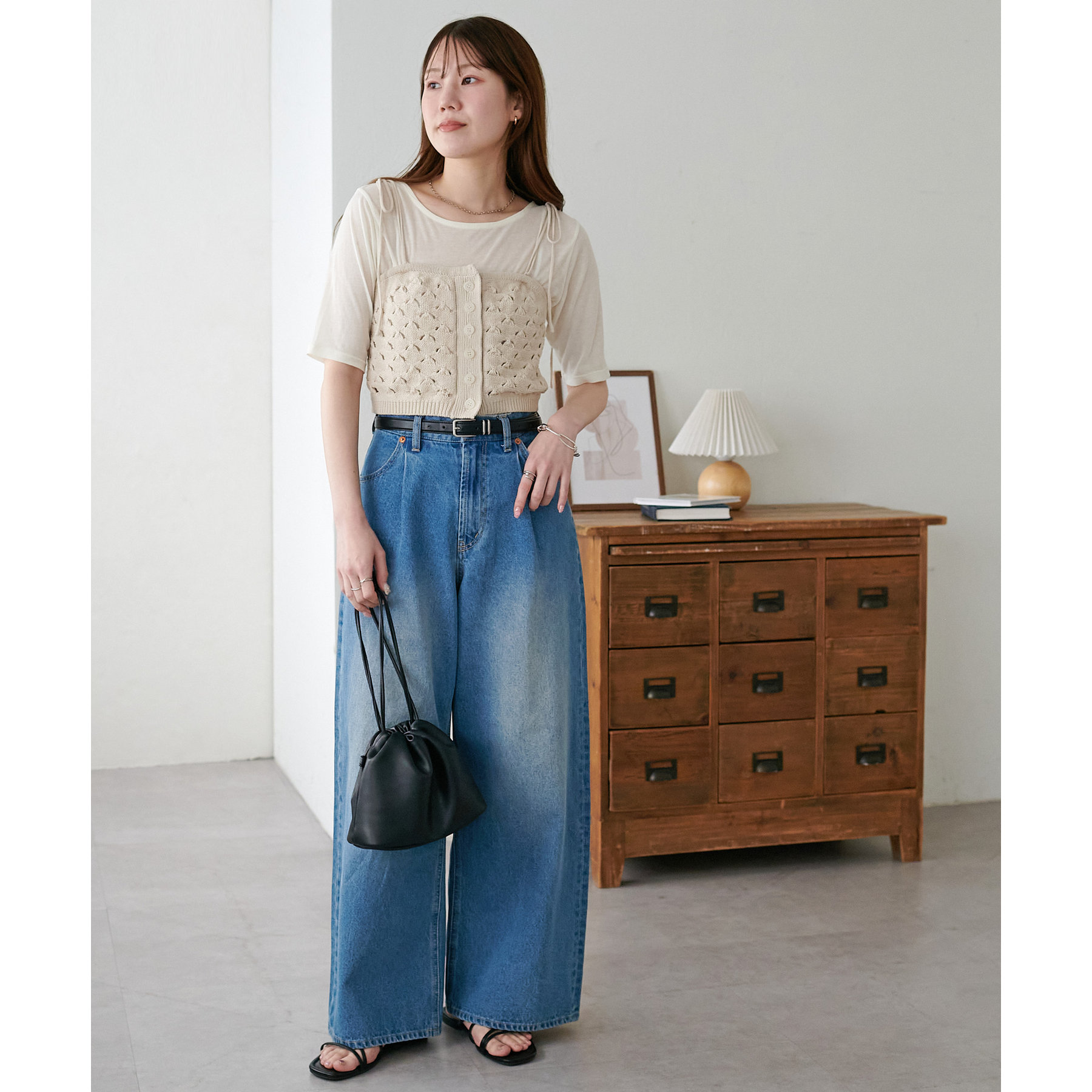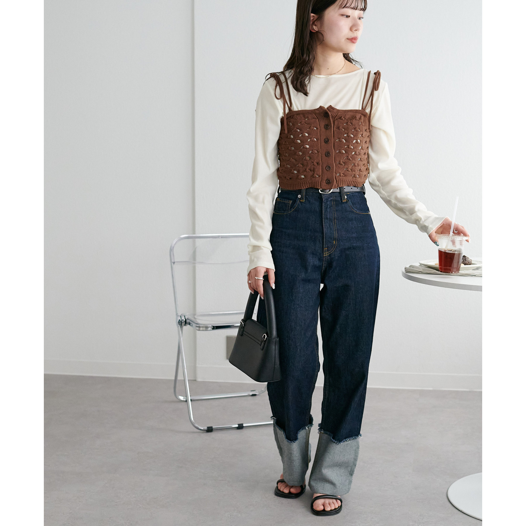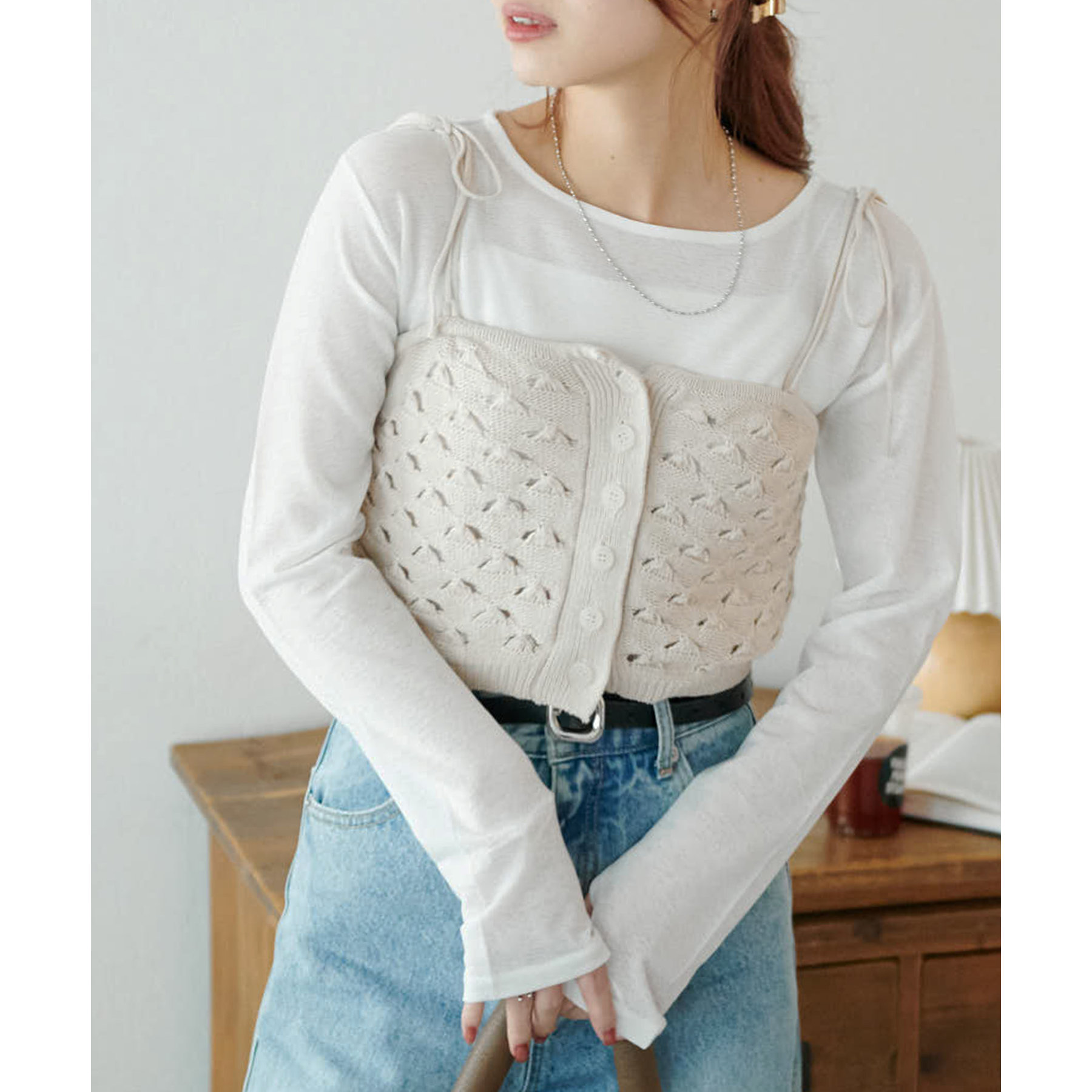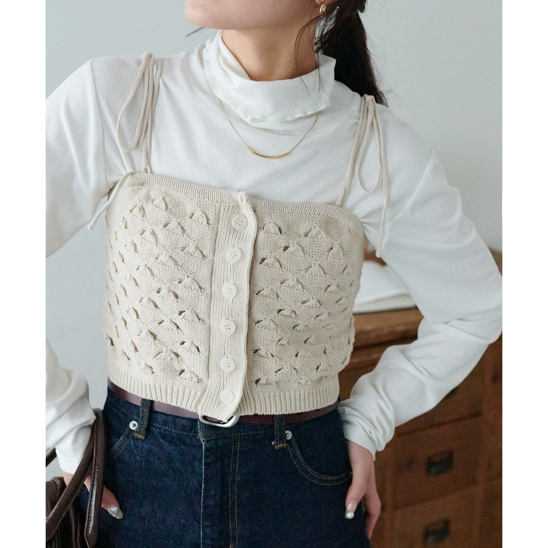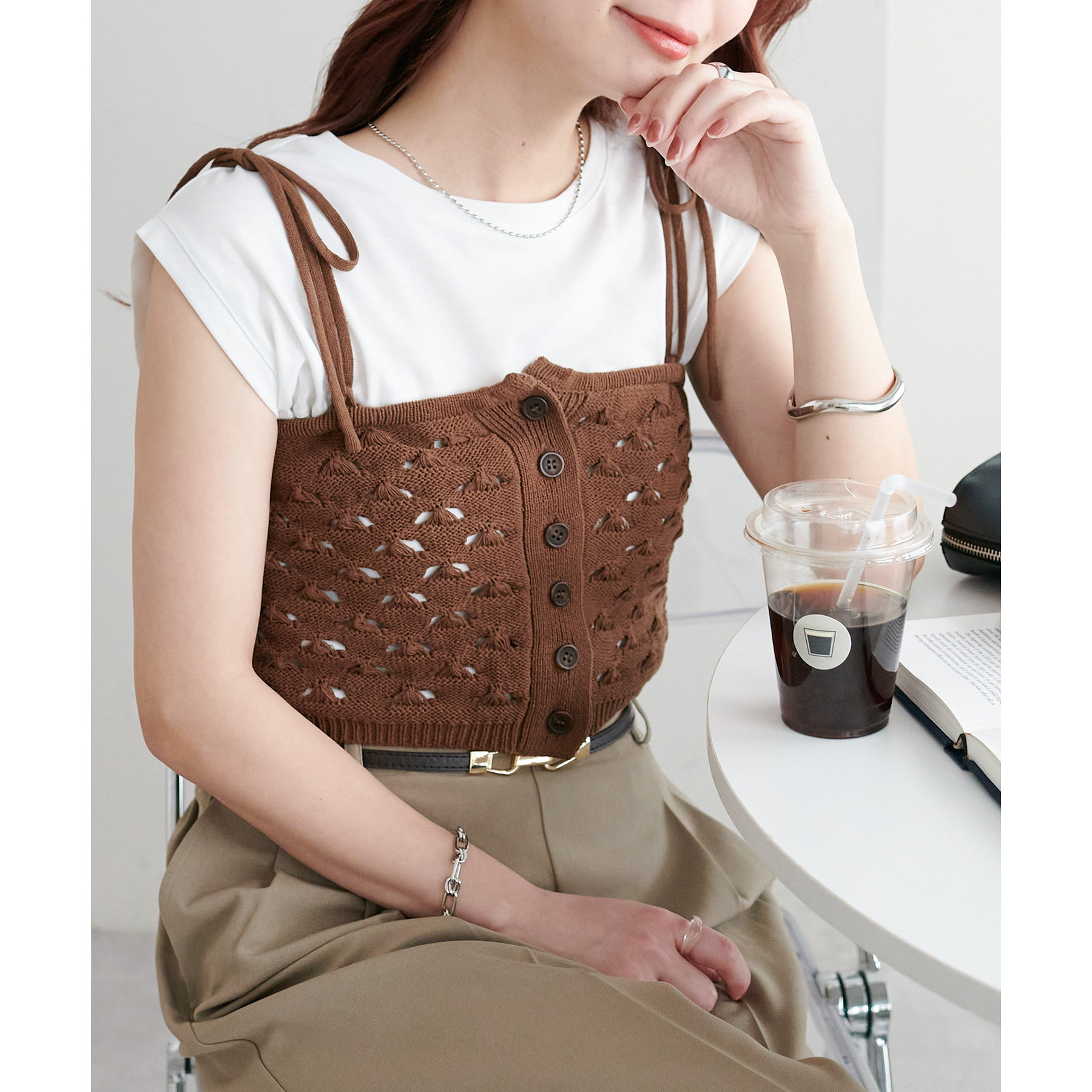 コーデのポイントになるスカシビスチェはコンパクトな着丈なので、スッキリとした印象をプラスします◎