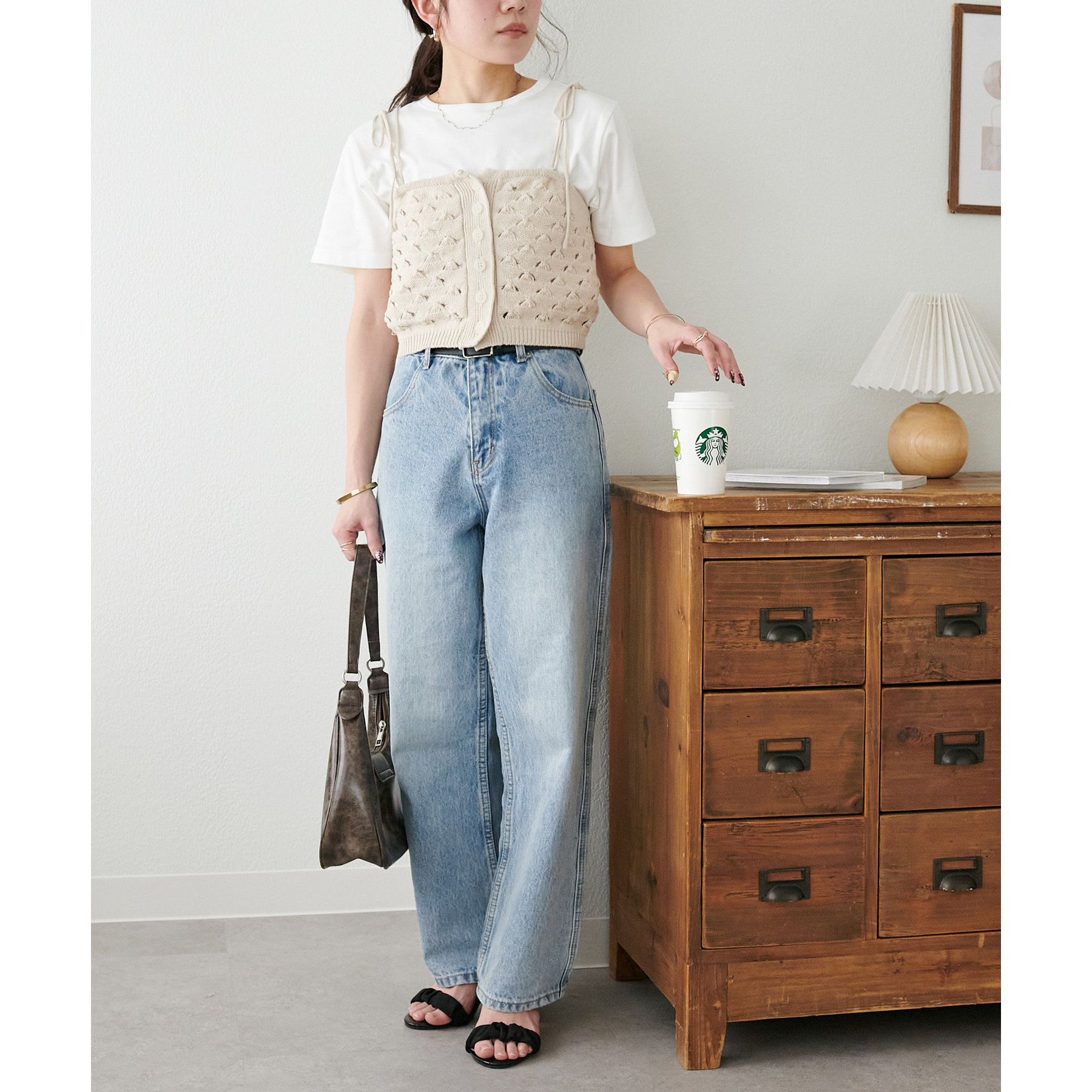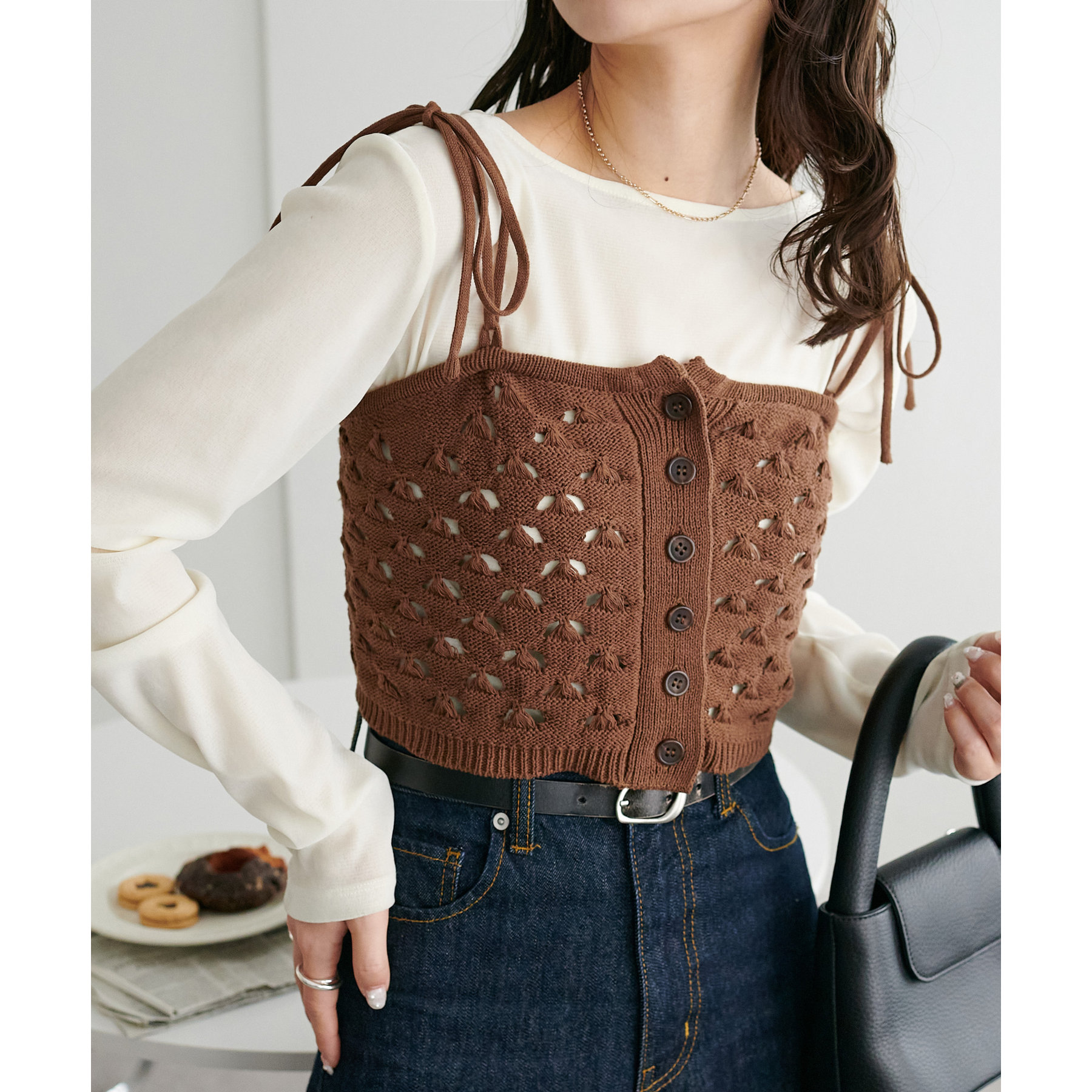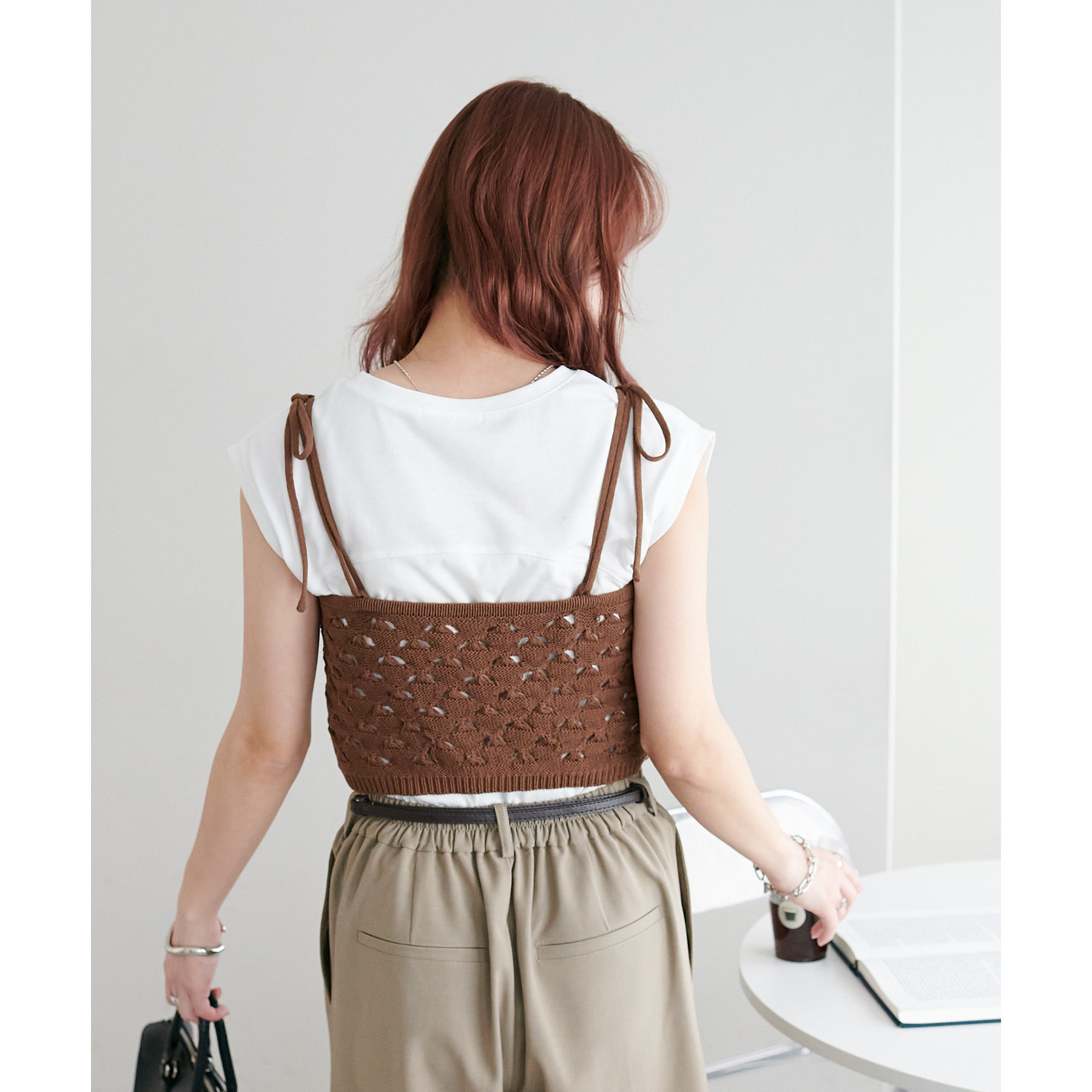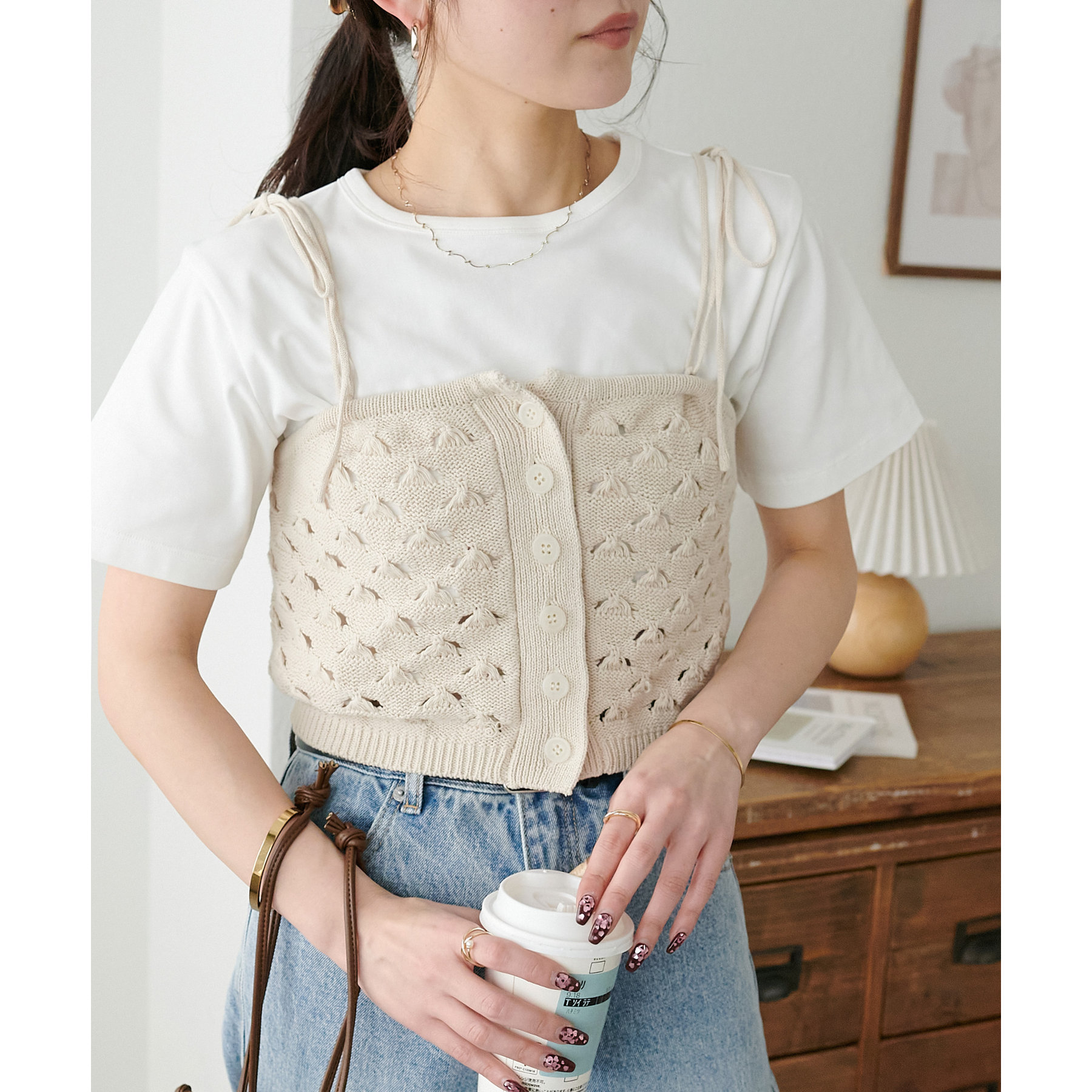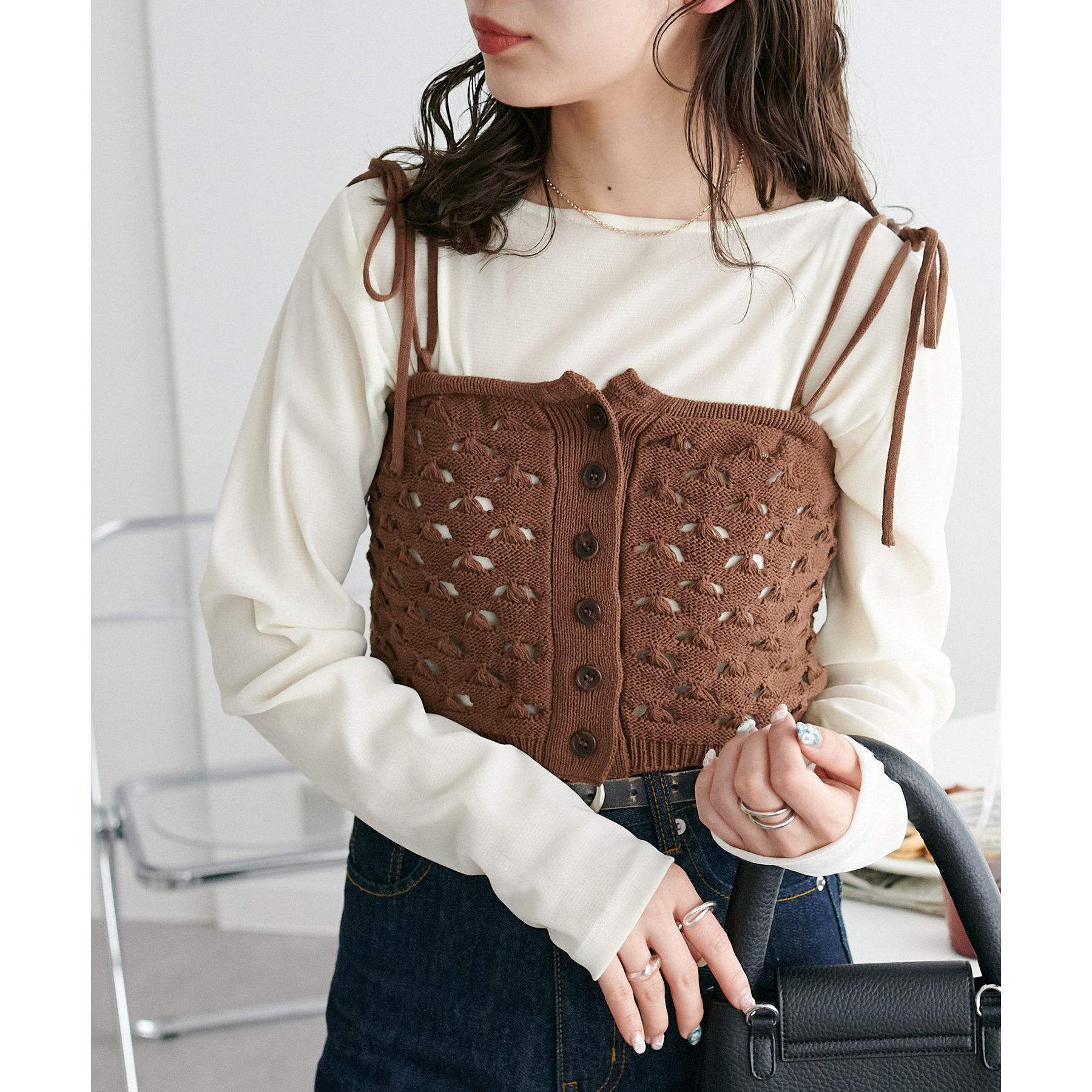 コーデのポイントになるスカシビスチェはコンパクトな着丈なので、スッキリとした印象をプラスします◎