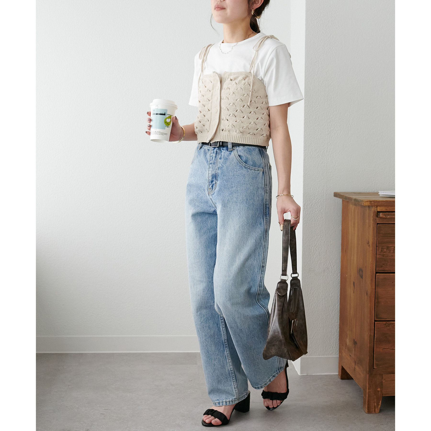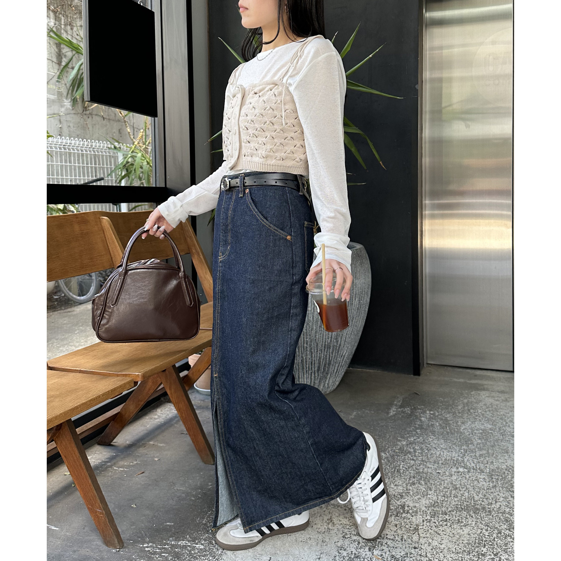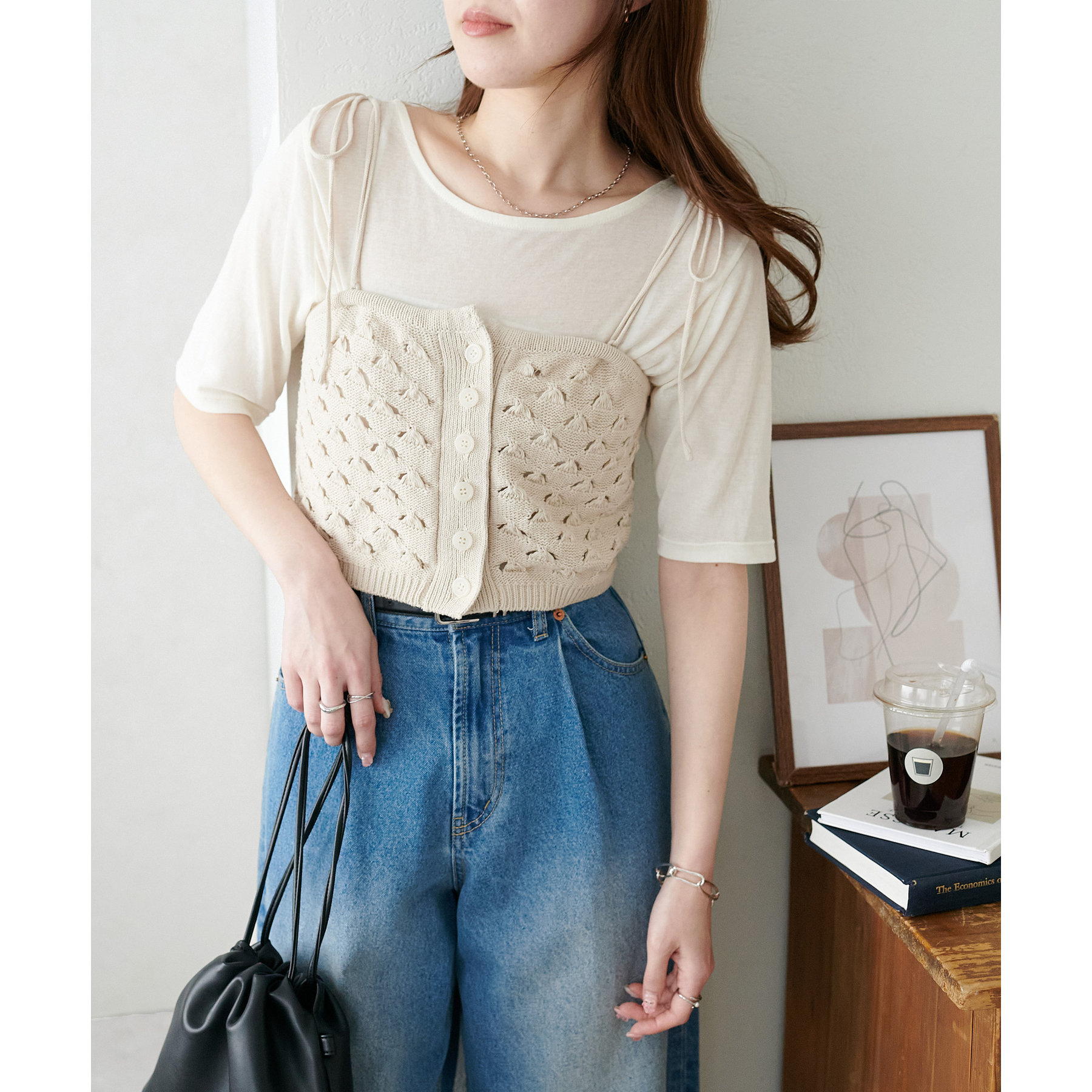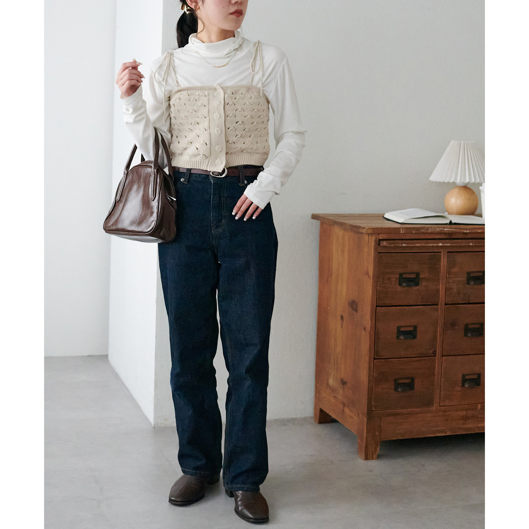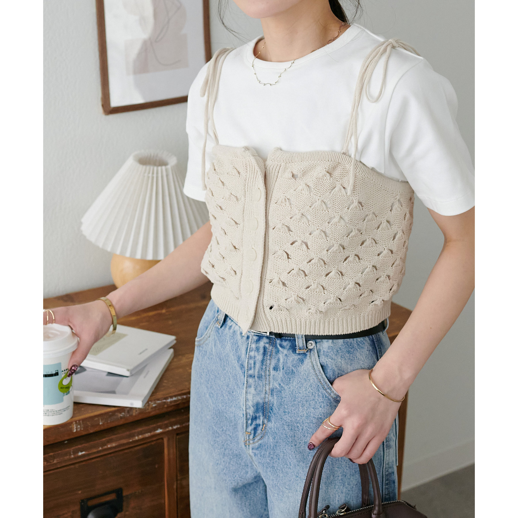 コーデのポイントになるスカシビスチェはコンパクトな着丈なので、スッキリとした印象をプラスします◎